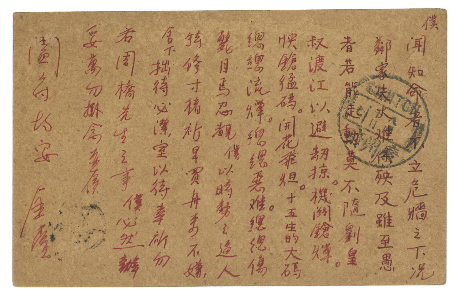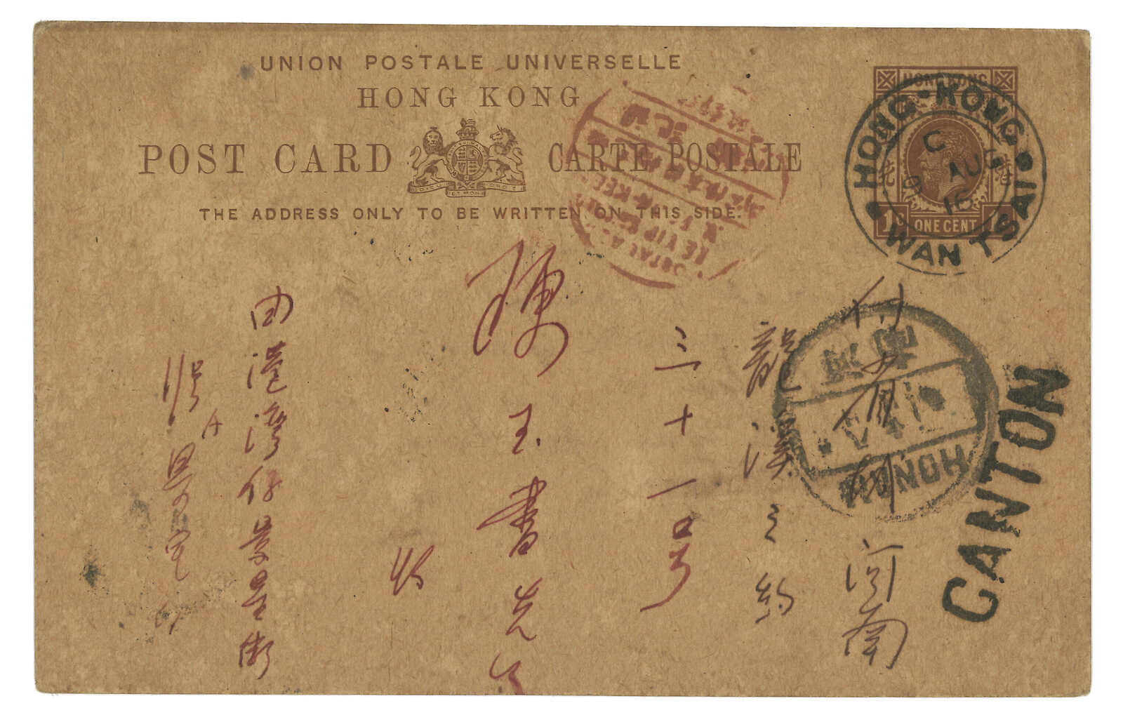 1916 (9 Aug) Hong Kong KGV 1c PSC to Honan, Kwangtung, applied with Fook-Kee postal agent circular seal. Indicia tied by Hong Kong Wan Tsai Webb type A cds. Arrived Honan (10 Aug).
