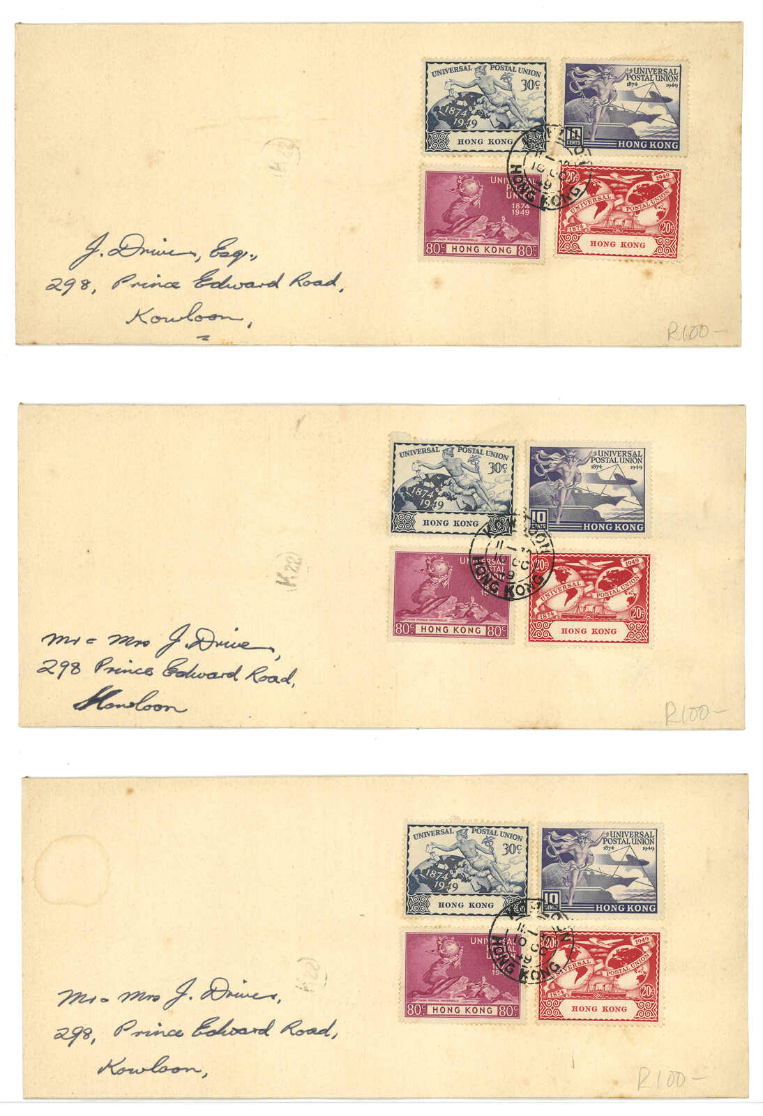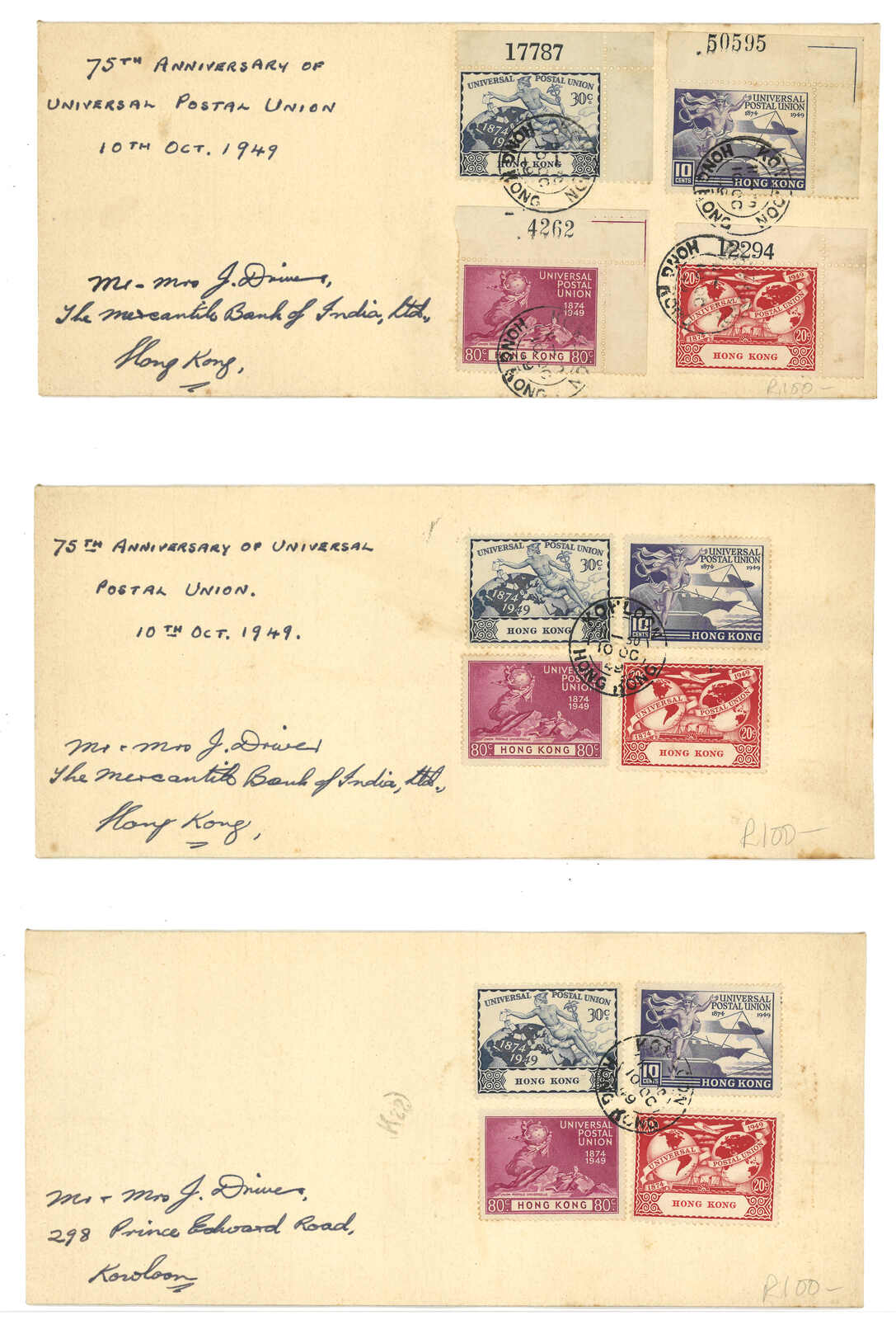 1949 (10 Oct) 75th Anniv of UPU FDC in a group of 6, all tied by Kowloon cds. All from the same sender of the Mercantile Bank of India, Hong Kong.