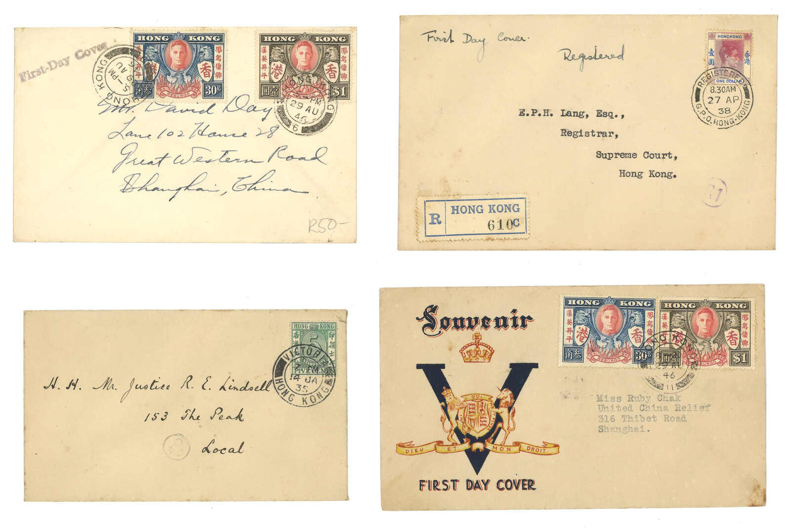 1940至1950年代一組七件香港首日封及實寄封片。首日封包括佐治六世普票及勝利紀念。一件圖片明信片鈐第十二屆工展會宣傳機戳。(Image 1)