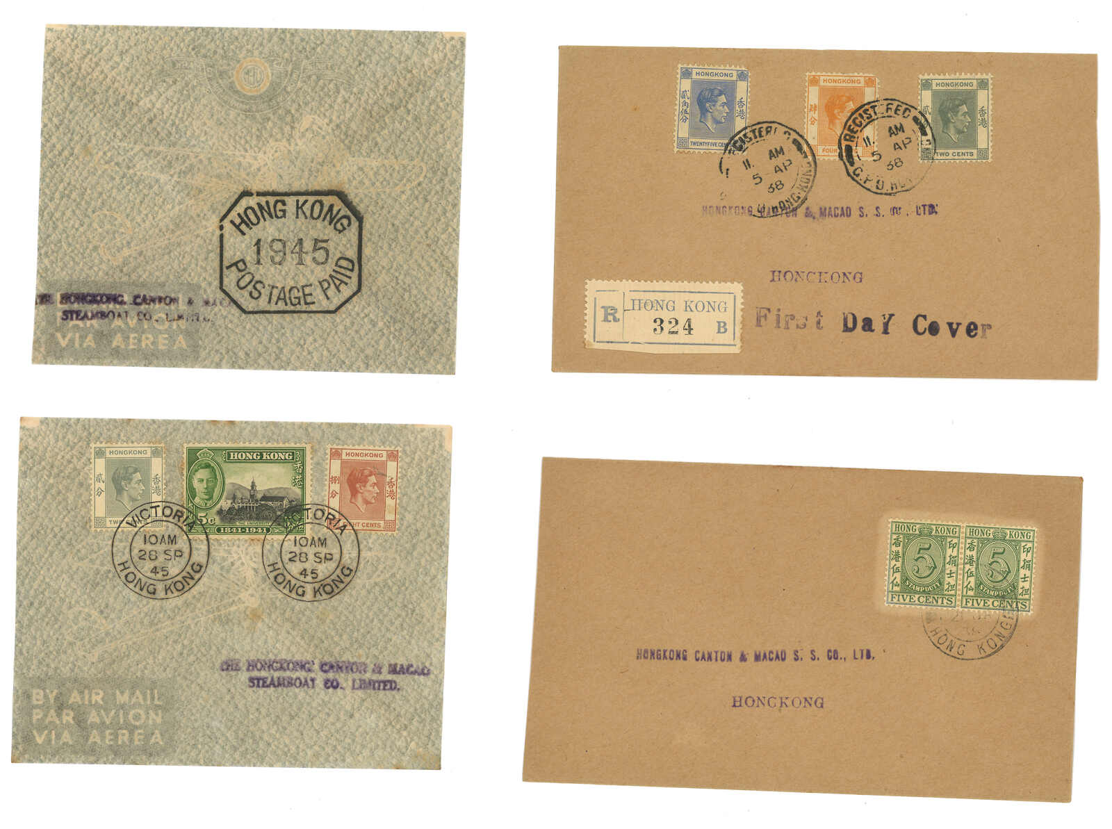 1938 and 1945 a group of 4 Hong Kong, Canton & Macao SS Co covers, applied with postal fiscal stamp, KGVI definitive, Centenary of British Occupation as well as Webb type V “HONG KONG / 1945 / POSTAGE PAID” h.s.