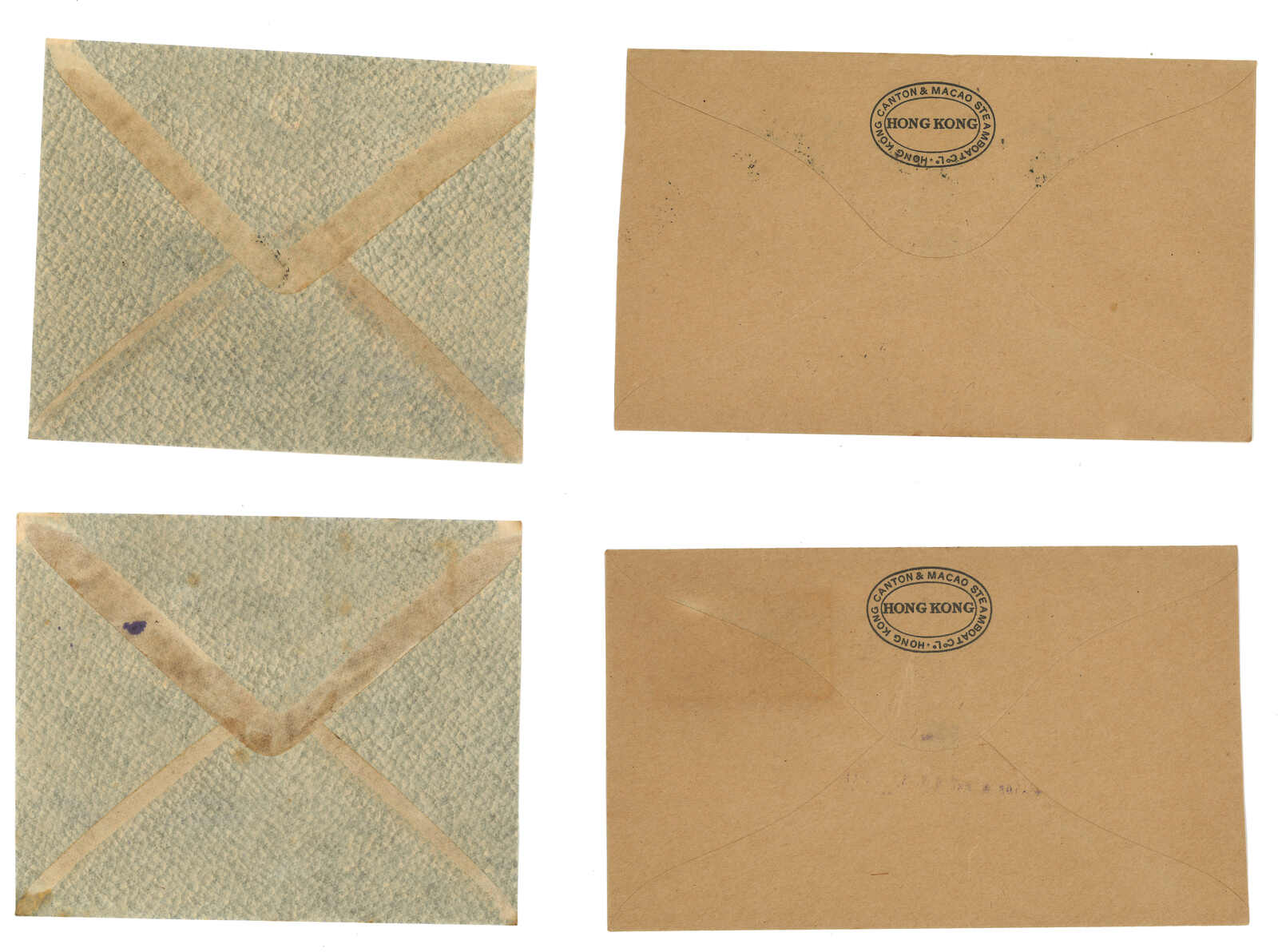 1938及1945年一組四件省港澳輪船公司封,貼用印花稅票改作郵票、佐治六世普票、開埠百週年、Webb V“HONG KONG / 1945 / POSTAGE PAID”戳記。(Image 1)