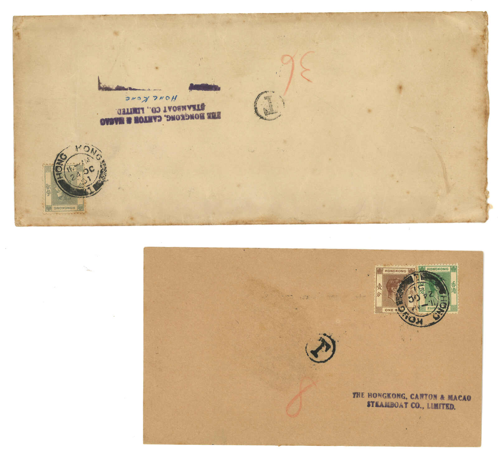 1938及19451951年一對省港澳輪船公司欠資封。一件正貼佐治六世2仙,背貼欠資票合68仙。另一件正貼1仙 + 5仙,背貼欠資票8仙。(Image 1)