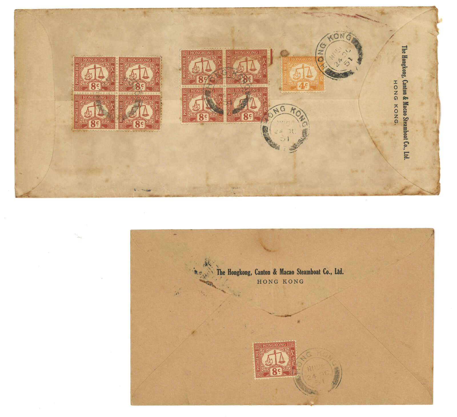 1951 a pair of Hong Kong, Canton & Macao Steamboat Co taxed covers. One f.w. KGVI 2c on front with postage due issue in total of 68c on reverse. Another f.w. 1c + 5c on front and postage due 8c on reverse. h.s.