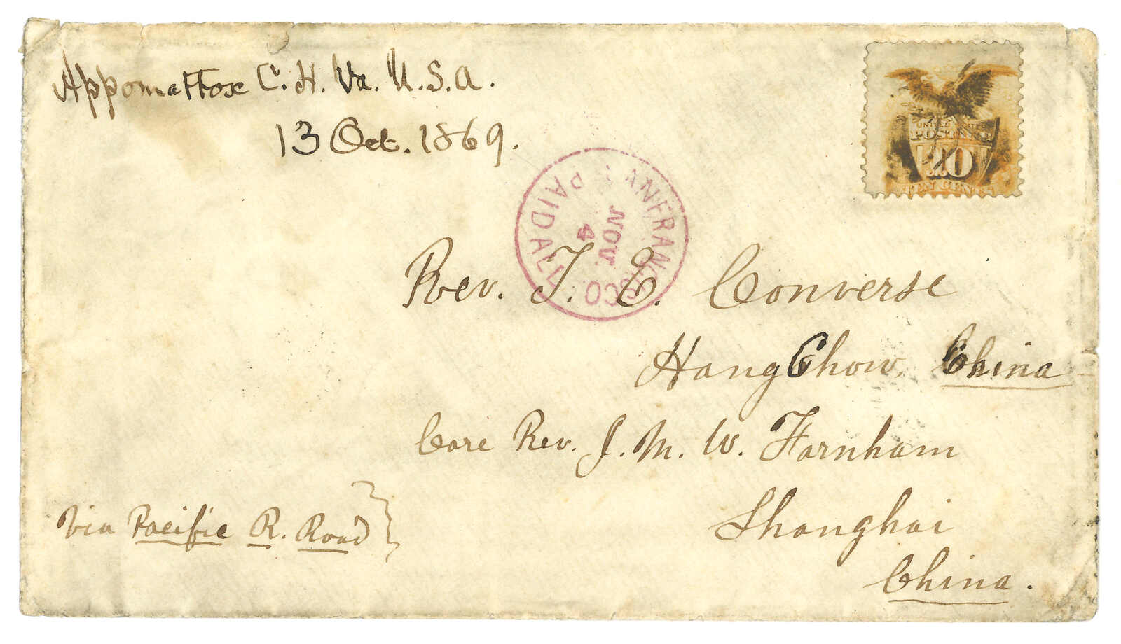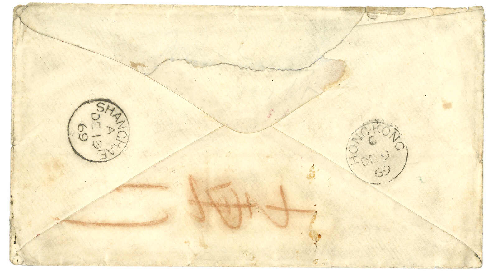 1869 USA (4 Nov) to Hong Kong, sent “via Pacific R Road”, f.w. Shield and Eagle 10c, alongside with San Francisco Paid All ccds. Transit Shanghai BPO (19 Dec). Arrived Hong Kong (9 Dec). Example of 10c rate under 1867 Hong
