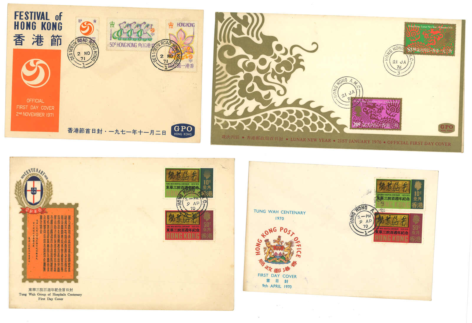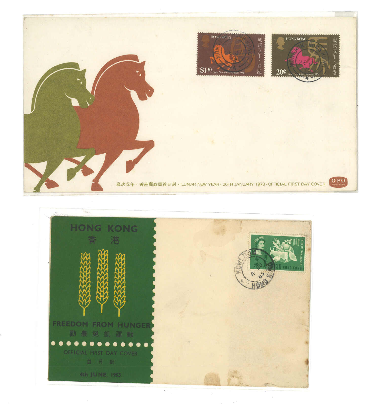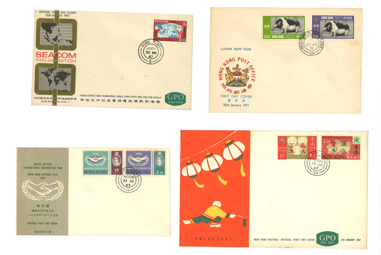 1960-1970s a group of about 32 Hong Kong FDCs. More outstanding items include International Cooperation Year, Freedom From Hunger and several lunar year issues.