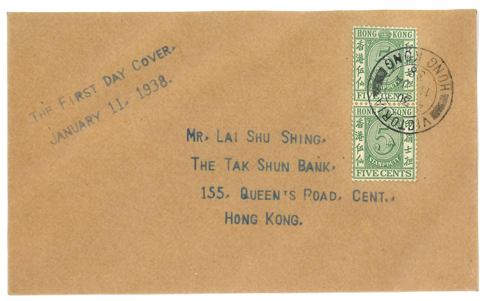 1938.1.11 香港印花稅票改作郵票第四組5仙首日封(楊目F12),貼直雙連,銷維多利亞日戳。(Image 1)
