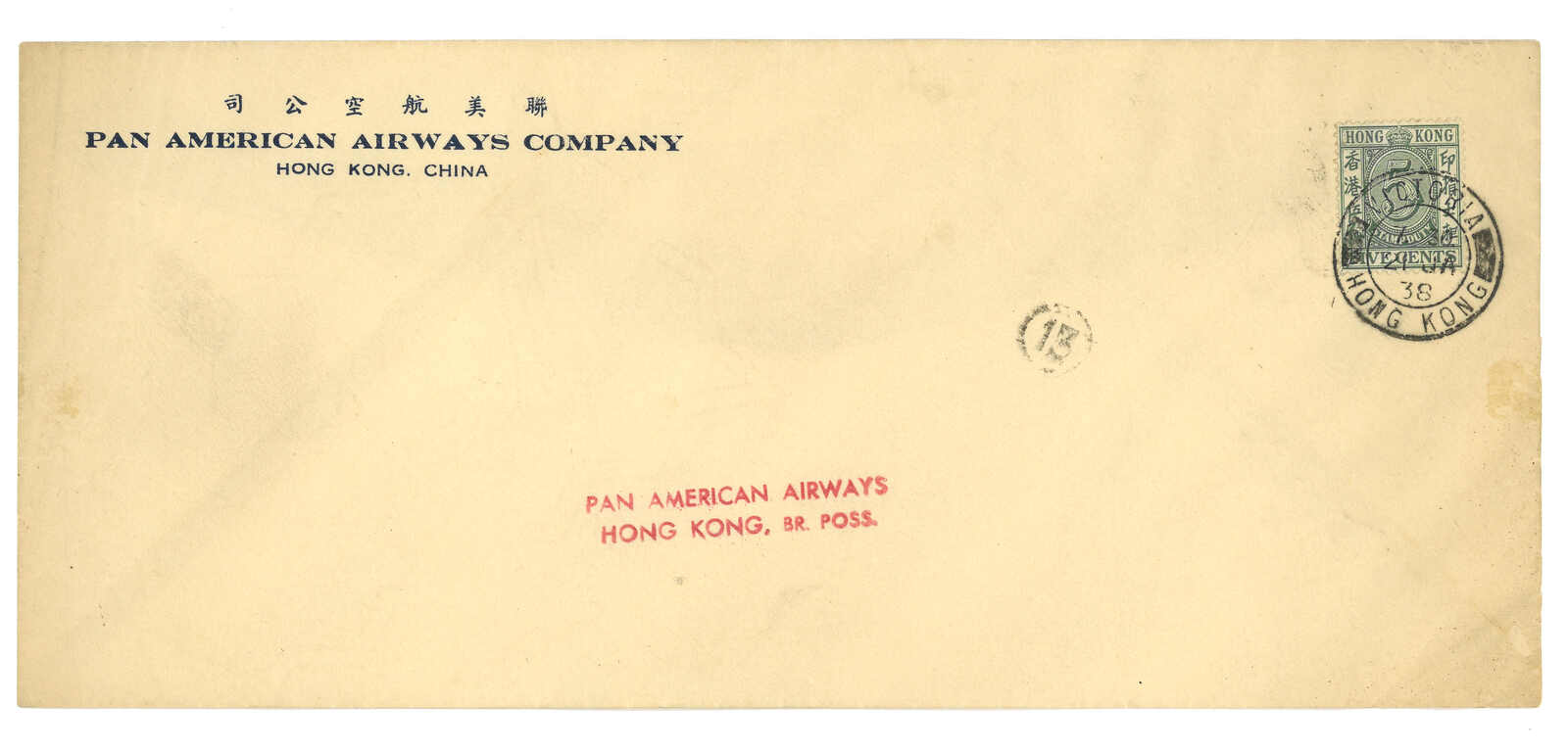 1938 (21 Jan) Pan American Airways Co cover, f.w. Hong Kong postal fiscal 4th series 5c (Yang F12), tied by Webb type O Victoria / Hong Kong cds. This type of cds was used between 1934 and 1938, then reintroduced in 1941. Late