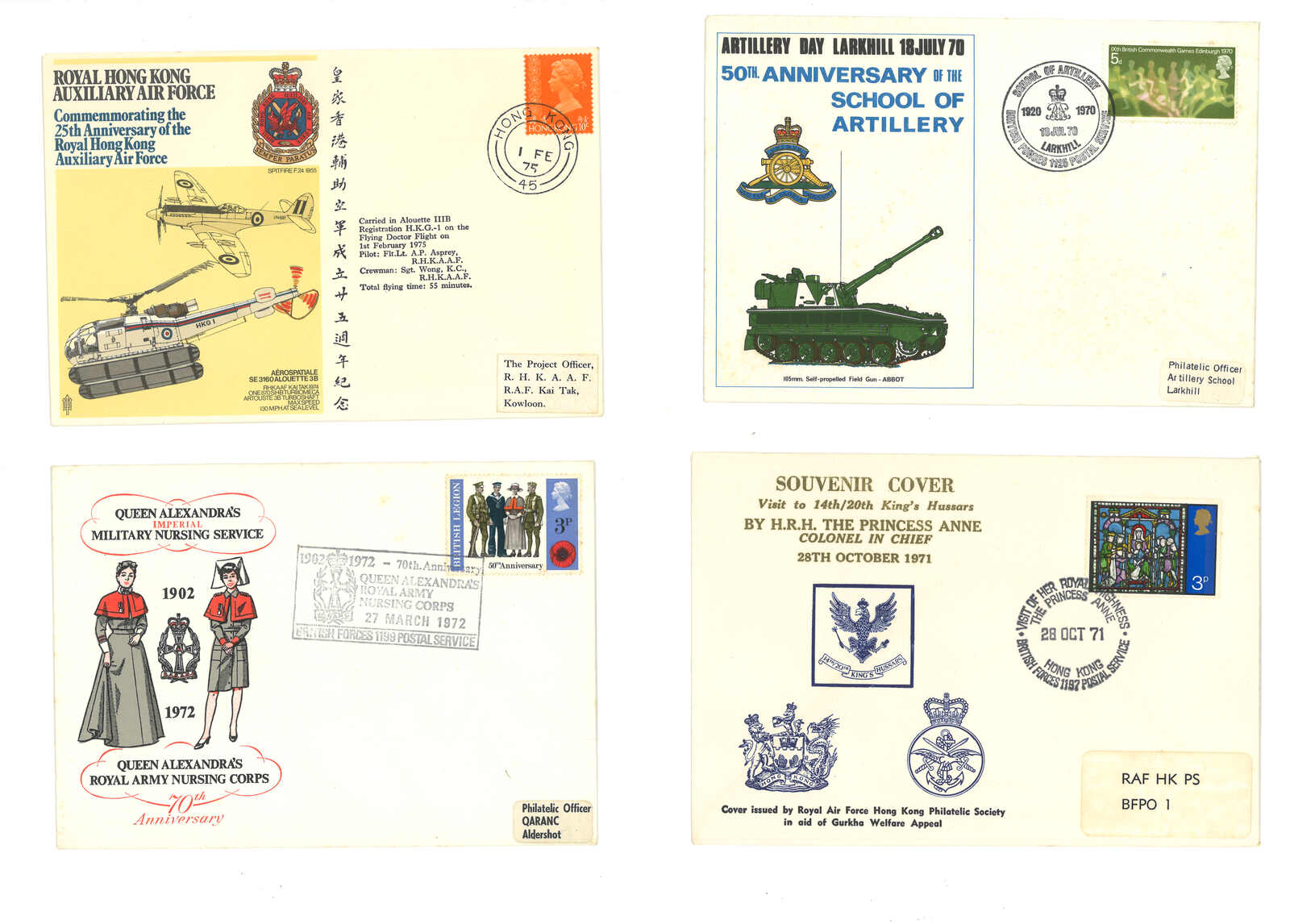 1970-1980s a group of 5 Hong Kong military postcard and military theme commemorative covers. One card applied with British Force PO No. 4 cds. Other commemorative covers include 5th Anniv of Auxiliary Air Force etc.