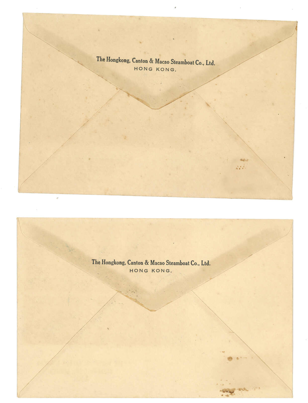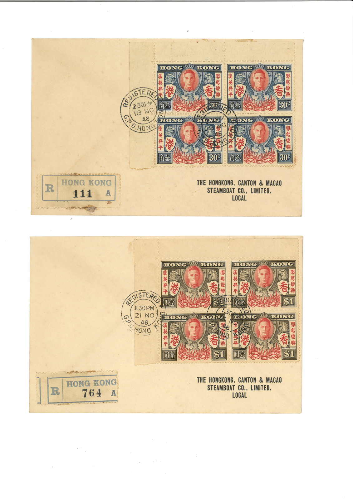1946 (18 / 21 Nov) a pair of Hong Kong, Canton & Macao Steamboat Co. covers f.w. Victory issue 30c and $1 block of 4 with top left corner margin (Yang C15-16) respectively, tied by Hong Kong GPO registered cds.