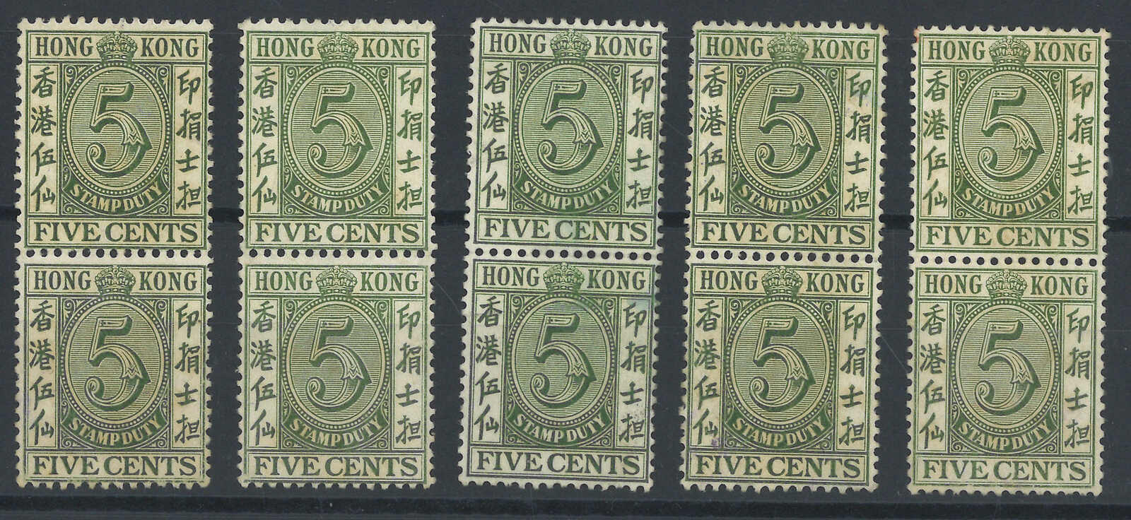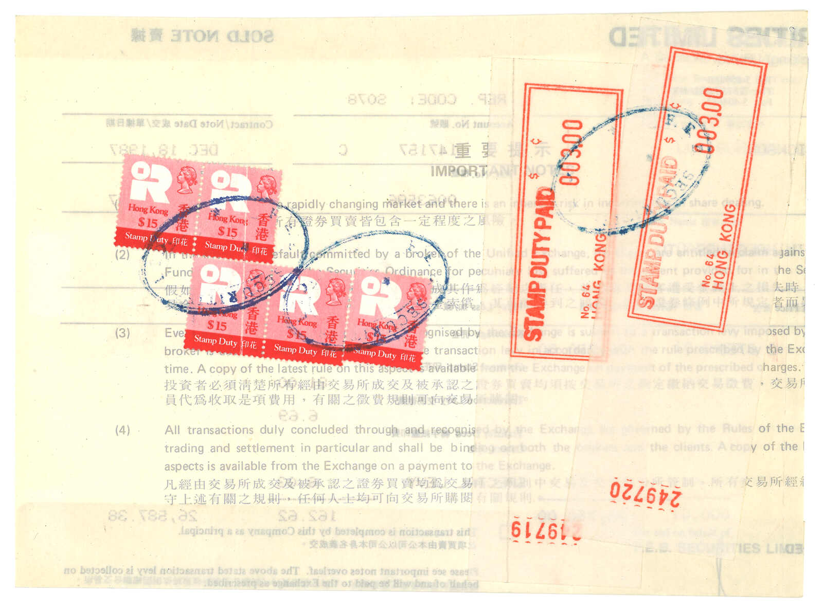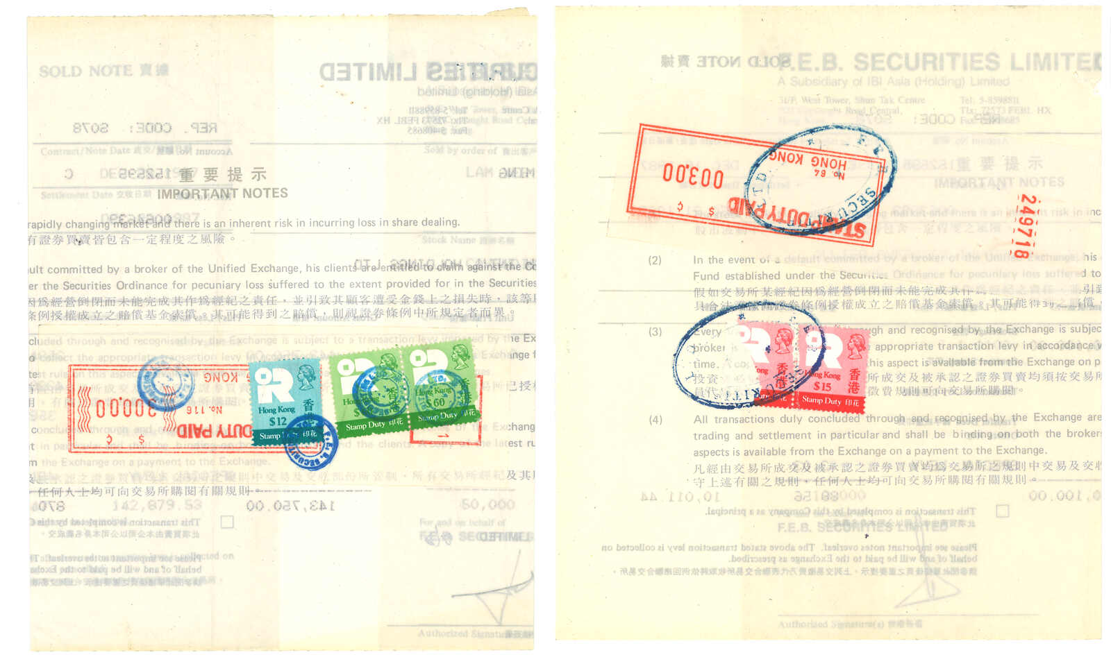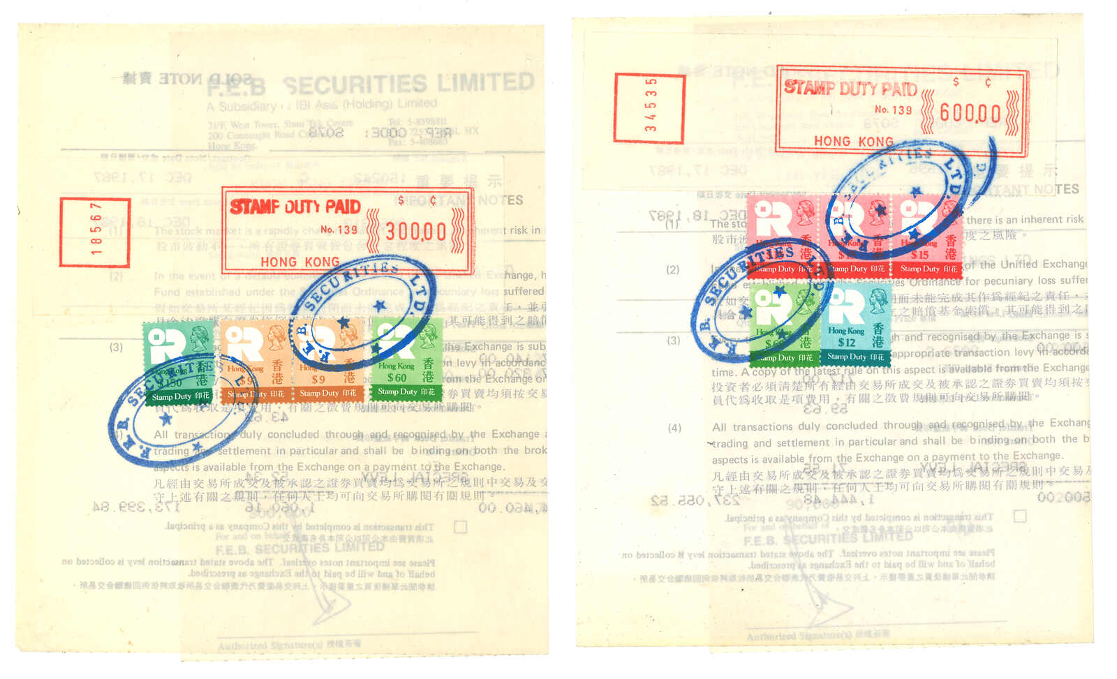 1980s a group of 5 receipts f.w. Hong Kong revenue stamps, appplied with “STAMP DUTY PAID’ meter stamp.