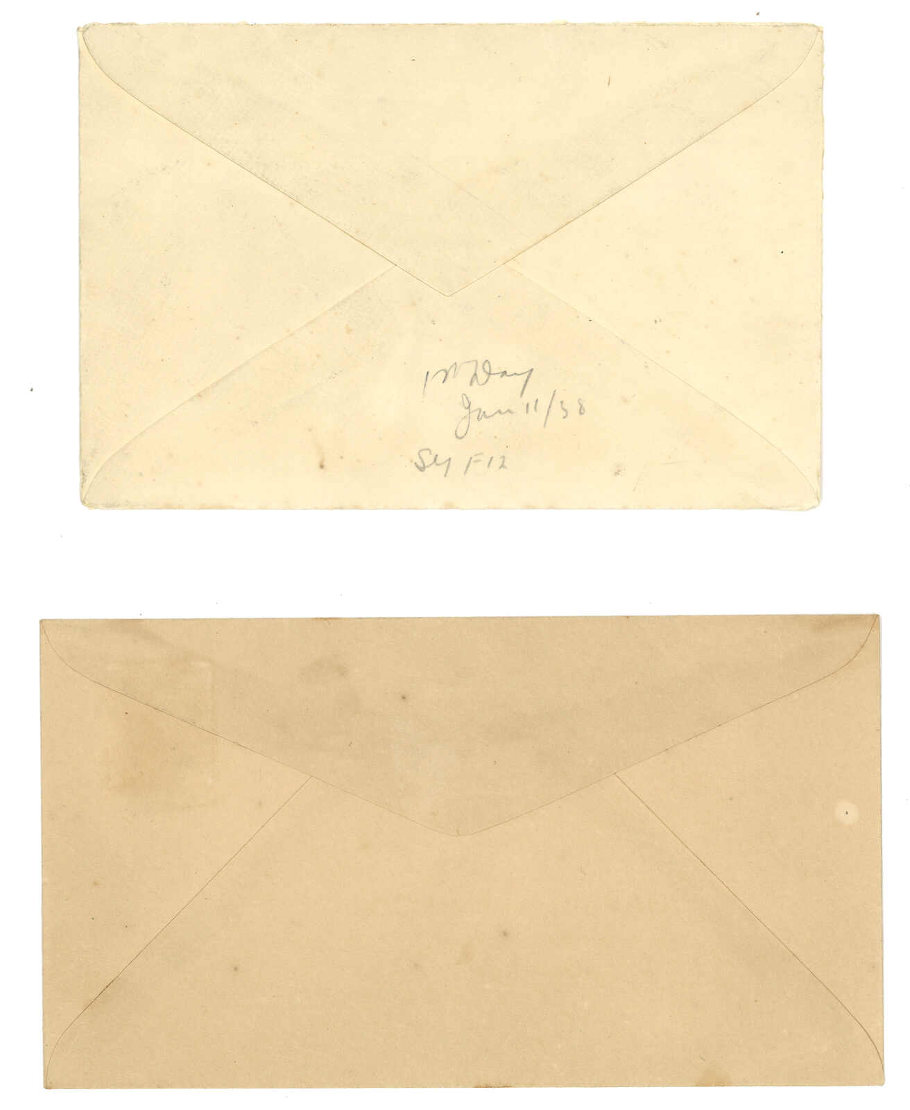 1938年香港印花稅票改作郵票第四組(楊目F12)集藏,包括一件首日封,一件尾日封及五對直雙連新。(Image 1)