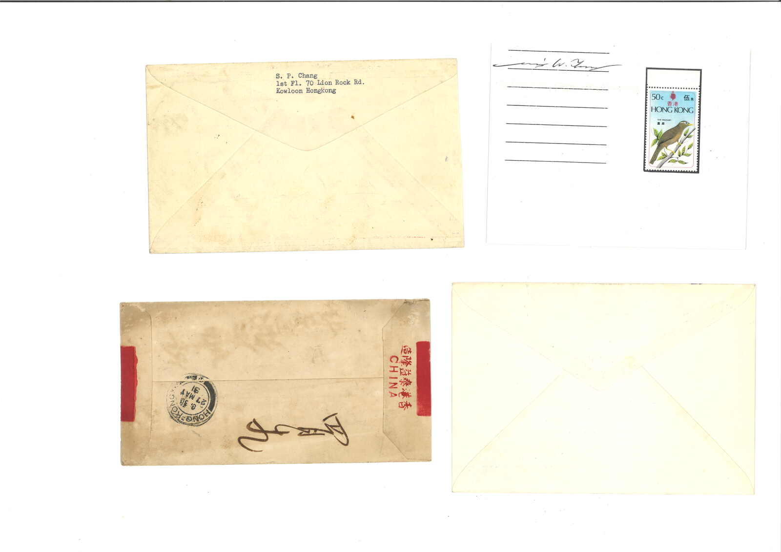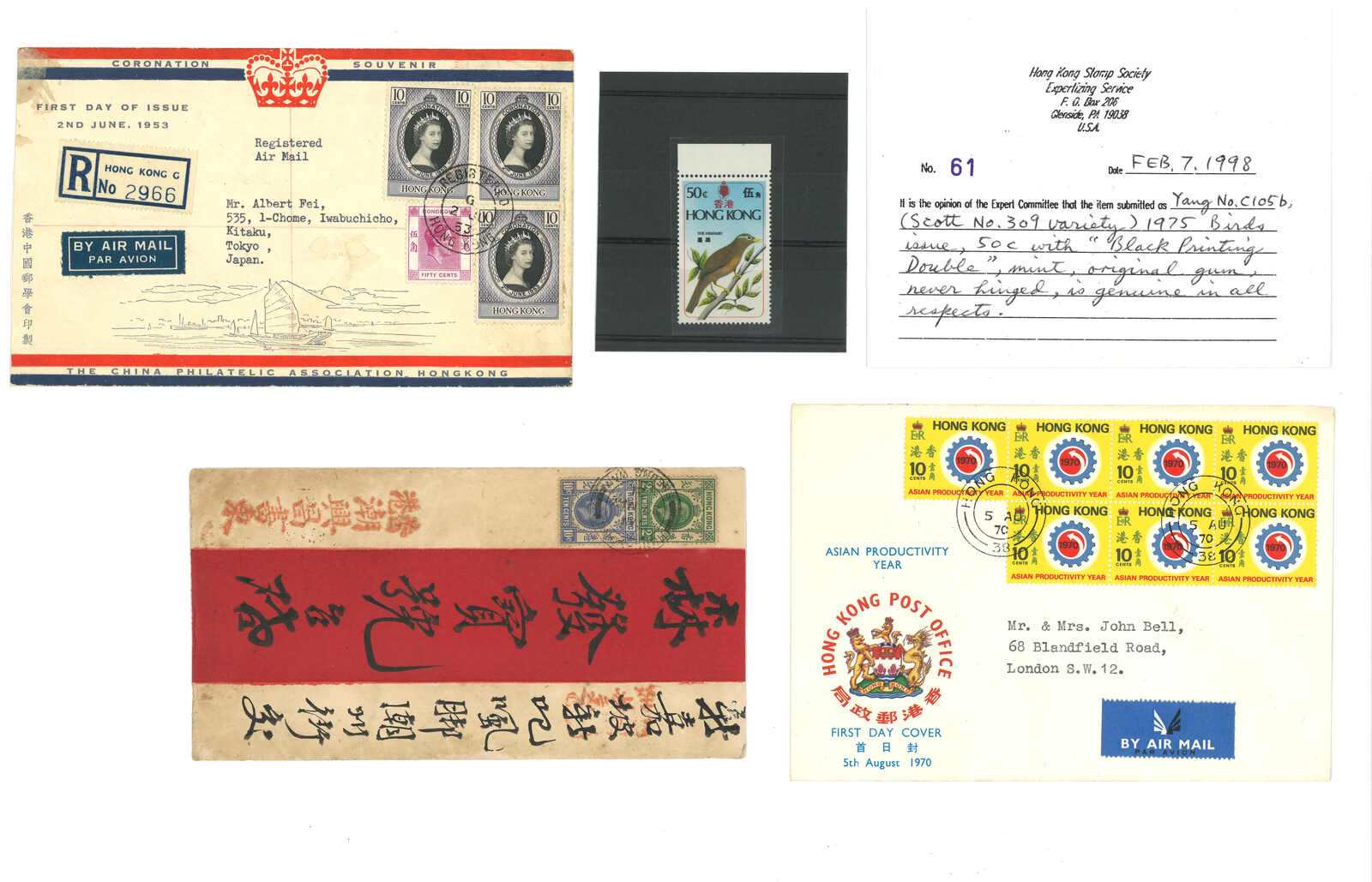 An assorted group of Hong Kong stamps and postal histories. More outstanding items include 1975 Hong Kong Birds 50c with double printing variety (Yang C105b), red band cover from Sheung Wan to China, Coiling Dragon and HK QV