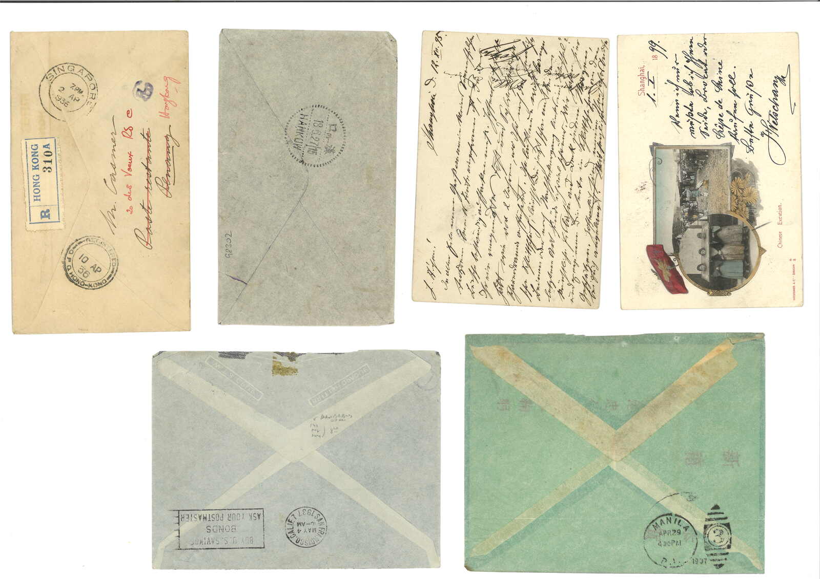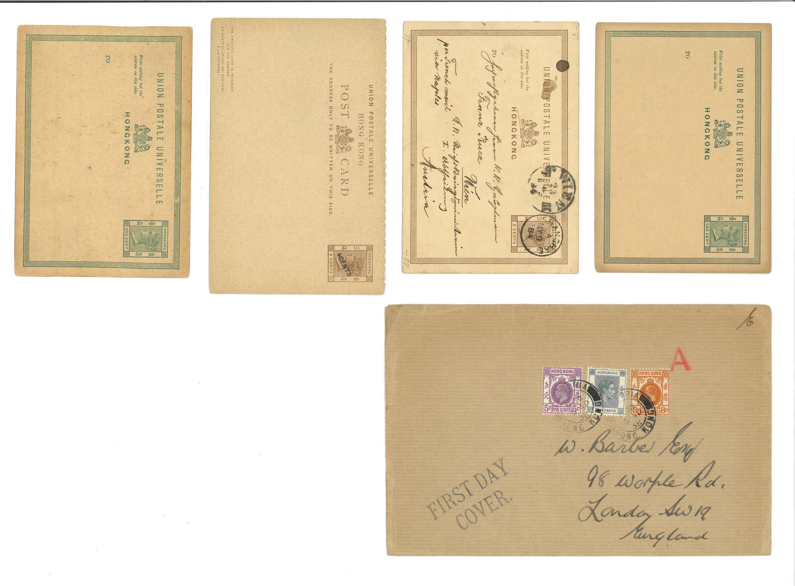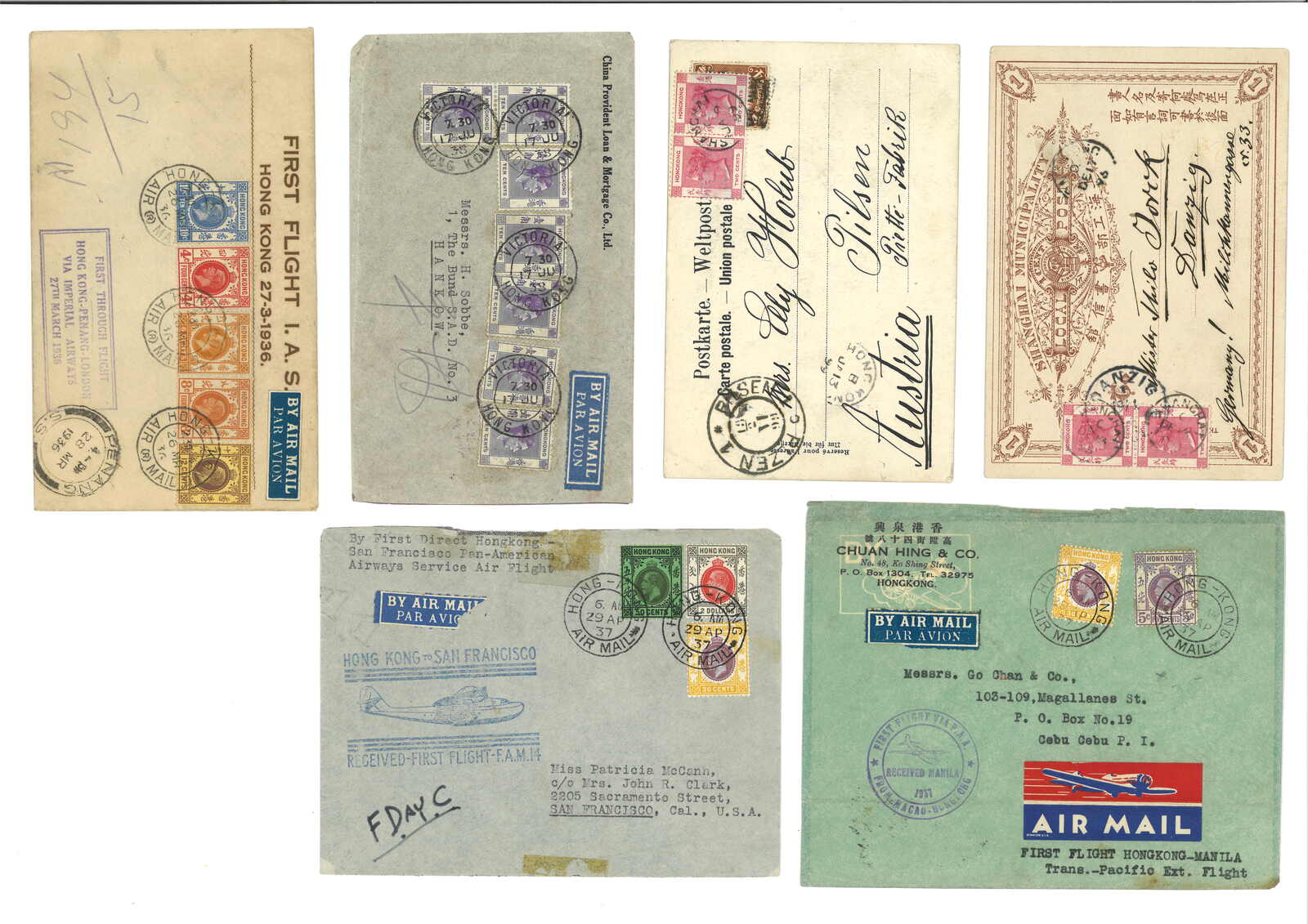 combination PPC, 1936 (26 Mar) HK-Penang-London FFC, 1937 (29 Apr) Hong Kong-USA FFC, several FDCs etc. Please view.