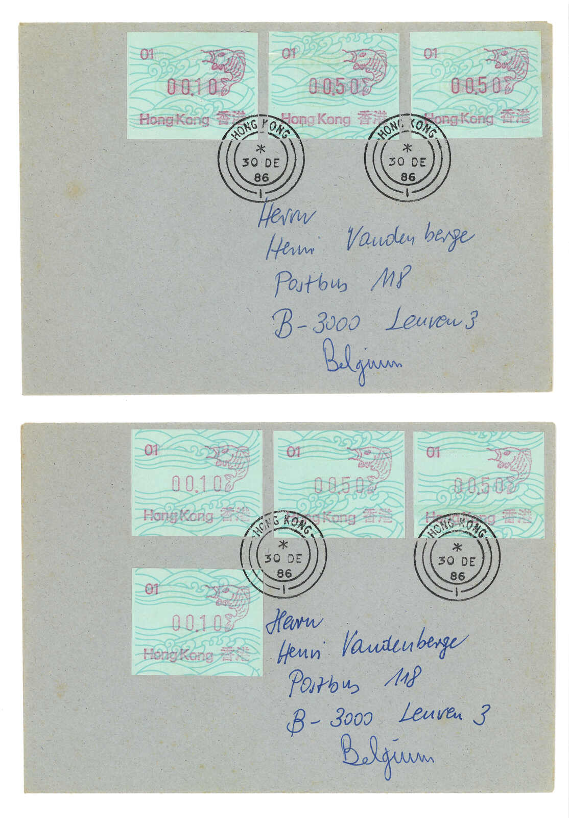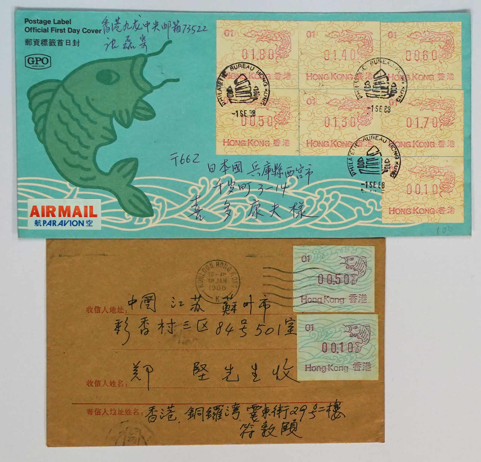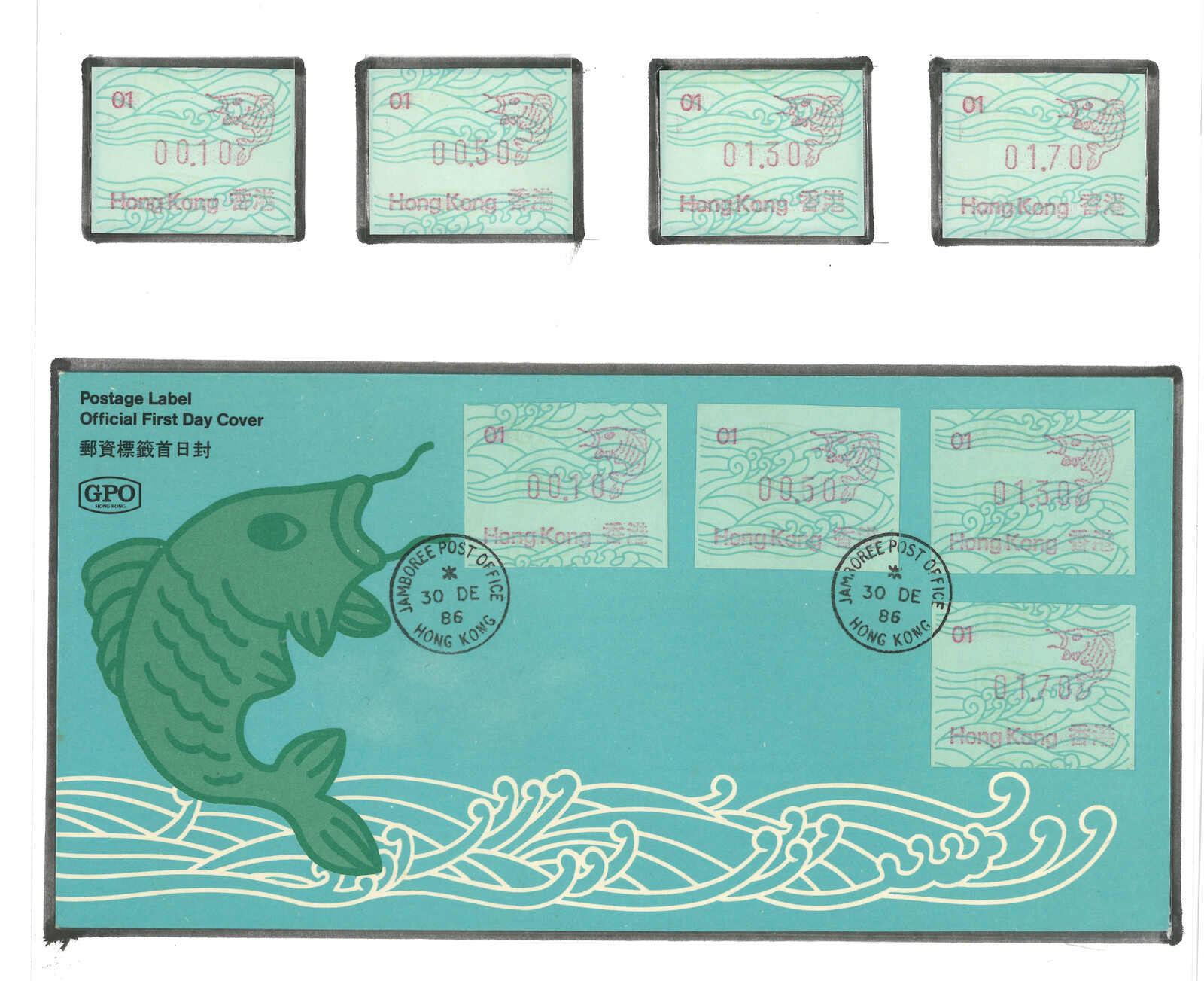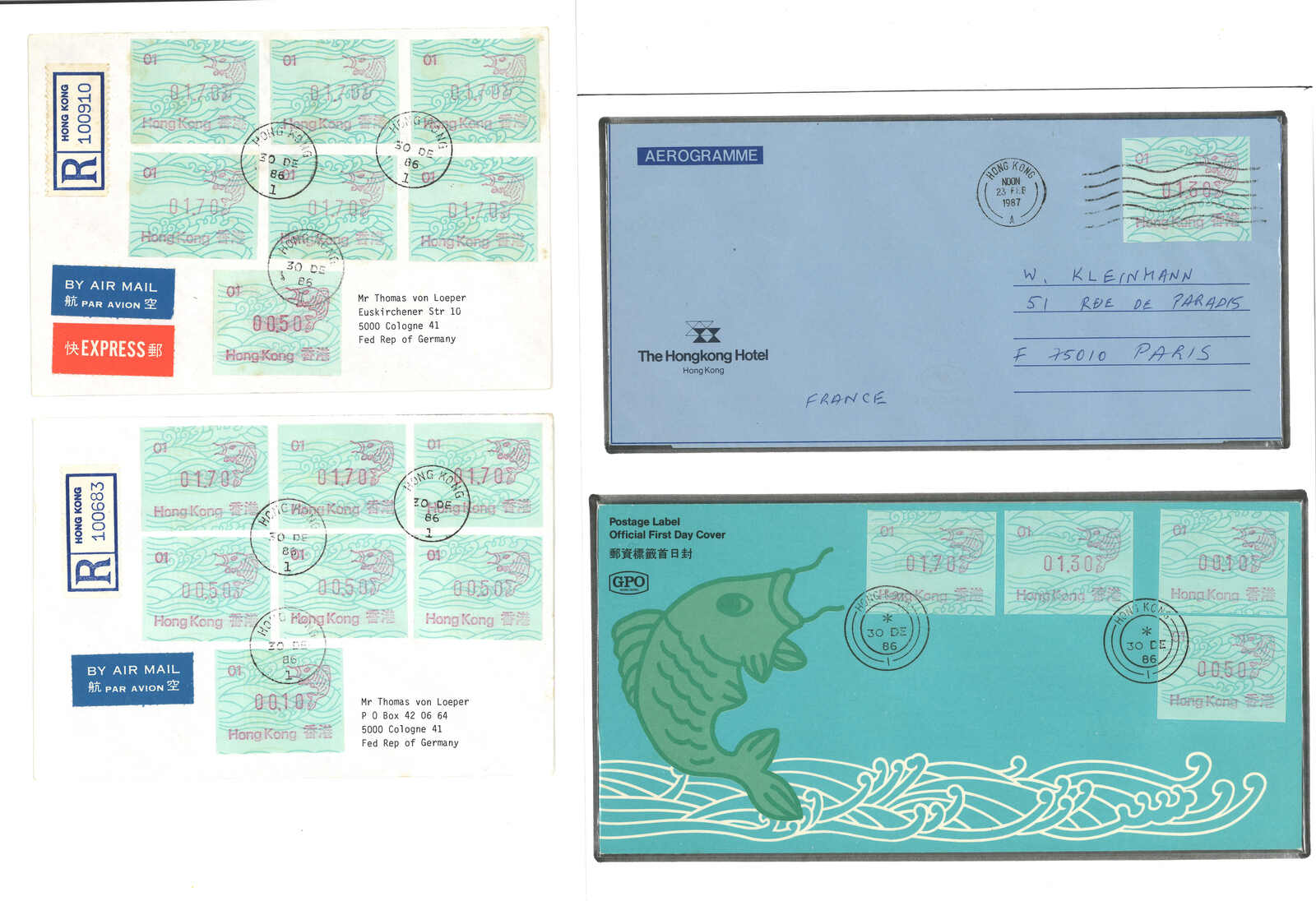 1986 a collection of Hong Kong Carp ATM stamps and covers, containing a mint complete set, several FDC and commerically used covers. It is the first ATM stamp issued in Hong Kong. Historical.