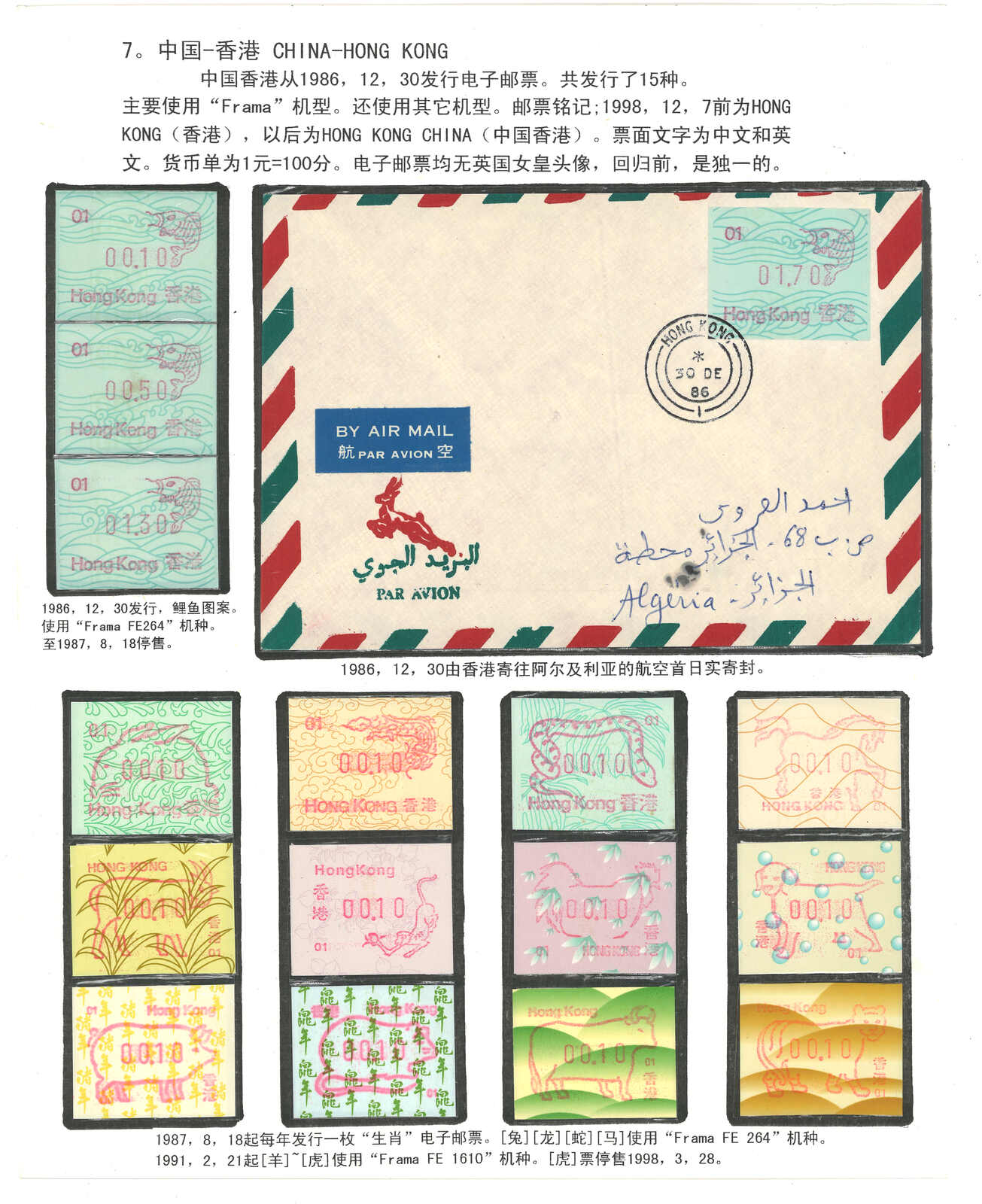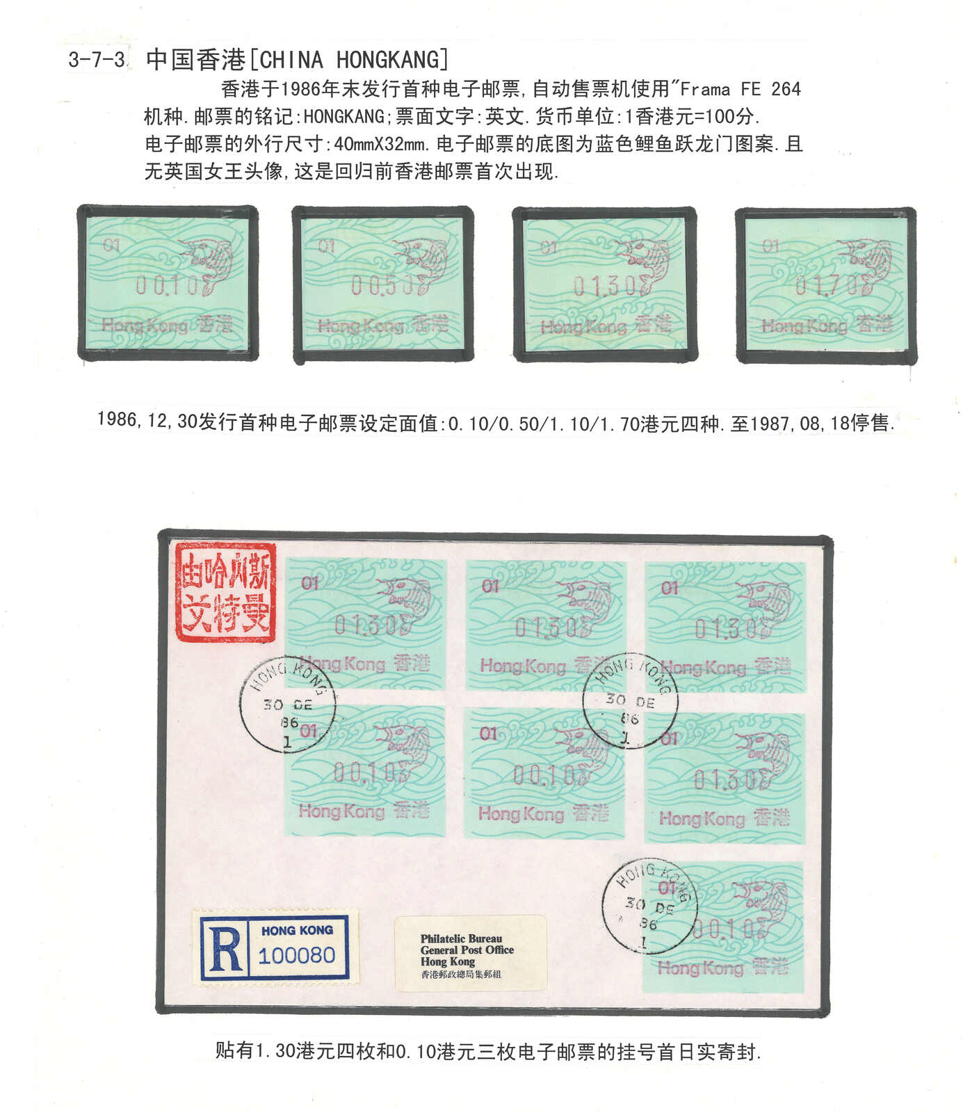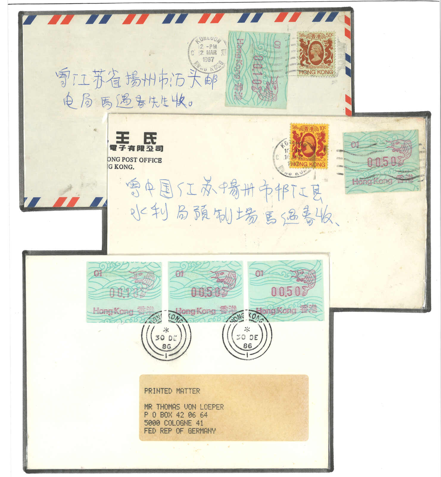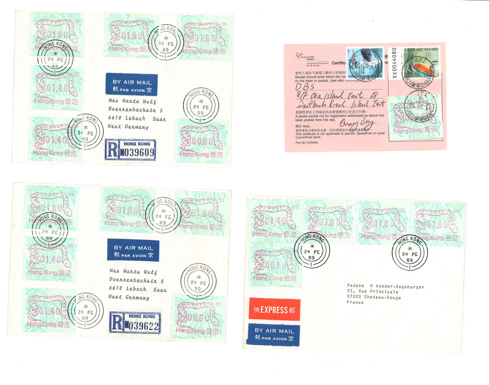 1986 a collection of Hong Kong Carp ATM stamps and covers, containing a mint complete set, several FDC and commerically used covers. It is the first ATM stamp issued in Hong Kong. Historical.