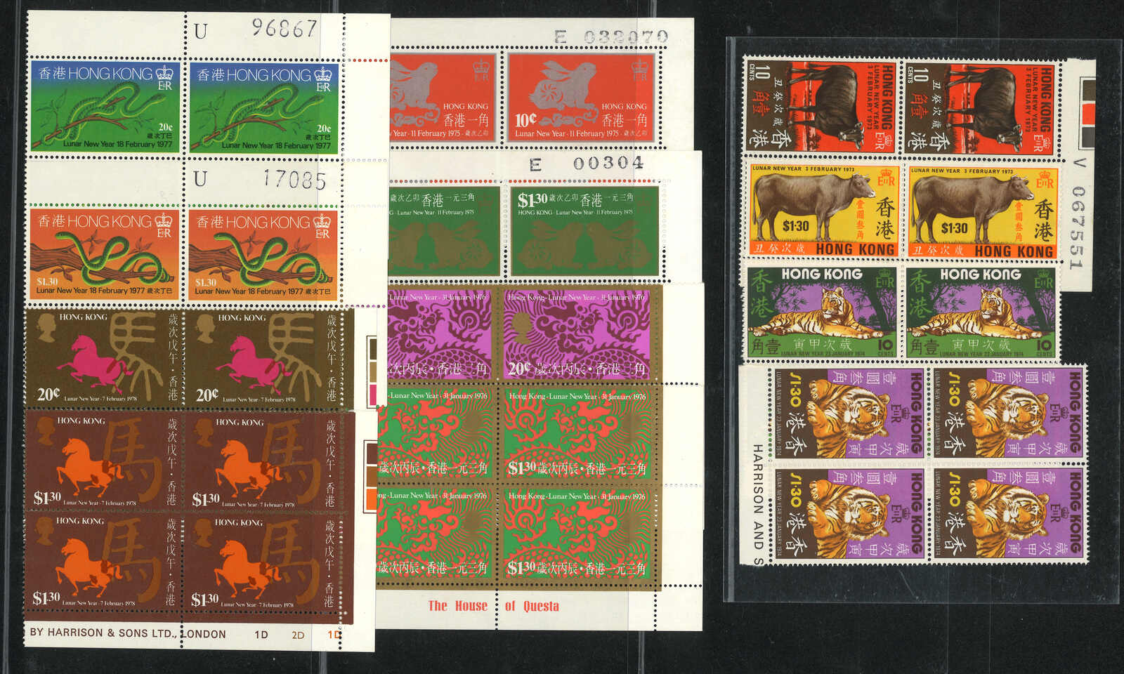 1967-1978 Hong Kong 1st round lunar year issues in block of 4 set, with margin, from year of ram to the year fhorse. MNH. Very Fine.