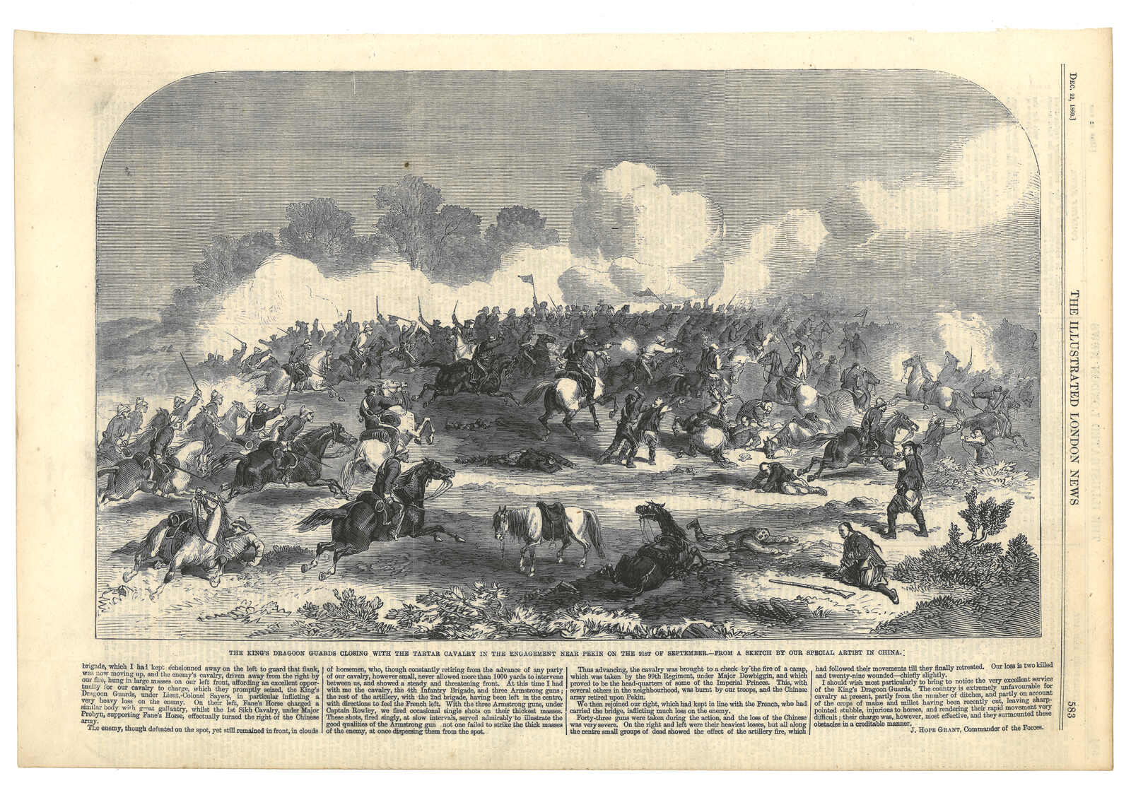1707 image1860 (22 Dec) The Illustrated London News p.583 and 584. With image of “The King’s Dragoon Guards with the Tartar Cavalry in the Engagement near Pekin of the 21st of September. From a Sketch by our Special Artist in China”. Historical. (size 27 x 40cm).