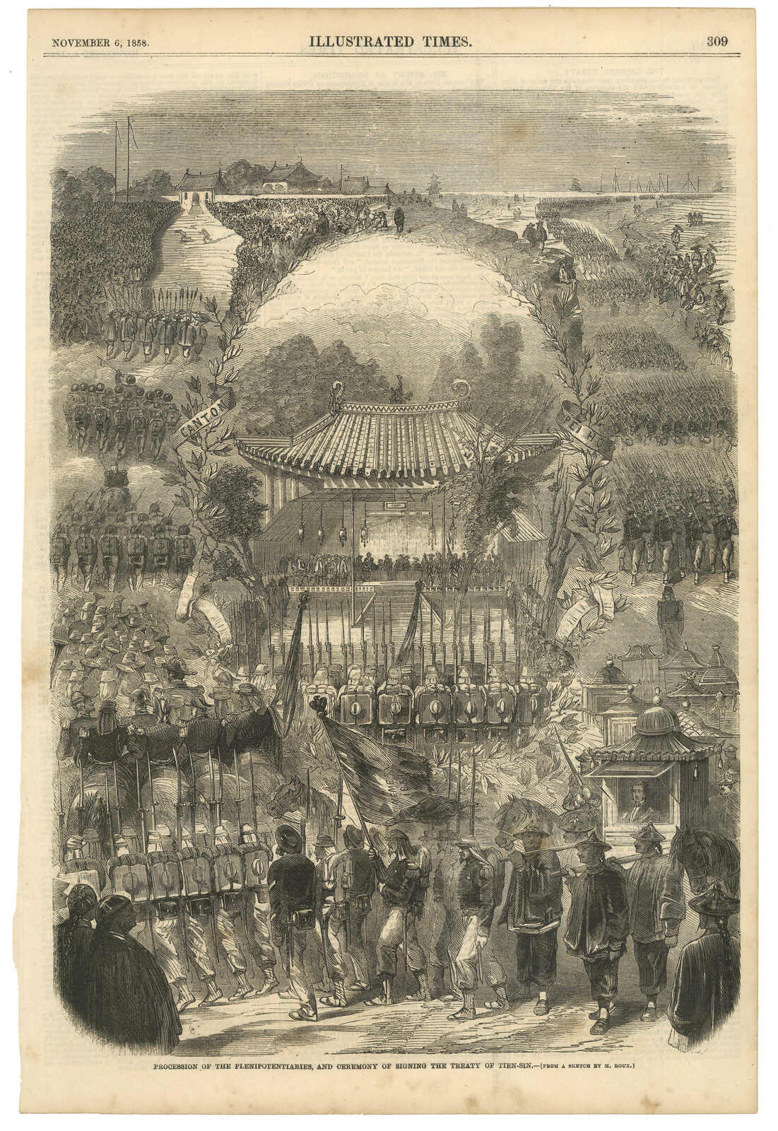 1705 image1858 (6 Nov) The Illustrated London News p.309 and 310. With image of “Progression of the Plenipotentiaries and Ceremony of Signing the Treaty of Tientsin”. Historical. (size 27 x 40cm).
