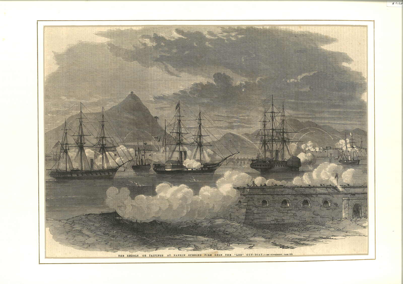 1706 image1859 a lithography showing “The rebels, or Taipings, at Nankin opening fire upon the ‘Lee’ gun-boat”. Historical. 44 x 33 cm.