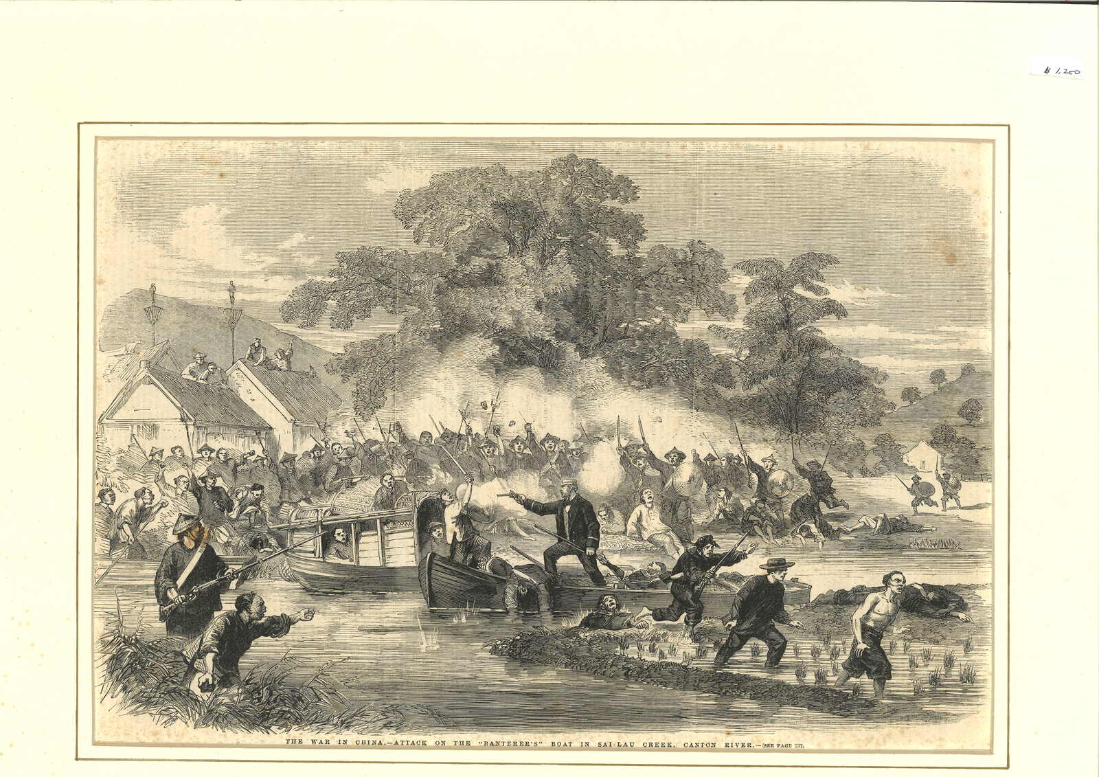 1703 image1857 a lithography showing “The War in China - Attack on the Banterer’s Boat in Sai Lau Creek, Canton River.” Historical. 45 x 34 cm.