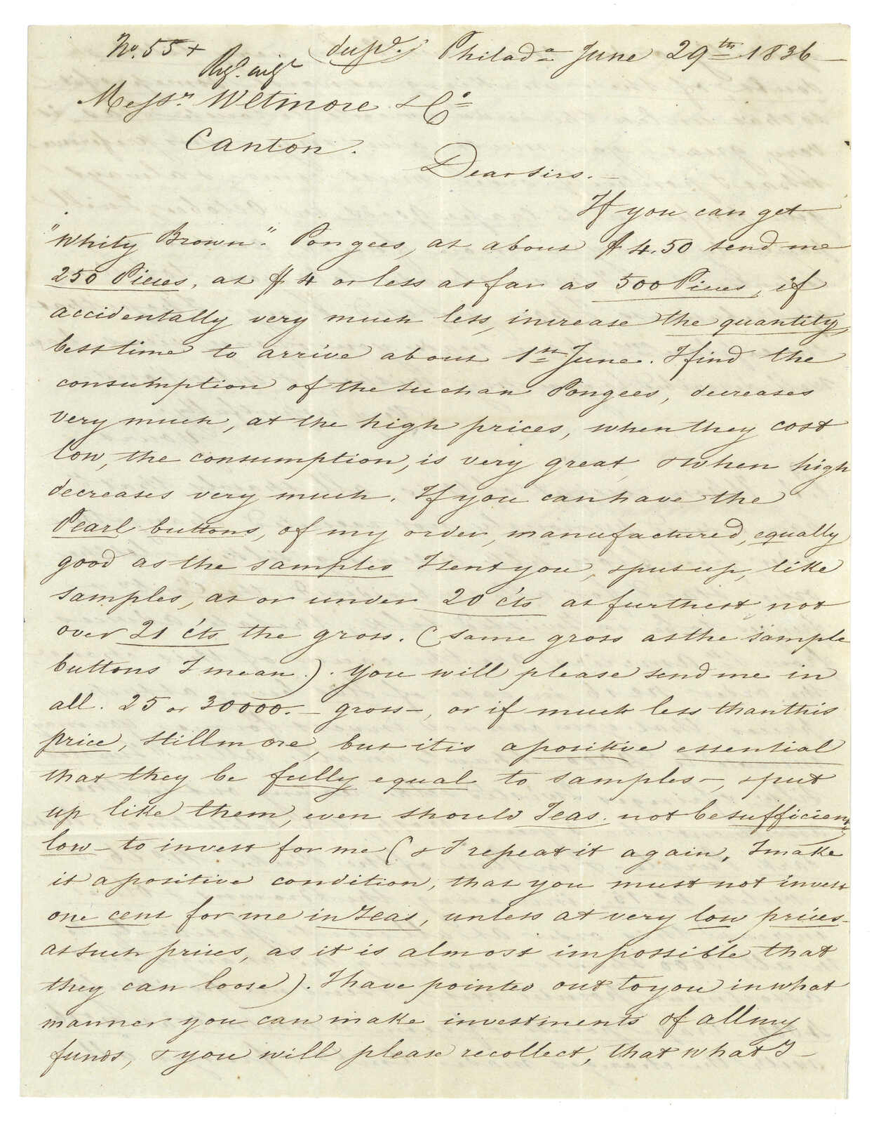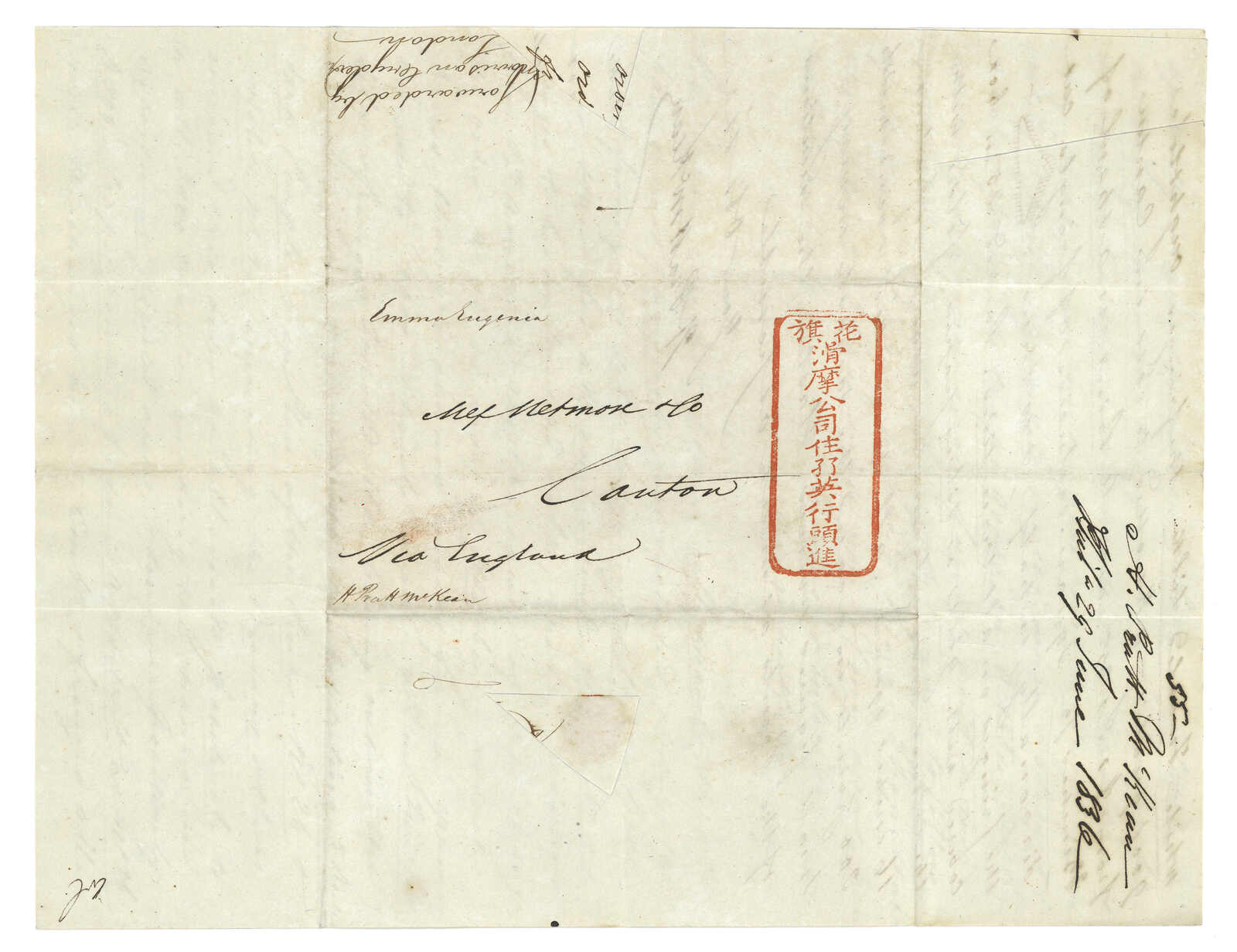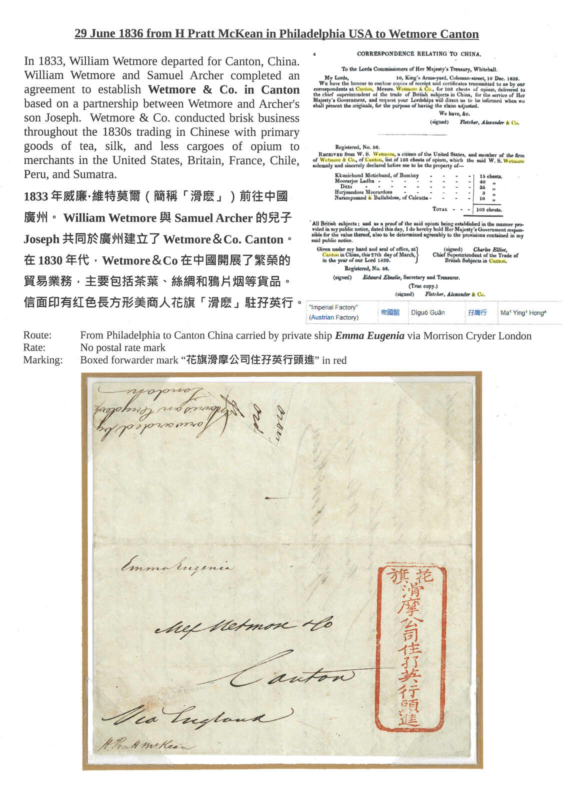 1836年6月29日,美國費城寄往中國廣州,經倫敦Morrisan Cryder & Co.轉遞 此信加蓋廣州「花旗滑摩公司住孖英行頭進」紅色方框戳,此類中文轉遞商戳通常見於英國寄出的信件,而此信從美國費城寄出,實屬罕見。更難得的是,信件經倫敦「Morrisan Cryder & Co.」轉遞,為鴉片戰爭初期轉遞商郵件的早期範例。(Image 1) (Image 2) (Image 3) (Image 4)