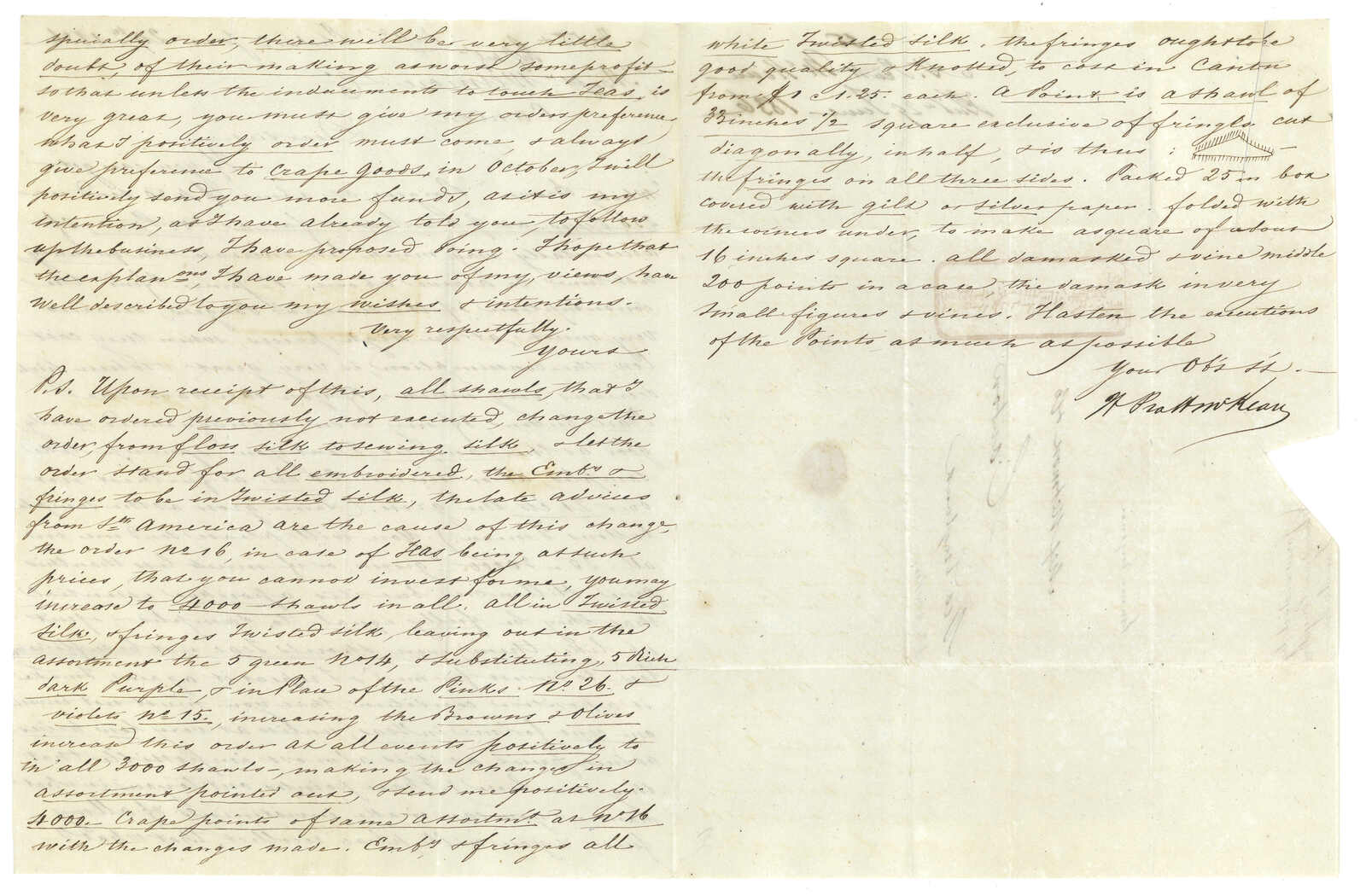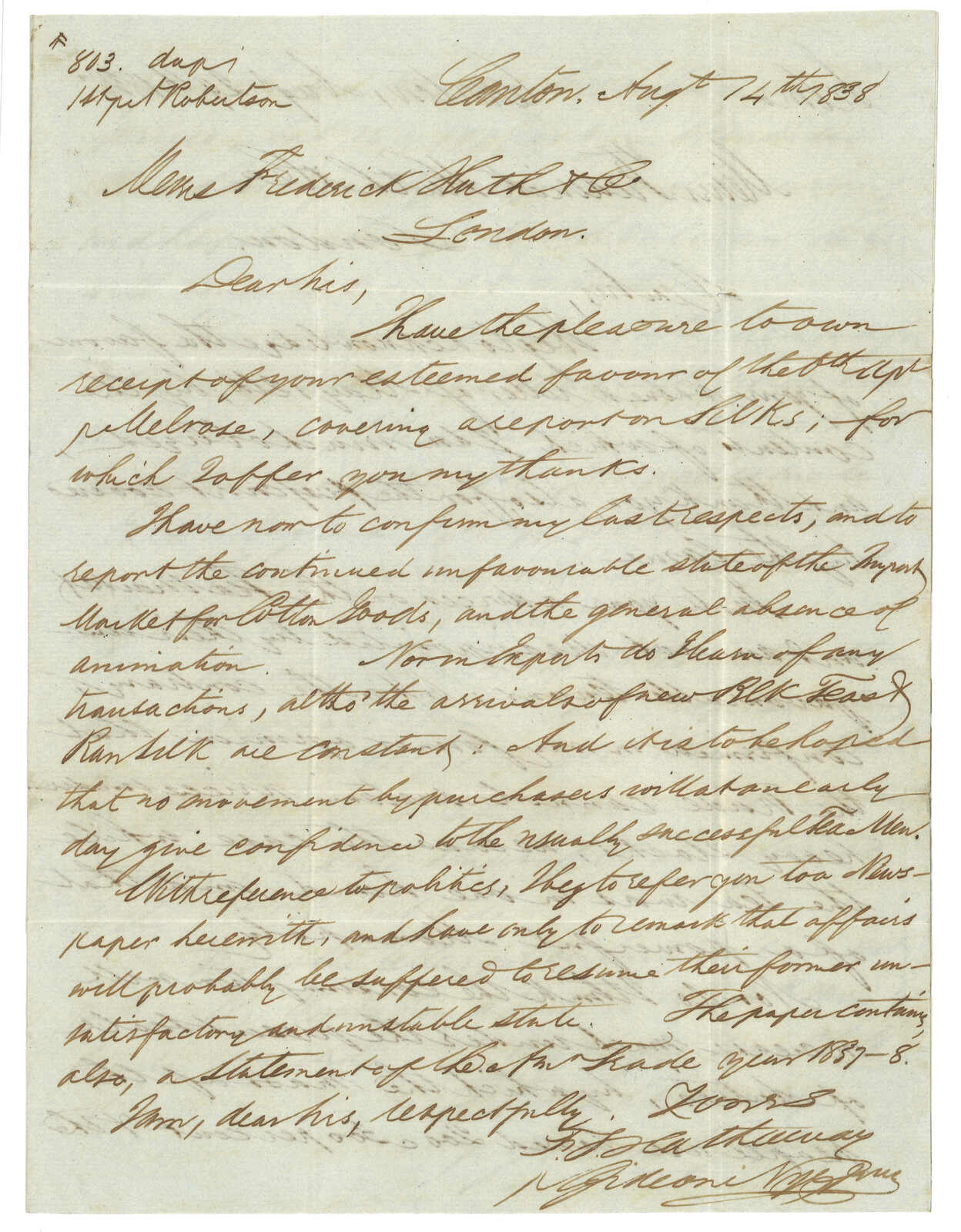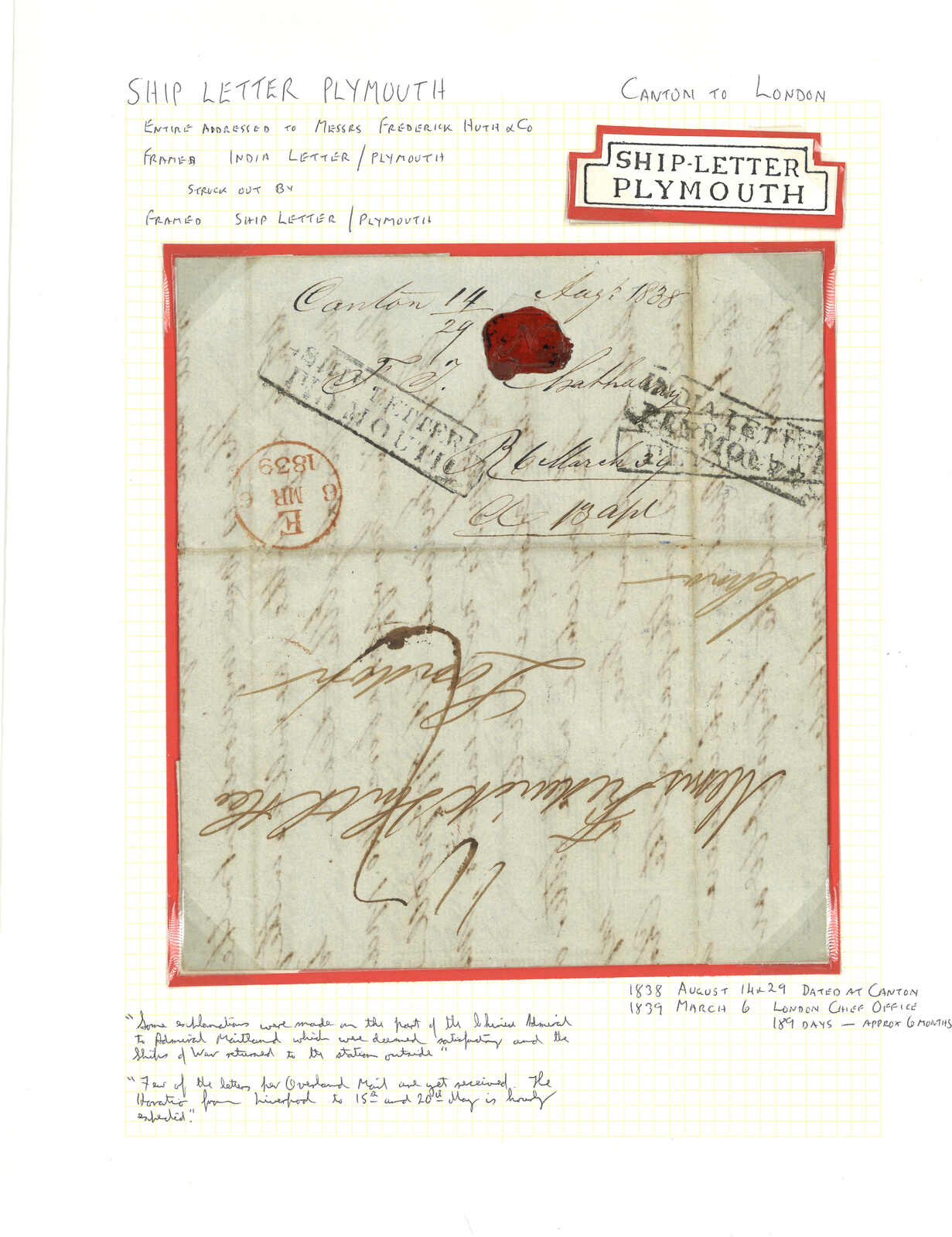 1838年8月14日及29日,廣州寄出致倫敦Frederick Huth & Coz。 此件為中國郵件誤用「INDIA LETTER」戳記後更正為「SHIP LETTER」戳記之佳例 該信函先加蓋「INDIA LETTER / PLYMOUTH」階梯式戳記,後遭劃銷,並覆蓋兩枚「SHIP LETTER / PLYMOUTH」階梯式戳記。郵資標記「1/7」由倫敦收件人支付。中國寄出郵件時常與印度郵件混雜,因而誤蓋僅需支付8便士低資費的「INDIA LETTER」戳記。本件實為更正為正確中國船郵之典範案例。 此信同時提及當時廣州進出口貿易面臨之困境:部分源於庫存問題,部分因當地民眾須承受高達200%至300%的稅賦。即便在1838年,國際貿易關稅壁壘已然存在,非獨今日美中貿易戰之現象! 信中尚載:「……中國水師提督向梅特蘭提督(Admiral Maitland)作出若干解釋,雙方認可後,(英軍)軍艦已撤回外海駐地 ……」(Image 1) (Image 2) (Image 3) (Image 4)