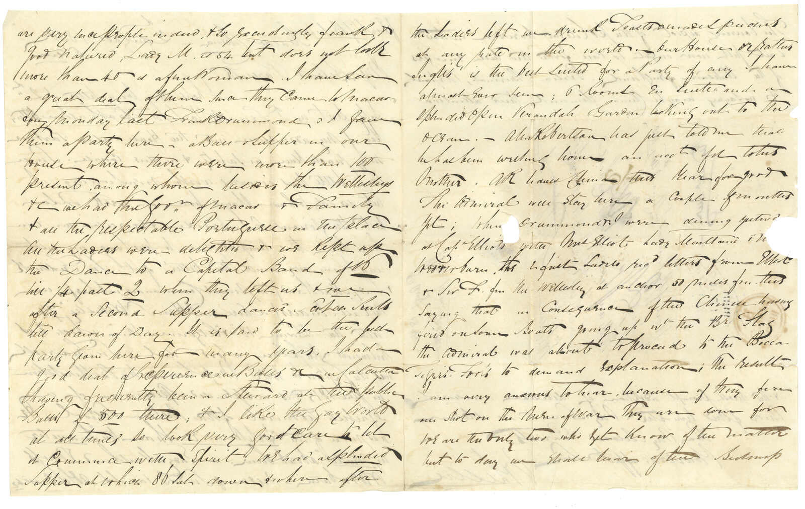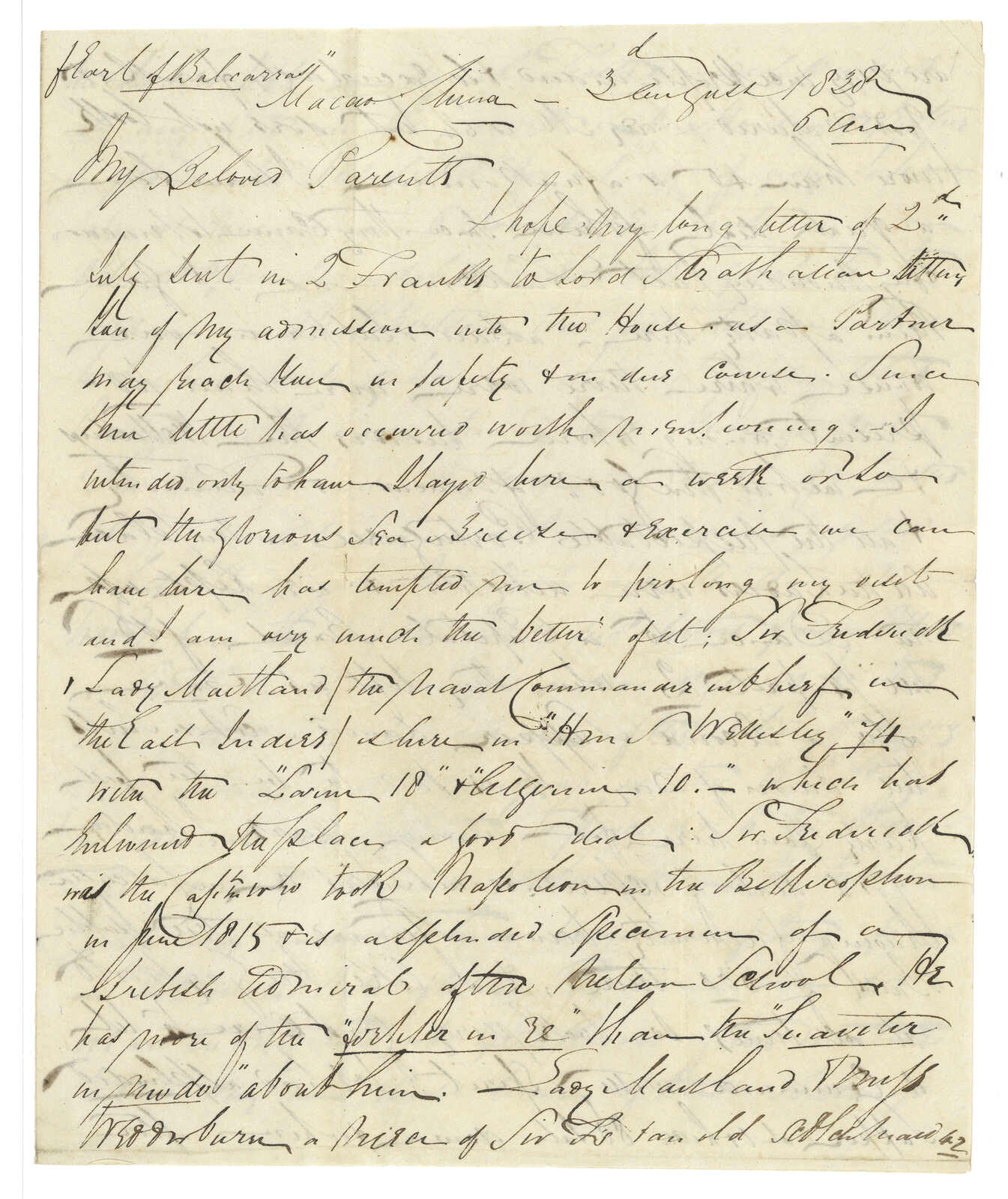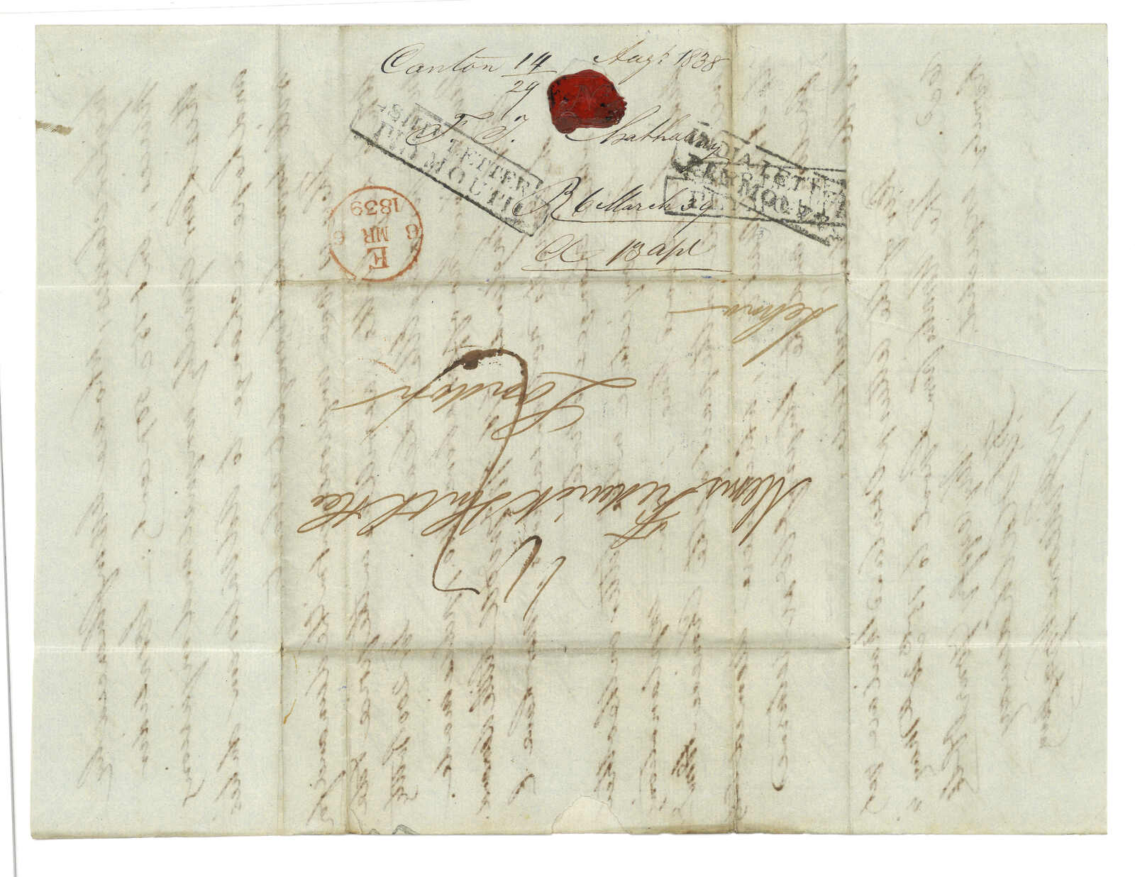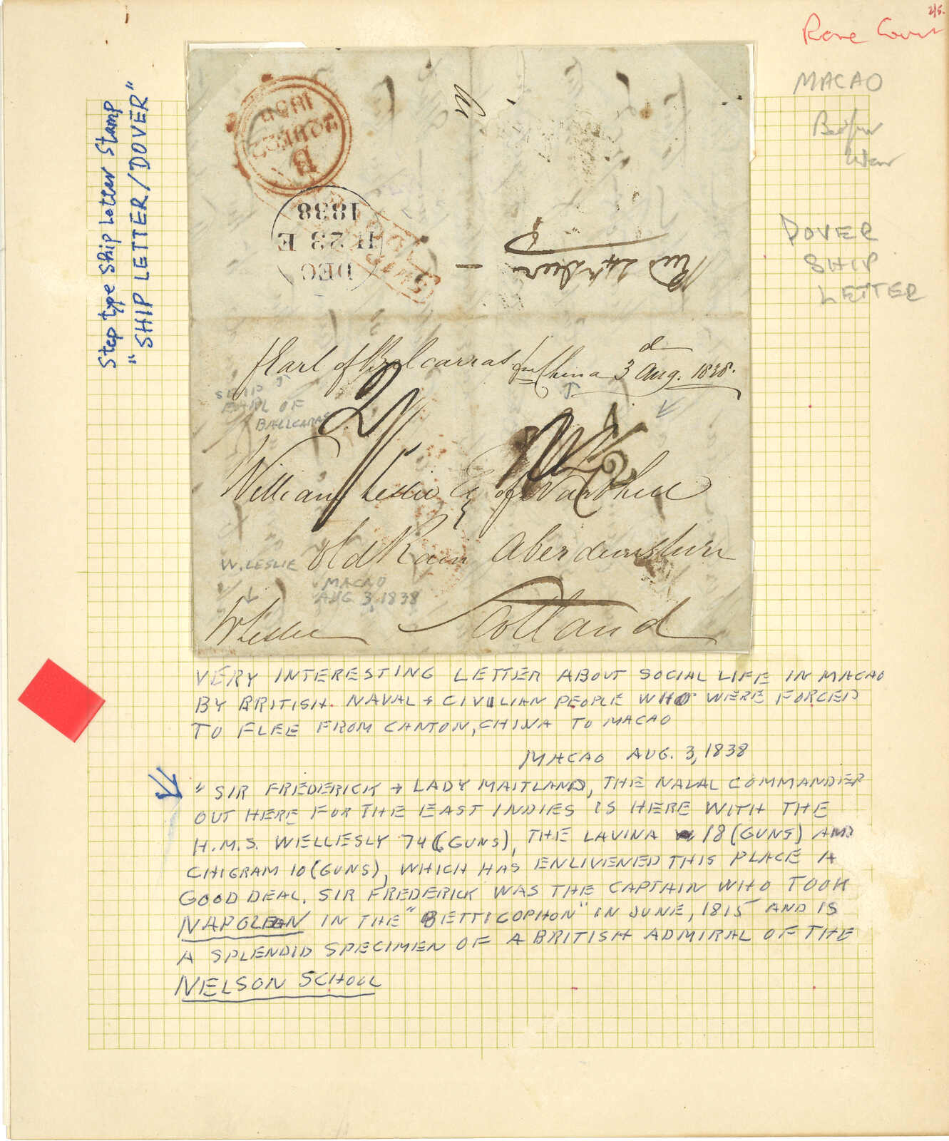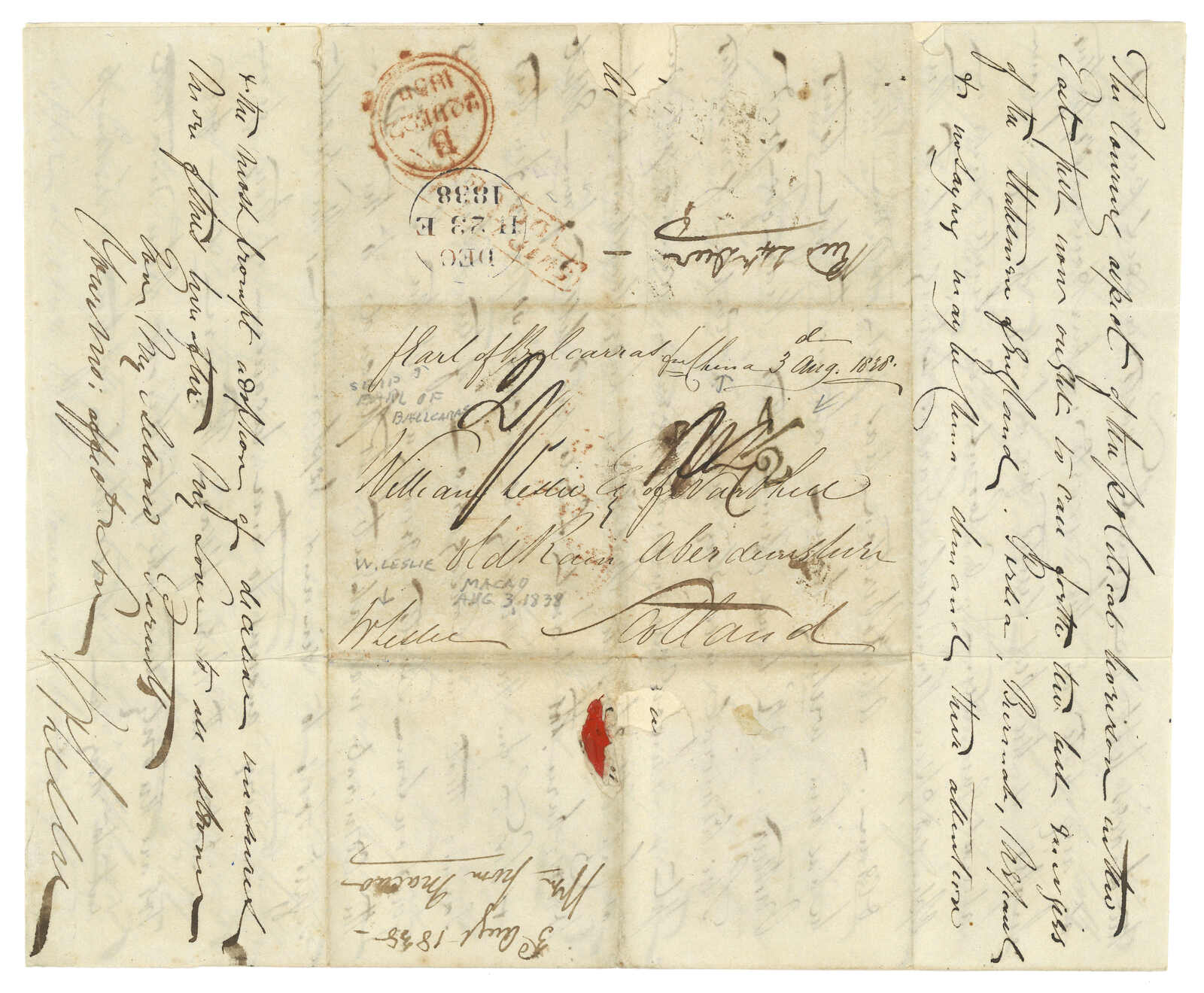 1838年8月3日,澳門經「Earl of Balcarras」號船寄往蘇格蘭亞伯丁郡 此信出自著名的William Leslie通信集,內容提及:「……東印度艦隊司令弗雷德里克·梅特蘭爵士及其夫人現駐澳門,座艦為74門炮的『HMS Wellesley』,另有18門炮的『Lavina』與10門炮的『Aegverin』,為此地增添不少生氣。弗雷德里克爵士曾於1815年6月指揮『Bellicophon』號俘虜拿破崙,乃納爾遜風範的英國海軍上將典範……」 郵資標註「2/-」為澳門至英格蘭多佛的未付費率,「½」為信件抵達蘇格蘭亞伯丁郡後的本地費用。此信為鴉片戰爭前兆,詳述英國軍民撤至澳門的經過,信中提及的高級軍官皆為戰爭期間的關鍵指揮官。弗雷德里克·梅特蘭爵士時任東印度及中國站海軍少將,於1839年11月逝世。此信內容豐富,極具歷史價值。(Image 1) (Image 2) (Image 3) (Image 4)