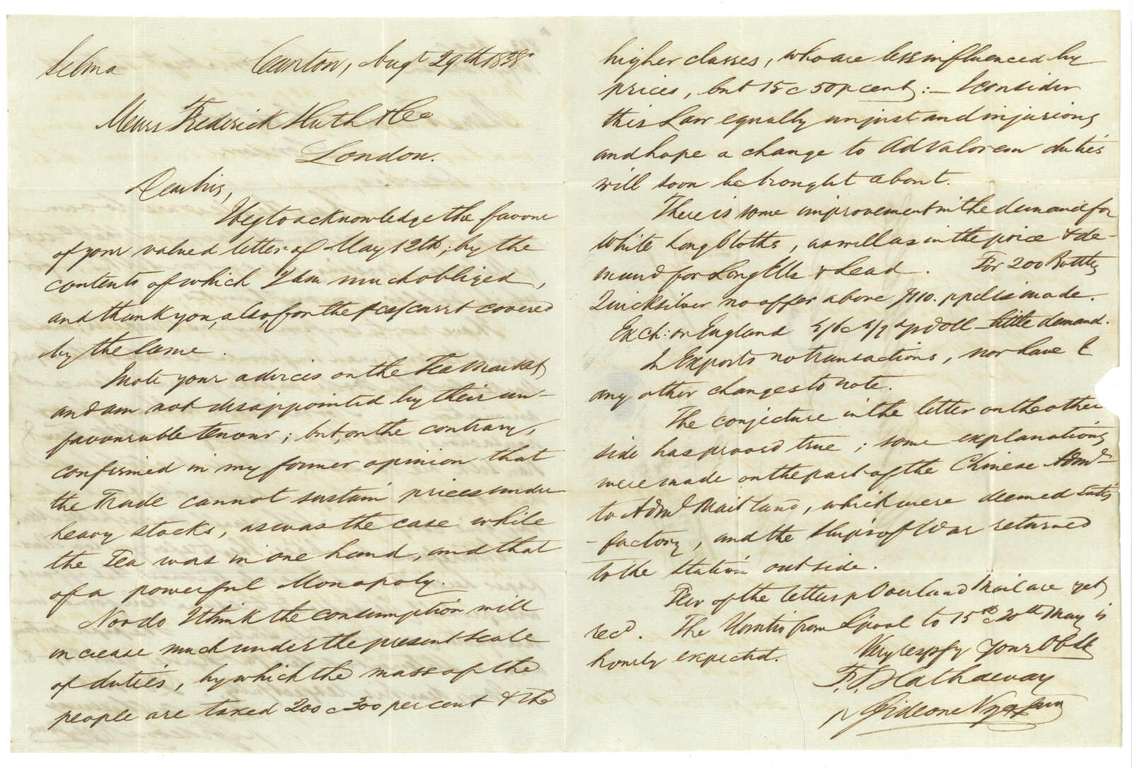 1713 imageCanton, dated 14th and 29th August 1838, sent to Frederick Huth &Co London A good example of correcting China mail to the use of “SHIP LETTER” frame instead of “INDIA LETTER” The entire letter was stamped firstly with a step-frame of “INDIA LETTER / PLYMOUTH” and then struck out, crossed over by two step-type frame of “SHIP LETTER / PLYMOUTH”. The rate was marked as “1/7” charged to the recipient at London. Letters from China were sometimes mixed with those from India and thence incorrectly stamped with the frame of “INDIA LETTER”, which was charged at a lower rate of 8d only. This is a very good example of rectifying to a correct Ship Letter mail from China. The letter was also referred to some state of difficulties in the import and trade from Canton, China, partly due to inventory issues and partly because of the tax imposition for as much as 200 to circa 300% to the mass of the people there. Even in 1838, the international has already had tariffs imposition and that not just happened in the trade war between the US and China today!! The letter also mentions the following: “…… Some explanations were made on the part of the Chinese Admiral to Admiral Maitland, which were deemed satisfactory, and the (British) ships of war returned to the station outside ……”
