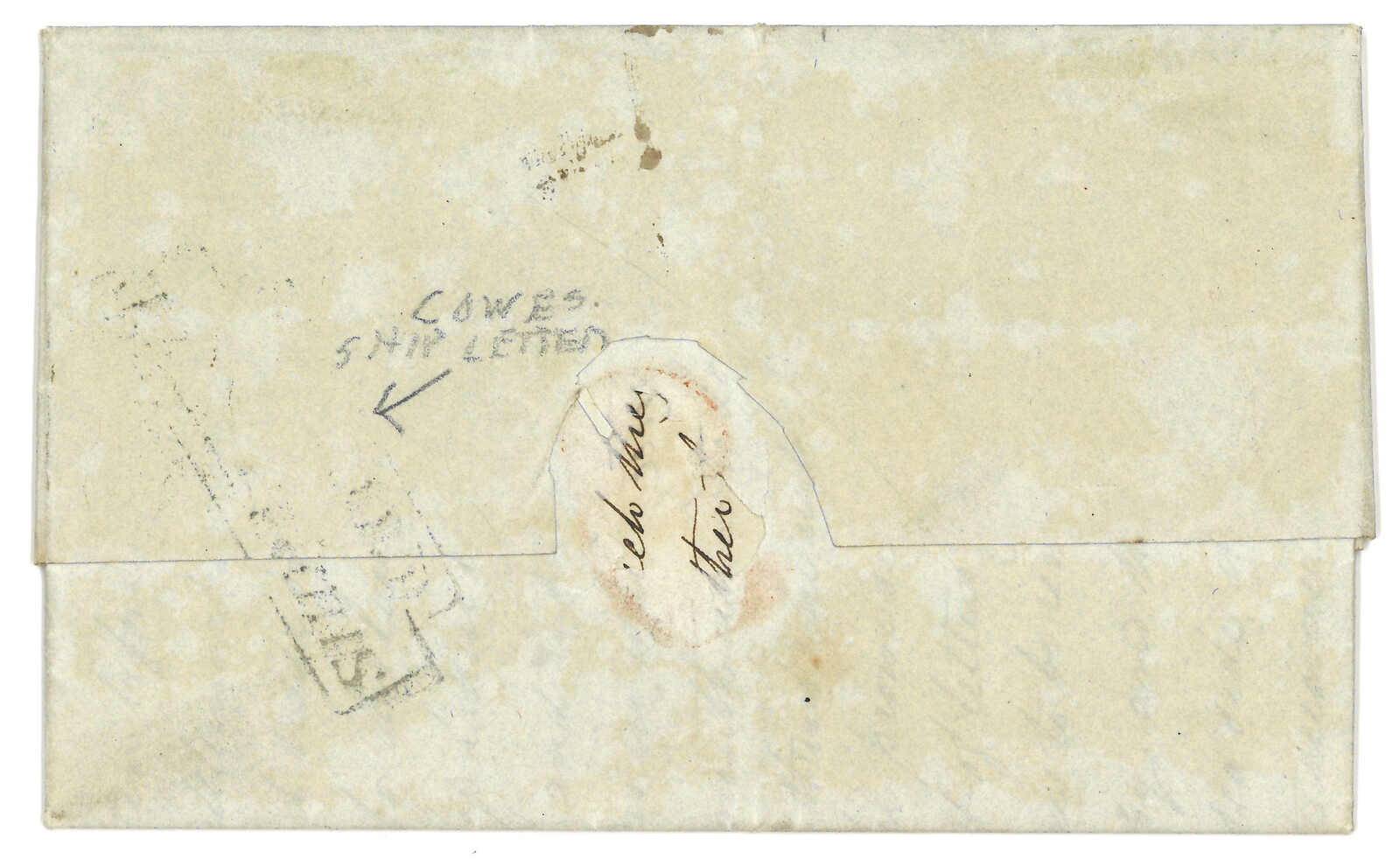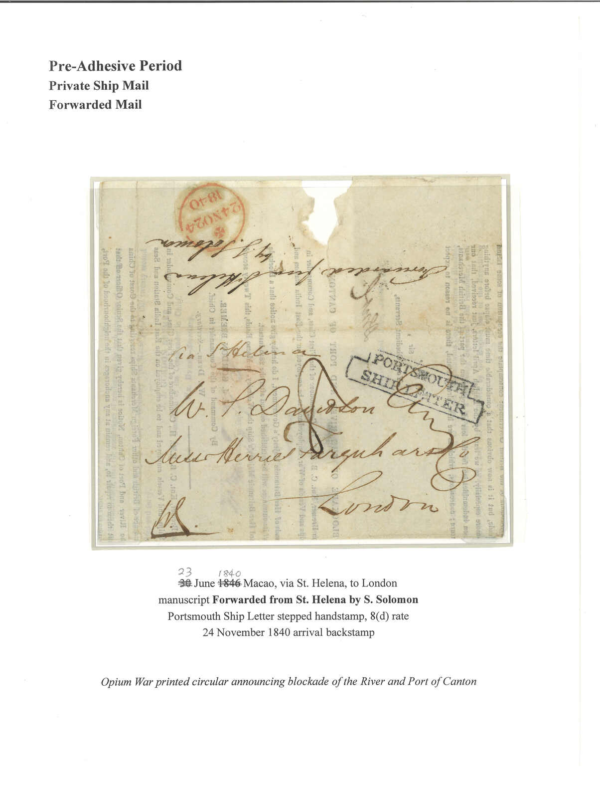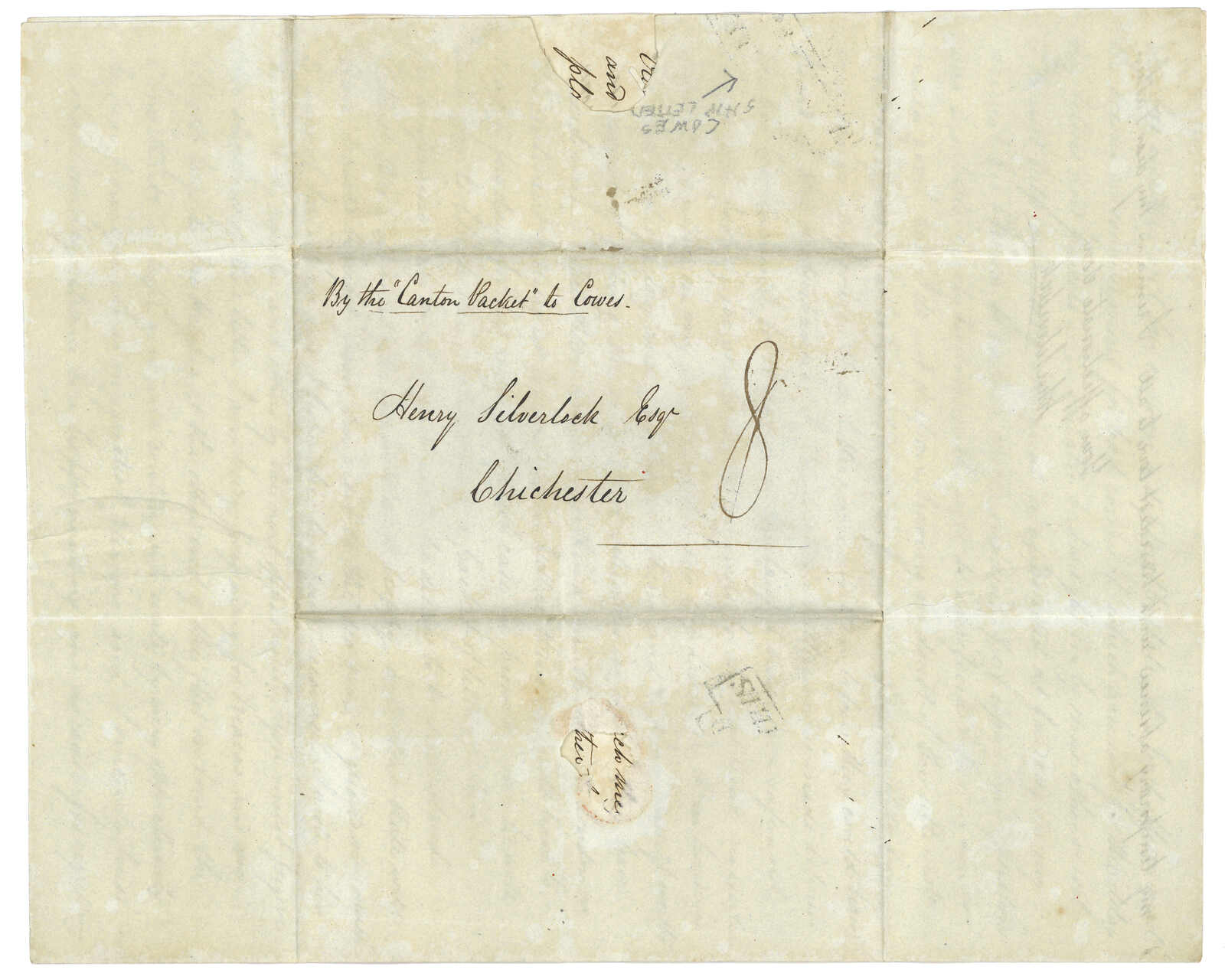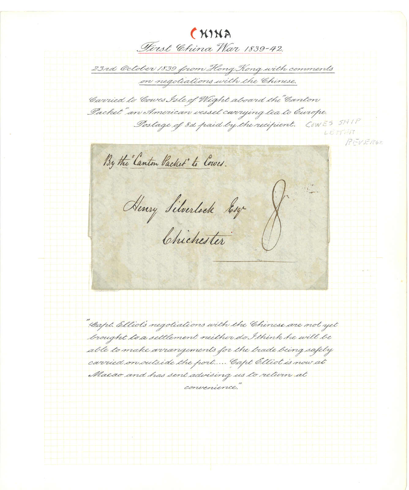 1714 image1839 (22 Oct) Early Civil Mail from Hong Kong A very early civilian letter sent from Hong Kong (the earliest recorded is a letter sent on 9 Sept 1839 – Connaught Collection). This is a John Silverlock historic letter sent by an American vessel “Canton Packet” to arrive Chichester via Cowes port in England carrying a legible step-type “SHIP LETTER / COWES” stamp. The letter recorded the British negotiation status with Chinese Government in October 1839 before the outbreak of the First Opium War. The content has the following narratives: “… I have nothing very satisfactory to community as regards our position now and prospect here. Capt. Elliot’s negotiations with the Chinese are not yet brought to a settlement. Neither do I think he will be able to make arrangements for the trade being safely carried on outside the port, the merchants would have to trust too much to the Hong merchants both in the sale of imports and in the quality of the produce received in return. The risk will be too great for any good to be done, should they attempt to conduct the business on the plan proposed… Capt. Elliot is now at Macao and he has sent here to announce his intention of remaining there and advising us to return at convenience. I expect to go over tomorrow (to Macao) and if the Portuguese Governor thinks we may live there in safety all will soon follow….”. This letter suggested to us the tension between the British and Chinese governments at the time, when the British subjects were forbidden to reside in Canton and therefore forced to remove to the nearer Macao temporarily where it was under the Portugal government ruling as a colony. In addition, the British vessels were not allowed to travel around the Canton waters except the American vessels. Therefore, the letter was shipped via “Canton Packet” which was an American steamer. Ex Percival David Collection
