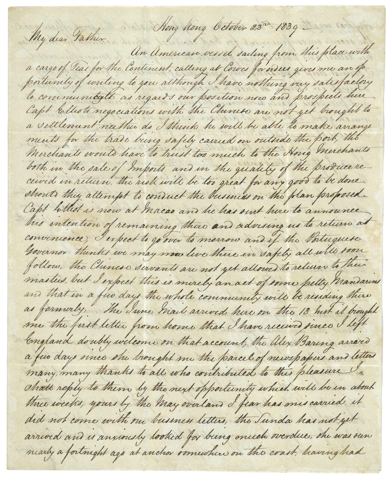 1839年10月22日香港寄出之早期民用信件 此為美國船「Canton Packet」經英國考斯港寄至奇切斯特的歷史信件,蓋有清晰「SHIP LETTER / COWES」階梯式戳記,記錄鴉片戰爭爆發前中英談判僵局: 「……目前情勢難言樂觀。義律上尉與中方談判未果,外商於廣州外港貿易之提議風險過高……義律現駐澳門,建議我等酌情返回。若葡澳總督確認安全,眾人將隨行……」 此信反映中英緊張關係:英人被逐出廣州,暫避葡萄牙治下的澳門;僅美國船隻可於珠江水域航行,故信件經美國船轉遞。 [拍賣品來源:珀西瓦爾·大維德爵士珍藏(Image 1) (Image 2) (Image 3) (Image 4) (Image 5)
