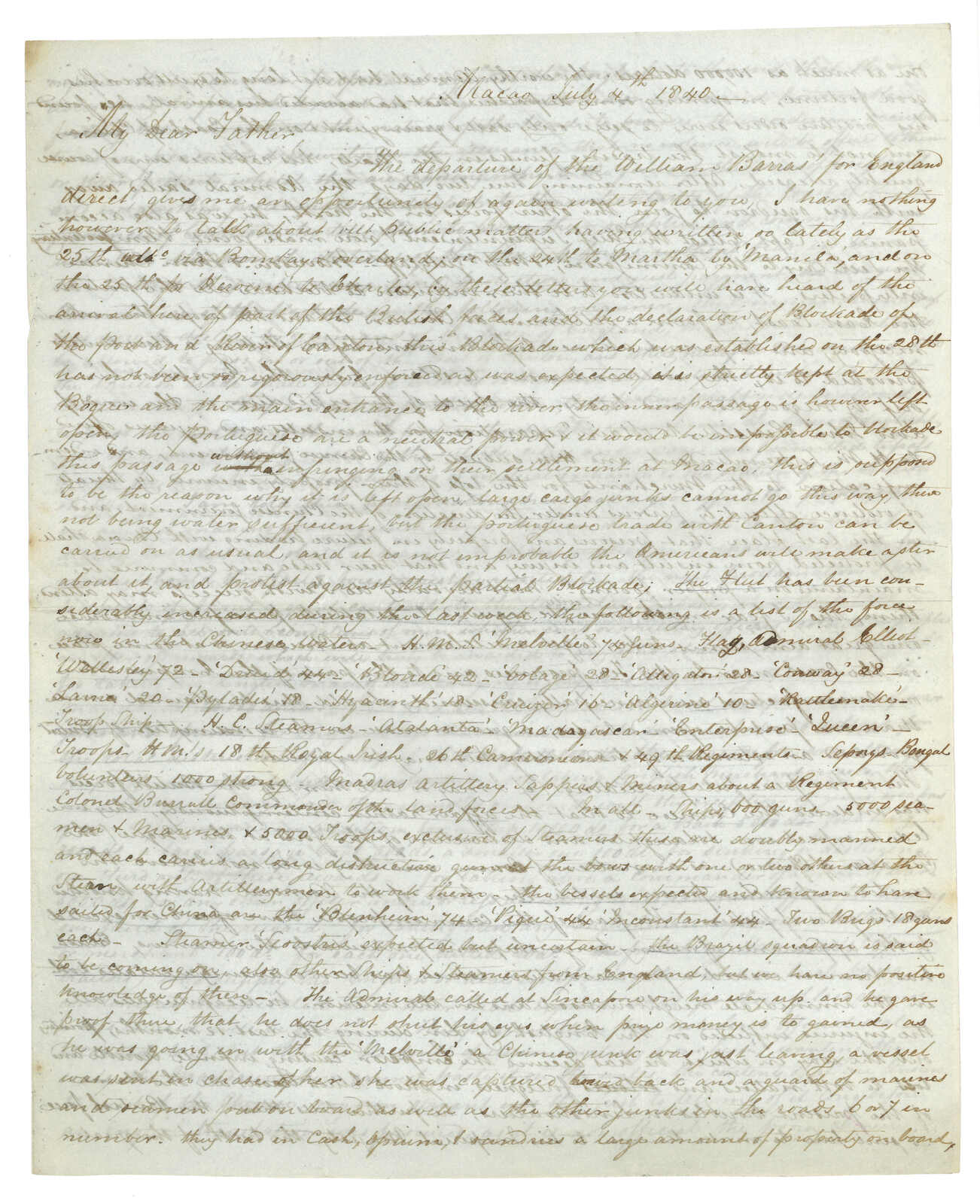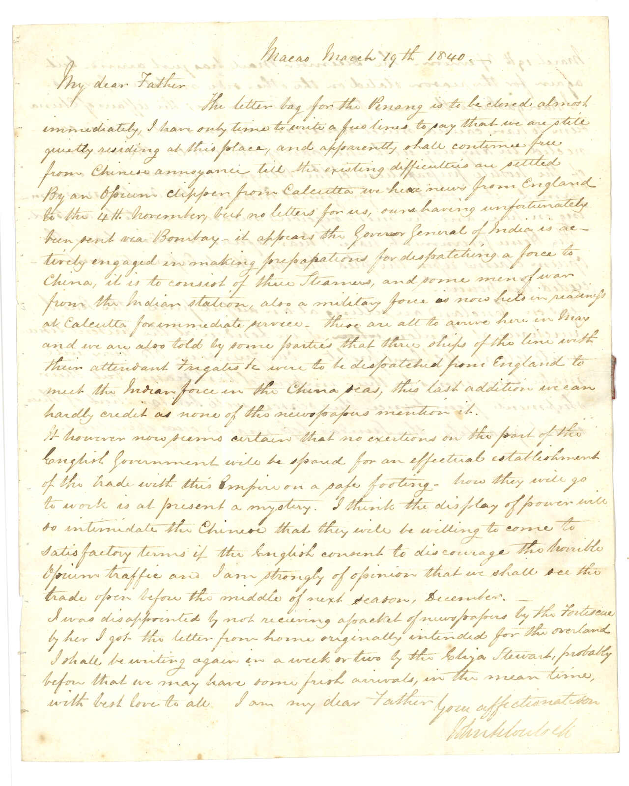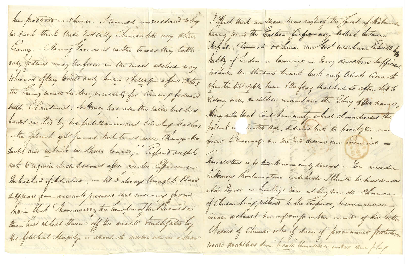 1722 image840 (20 Aug) Macao An important Silverlock correspondence from Macao – completion of British military reinforcement and launch of intense attack to Qing Dynasty. Towards June end, the British military reinforcement was completed. The British naval force launched an intense bombardment on 5 July and soon occupied Tinghai harbour. British expedition then divided its forces, sending one fleet south to the Pearl River while sending a second fleet north to the Yellow Sea. This letter sheet provides a detailed account of the fleet sent down to the South to fully capture Canton River and the ports near Chuenpi given the strategic value of Pear River Delta to the South gateway to China. The letter content: …… and the departure of the ‘Toutae[NOTE 1]’, the Chief Chinese military officer at this station, at the solicitation of the Governor to Canton for this purpose, his interview with Lin if he had one at all was in its result unfavorable …… the ‘Toutae’ promised to withdraw his troops the Governor having presented to him; if he did not do so, the English forces would be landed. The town was in a state of great excitement, no one knowing what to expect from this gathering together of the Chinese troops. Capt. Smith had been urged by a letter from nearly all the British residents to take forcible towards affecting the release of Mr Stanton, and securing us against such dangers in future. It was very evident he extended to do something on Tuesday night the ‘Druid’, “Hyacinth’, ‘Larne’ and enterprise steamer even all in the Roads, and from the movements next morning it was clear they were preparing to strike a blow, and rumour said the Barrier and its defences were to be destroyed, such proved to be the fact. The ‘Hyacinth’ and ‘Larne’ took up a position in the Bay commanding the Barrier and the embankments; about noon, the commenced battering away and it was long time before the Chinese ceased to return their fire, they had twenty guns mounted and worked them well, the Steamer towed in fourteen boats with troops, marines, and sailors, which were landed in the Chinese side of the Barrier protected by the fire of the Steamer and the sloops of war ……Note 1: In 1840, according to Manchu convention under Qing Dynasty, “Toutae” 都台is an old romanization or phonetics variant to都統or提督, referred to Guan Tianpei (關天培) at the time. Ex Percival David
