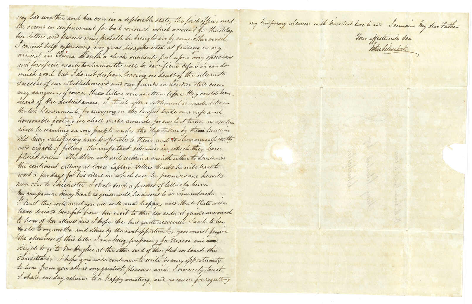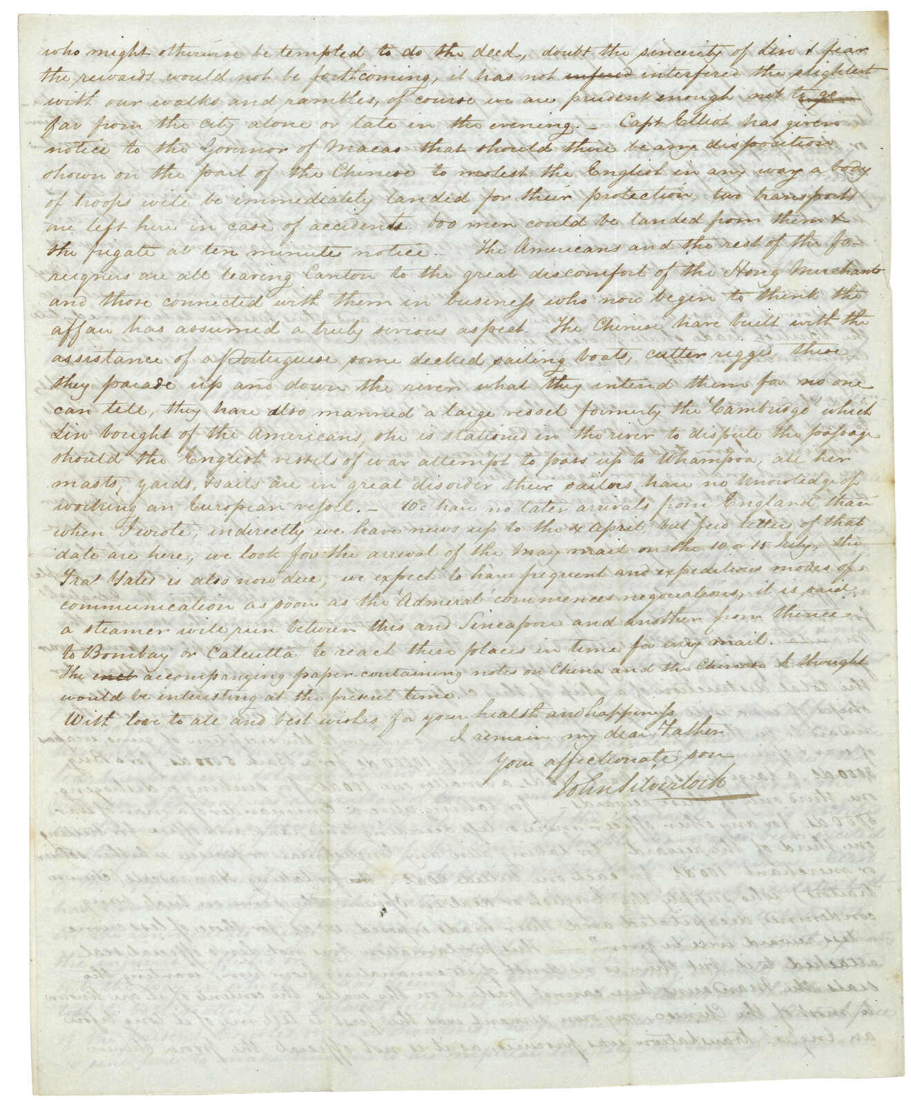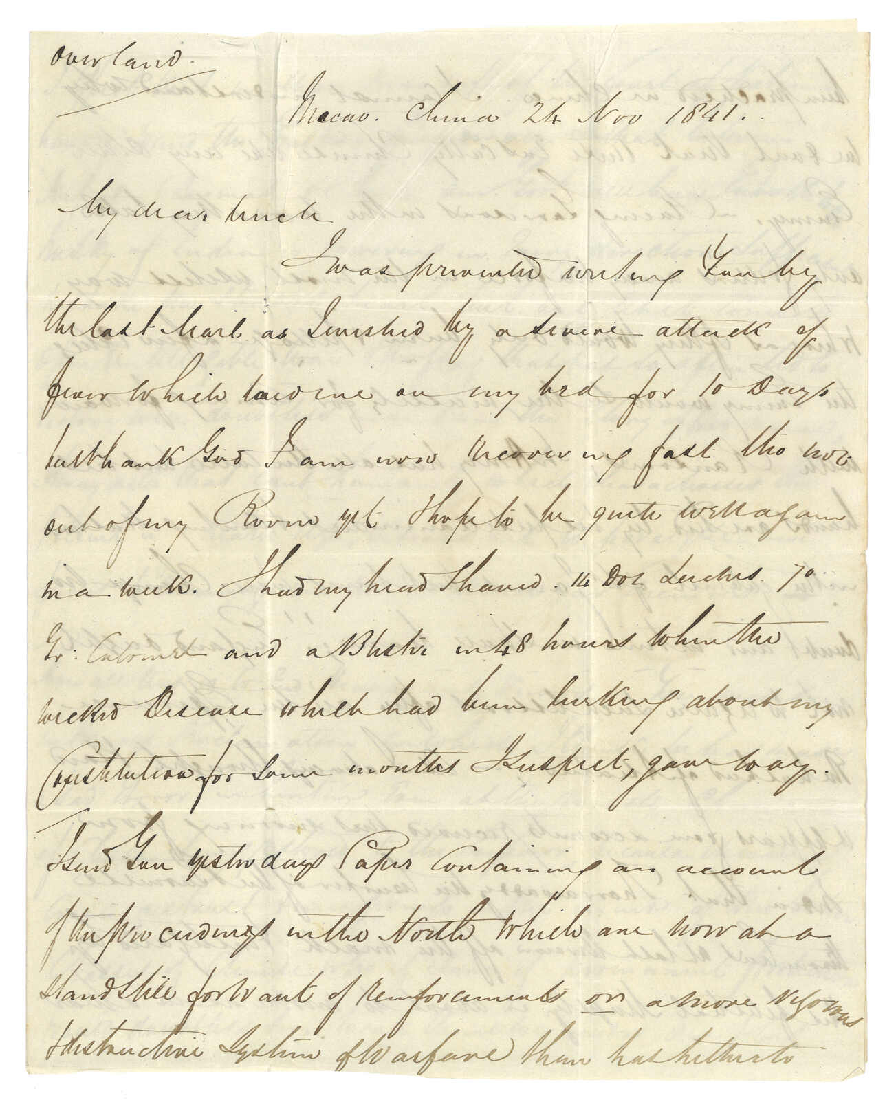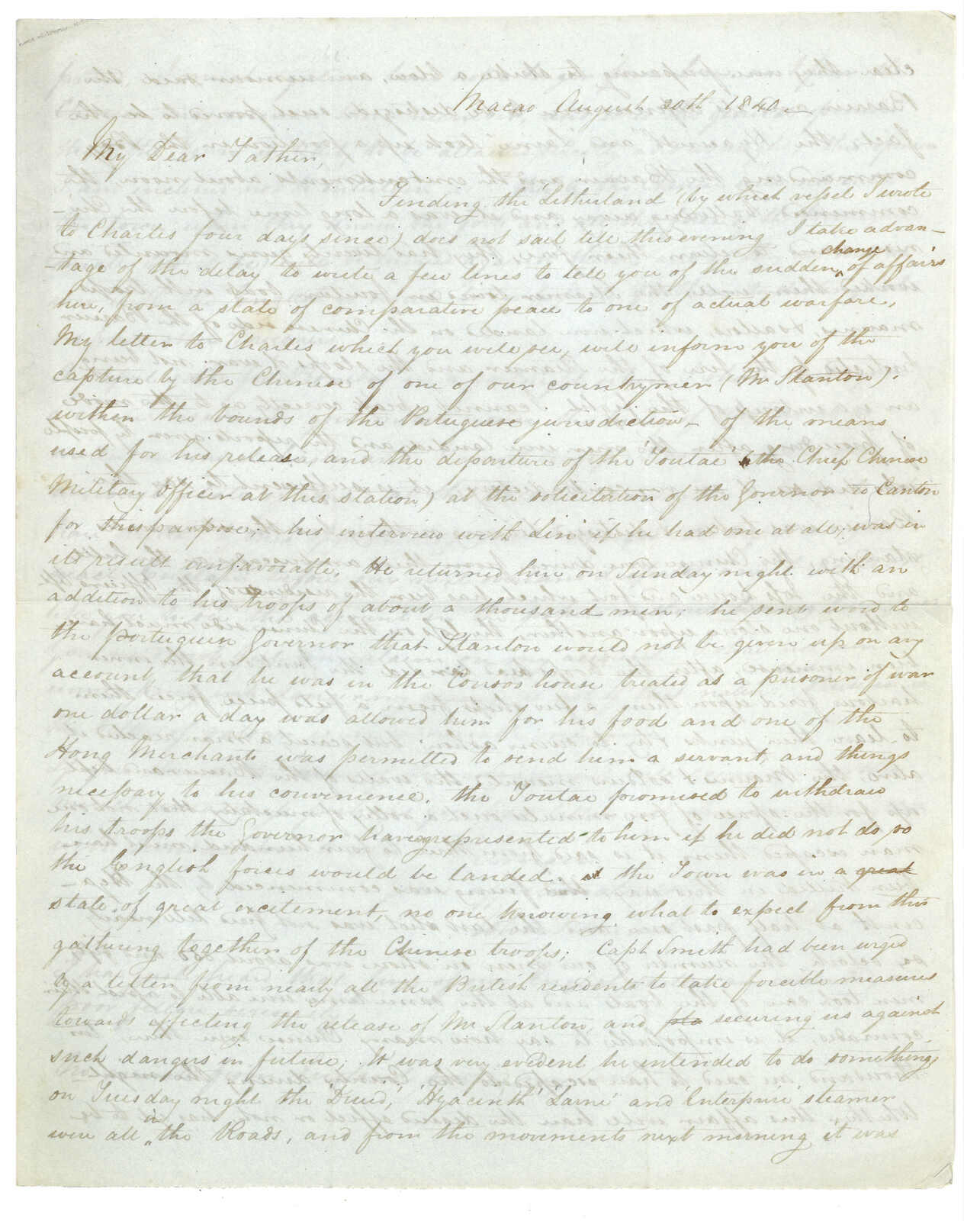 1722 image840 (20 Aug) Macao An important Silverlock correspondence from Macao – completion of British military reinforcement and launch of intense attack to Qing Dynasty. Towards June end, the British military reinforcement was completed. The British naval force launched an intense bombardment on 5 July and soon occupied Tinghai harbour. British expedition then divided its forces, sending one fleet south to the Pearl River while sending a second fleet north to the Yellow Sea. This letter sheet provides a detailed account of the fleet sent down to the South to fully capture Canton River and the ports near Chuenpi given the strategic value of Pear River Delta to the South gateway to China. The letter content: …… and the departure of the ‘Toutae[NOTE 1]’, the Chief Chinese military officer at this station, at the solicitation of the Governor to Canton for this purpose, his interview with Lin if he had one at all was in its result unfavorable …… the ‘Toutae’ promised to withdraw his troops the Governor having presented to him; if he did not do so, the English forces would be landed. The town was in a state of great excitement, no one knowing what to expect from this gathering together of the Chinese troops. Capt. Smith had been urged by a letter from nearly all the British residents to take forcible towards affecting the release of Mr Stanton, and securing us against such dangers in future. It was very evident he extended to do something on Tuesday night the ‘Druid’, “Hyacinth’, ‘Larne’ and enterprise steamer even all in the Roads, and from the movements next morning it was clear they were preparing to strike a blow, and rumour said the Barrier and its defences were to be destroyed, such proved to be the fact. The ‘Hyacinth’ and ‘Larne’ took up a position in the Bay commanding the Barrier and the embankments; about noon, the commenced battering away and it was long time before the Chinese ceased to return their fire, they had twenty guns mounted and worked them well, the Steamer towed in fourteen boats with troops, marines, and sailors, which were landed in the Chinese side of the Barrier protected by the fire of the Steamer and the sloops of war ……Note 1: In 1840, according to Manchu convention under Qing Dynasty, “Toutae” 都台is an old romanization or phonetics variant to都統or提督, referred to Guan Tianpei (關天培) at the time. Ex Percival David