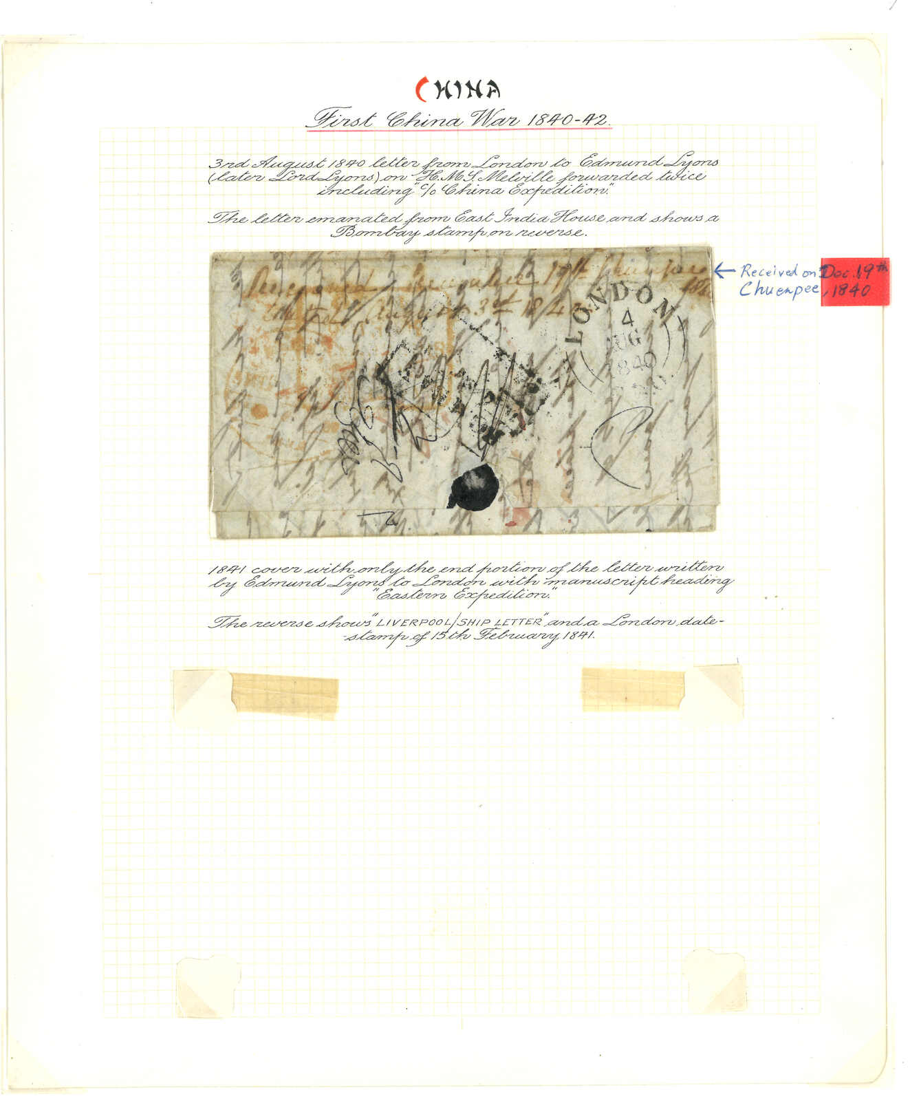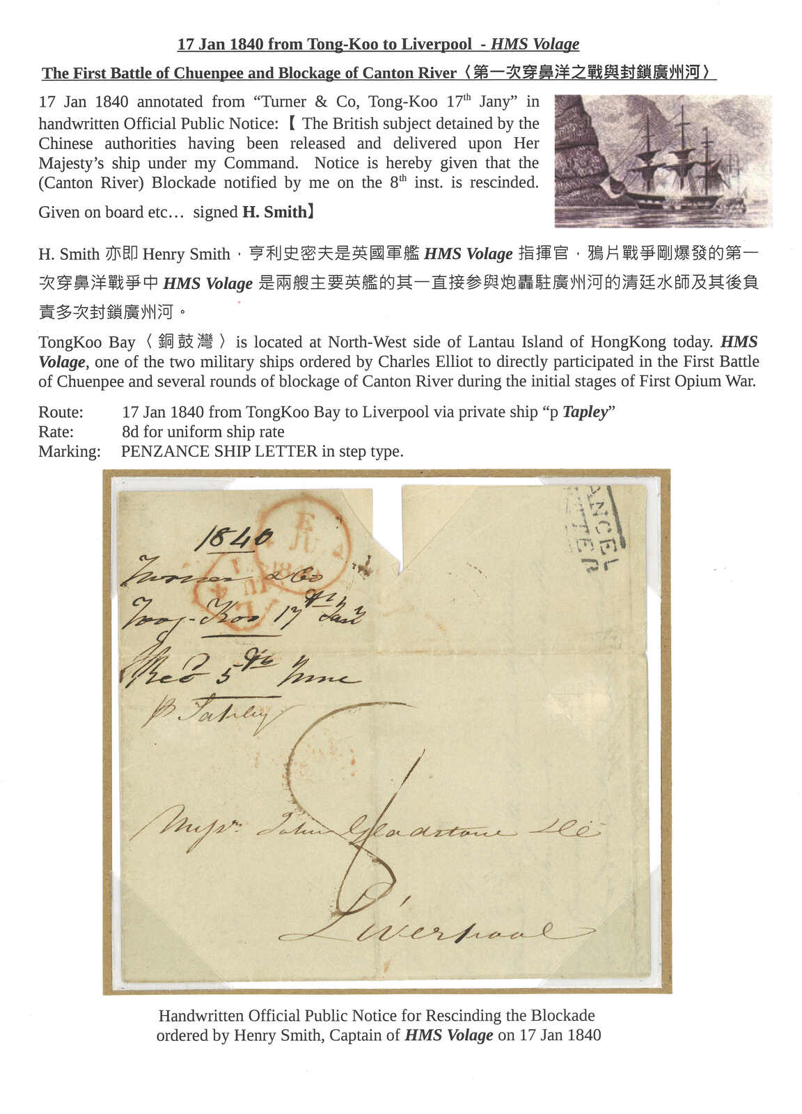 1840年1月17日信函從駐銅鼓灣的英艦HMS Volage指揮官Henry Smith寄出至英國利物浦 信件由銅鼓灣(Tongkoo)的Turner & Co公司寄往利物浦的John Gladstone & Co,經由「Tapley」號船運送,手寫資費為「8」,並蓋有黑色的階梯式「PENZANCE / SHIP LETTER」戳記,以及利物浦到達日戳(6月4日);信件內容涉及一份手寫的官方公告,其內容如下:「被中國當局拘留的英國臣民,現已被釋放並交付至由我指揮的英國女王陛下軍艦上。茲公告,於本月八日由本人所宣佈之(珠江口)封鎖令,現予以撤銷……此令於(HMS Volage)艦上發布……簽署:H. Smith」 這是一份重要的文件,由英國皇家海軍艦艇「HMS Volage」艦長 H. Smith 於銅鼓灣簽署。 米克‧高史密斯收藏(Image 1) (Image 2) (Image 3) (Image 4)