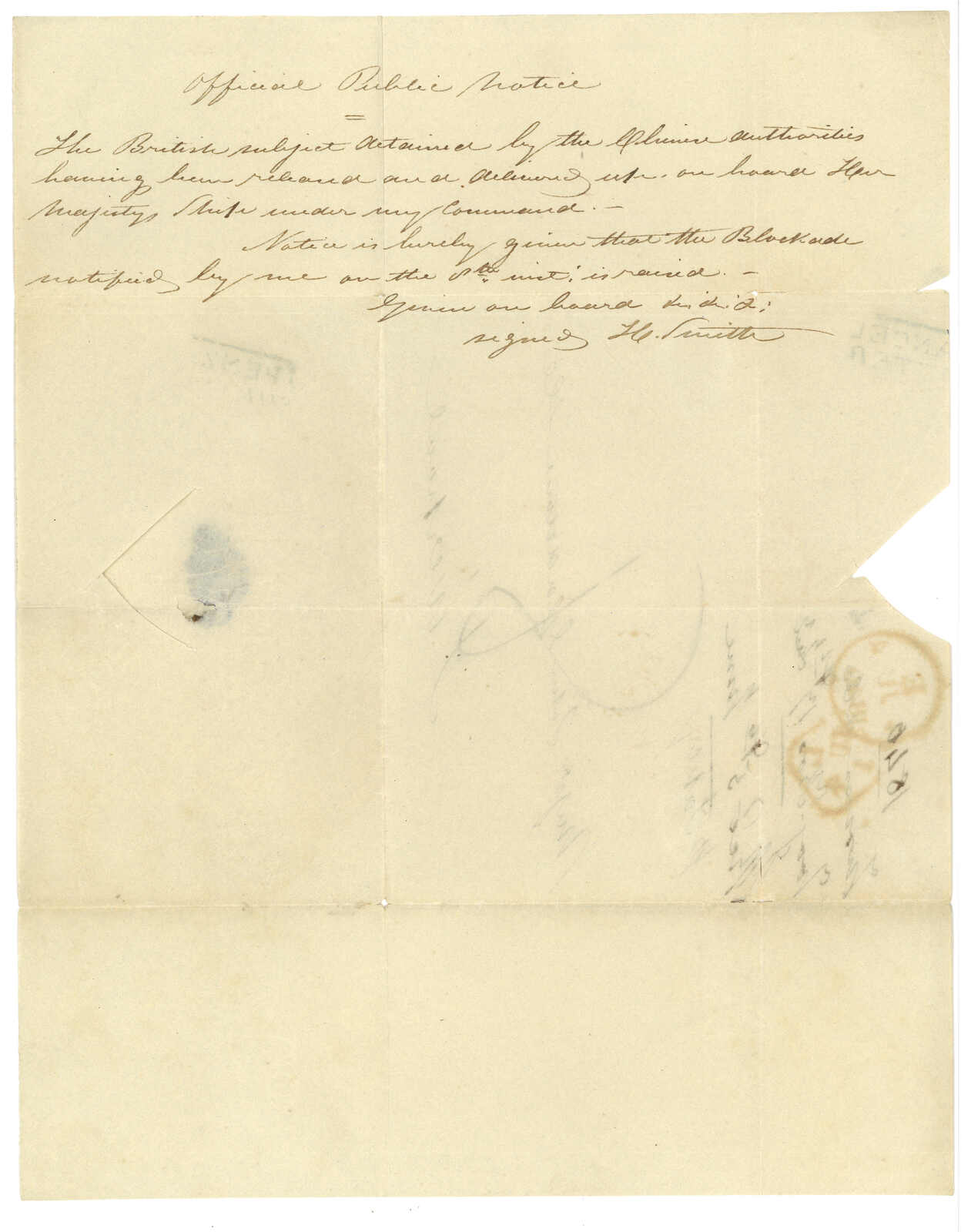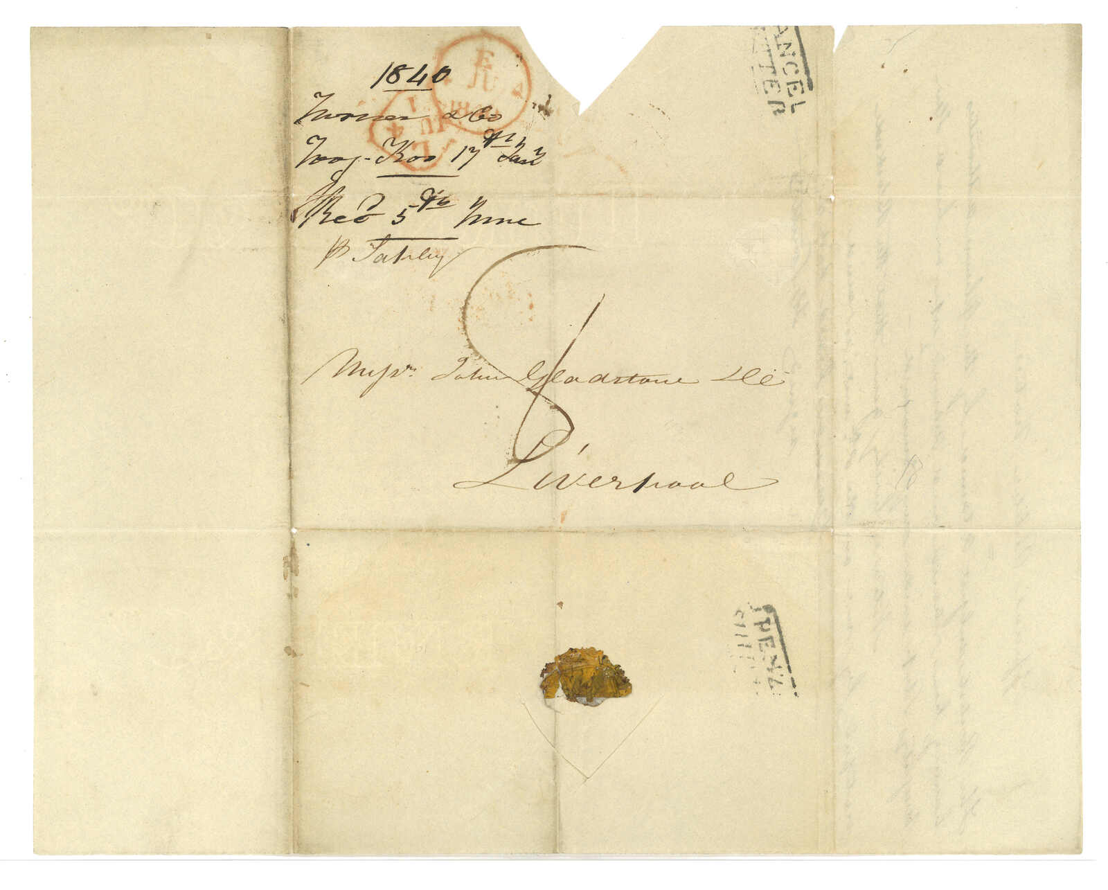 1715 image1840 (17 Jan) Official Public Notice, from Tongkoo to Liverpool Entire letter from Turner & Co at Tongkoo to Messrs John Gladstone & Co Liverpool carried by the “Tapley”, rate “8” in manuscript with step-type “PENZANCE / SHIP LETTER” in black and Liverpool arrival datestamp (4 June); the contents was about a hand-written Official Public Notice. :【 “The British subject detained by Chinese authorities having been release and delivered upon Her Majesty’s ship under my command. Notice is hereby given that the blockade (to Canton River) notified by me on the 8th inst. (i.e. last month) is rescind …… Given on board etc …… signed H. Smith” 】This is an important document signed by the captain of the HMS Volage at Tongkoo. Ex Mick Goldsmith, June 2016