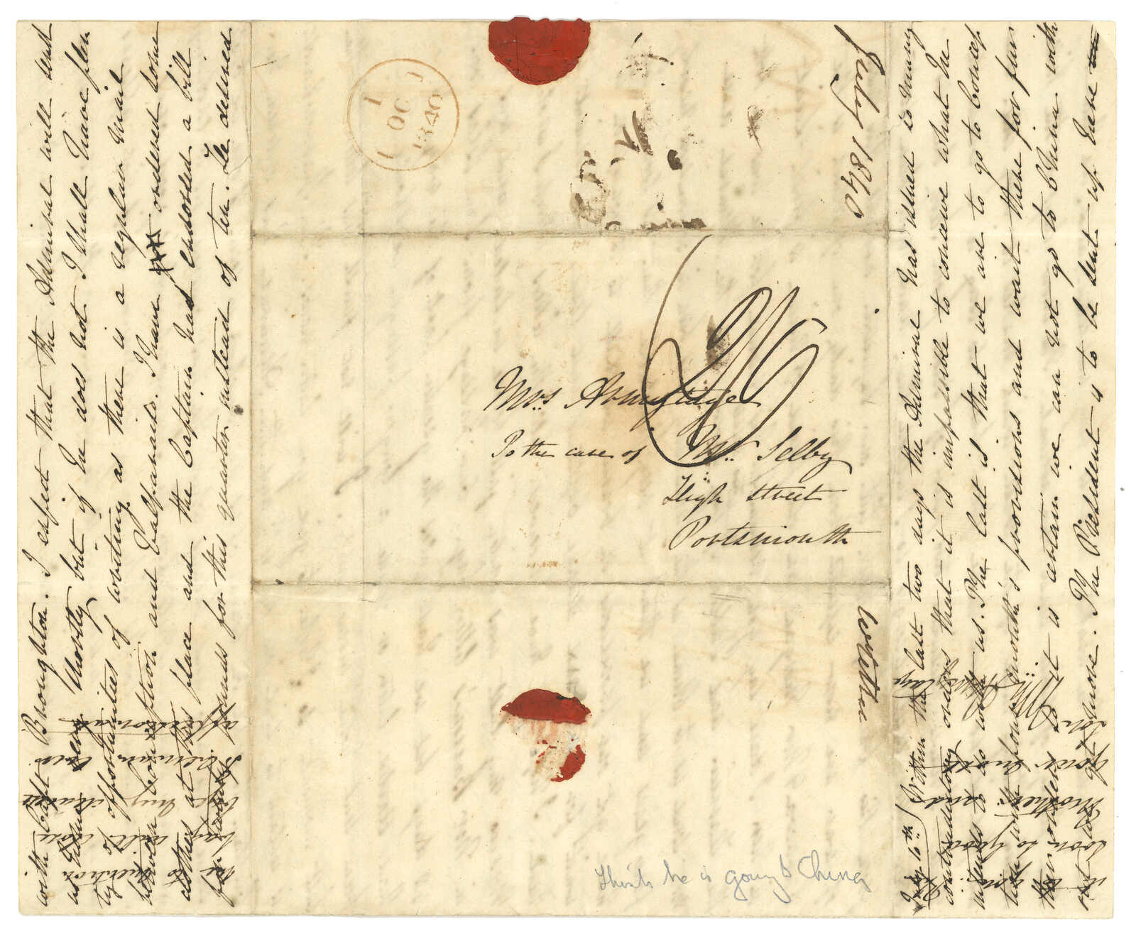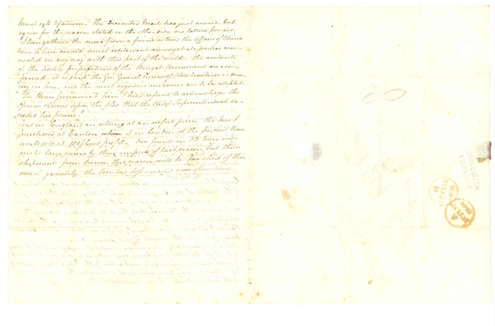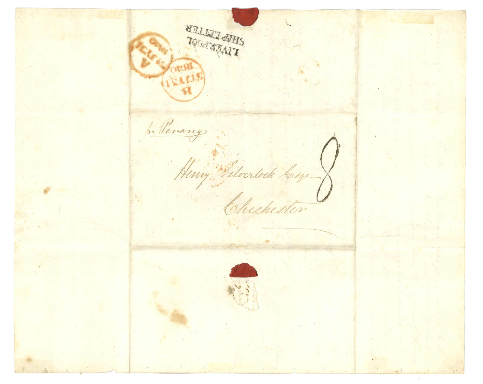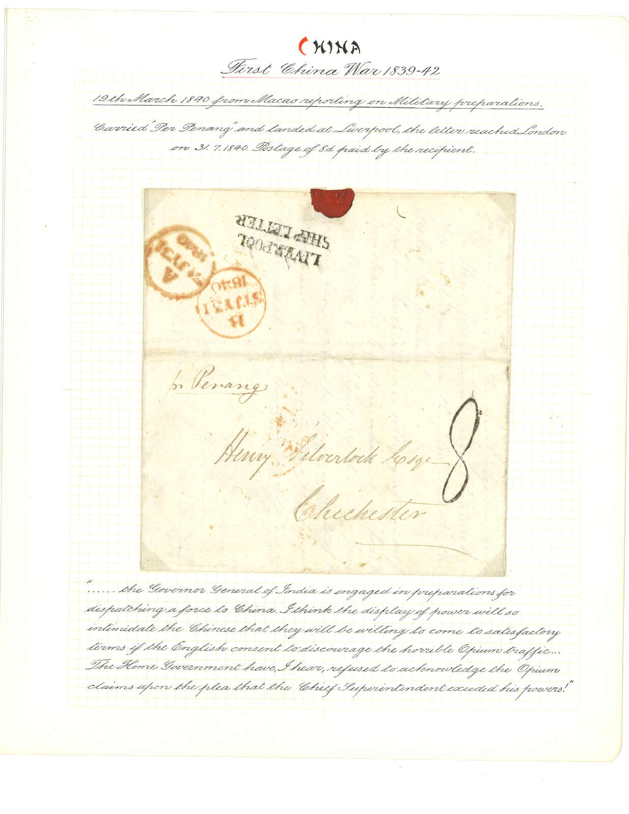 1716 image1840 (19 Mar) Macao to Chichester, England, J. Silverlock correspondence The letter referred to the British military reinforcement during the first few months in 1840 right after the First Battle of Chuenpi in Nov 1839. The letter content stated: “… we are still quietly residing at this place (Macao), and apparently shall continue free from Chinese annoyance till the existing difficulties are settled. By an opium clipper from Calcutta, we have news from England to the 4th November, but no letters for us, ours having unfortunately been sent via Bombay – it appears the Governor General of India is entirely engaged in making preparations for dispatching a force to China. It is to consist of three Steamers, and some men of war from the Indian station, also a military force is now held in readiness at Calcutta for immediate service. There are all to arrive here in May and we are also told by some parties that three ships of the line with their attendant frigates, etc were to be dispatched from England to meet the Indian force in the China seas.” Subsequent to the above, the British forces then formally launched strike to the North of the China after mobilizing its military base in India and Australia completed in May-June 1840. A good letter to have an account of the state of military affairs in early 1840. Ex Perical David Collection