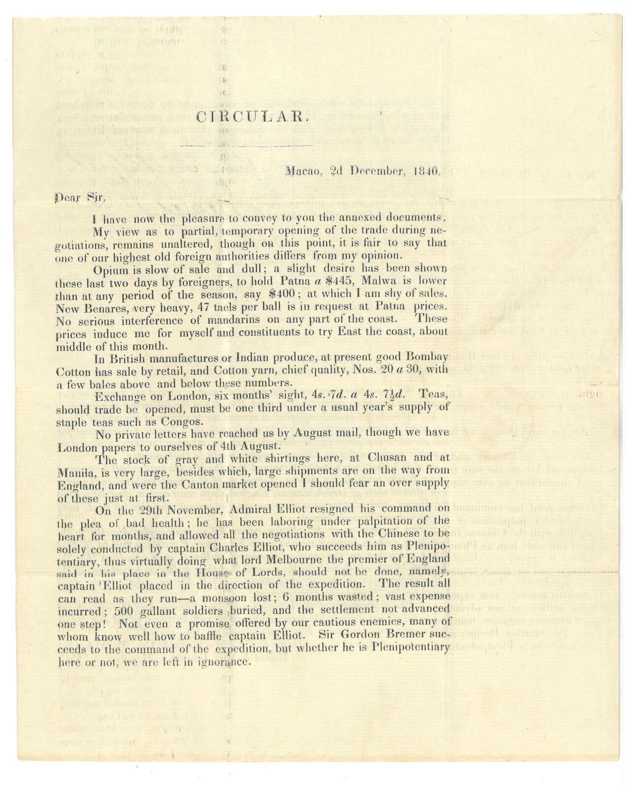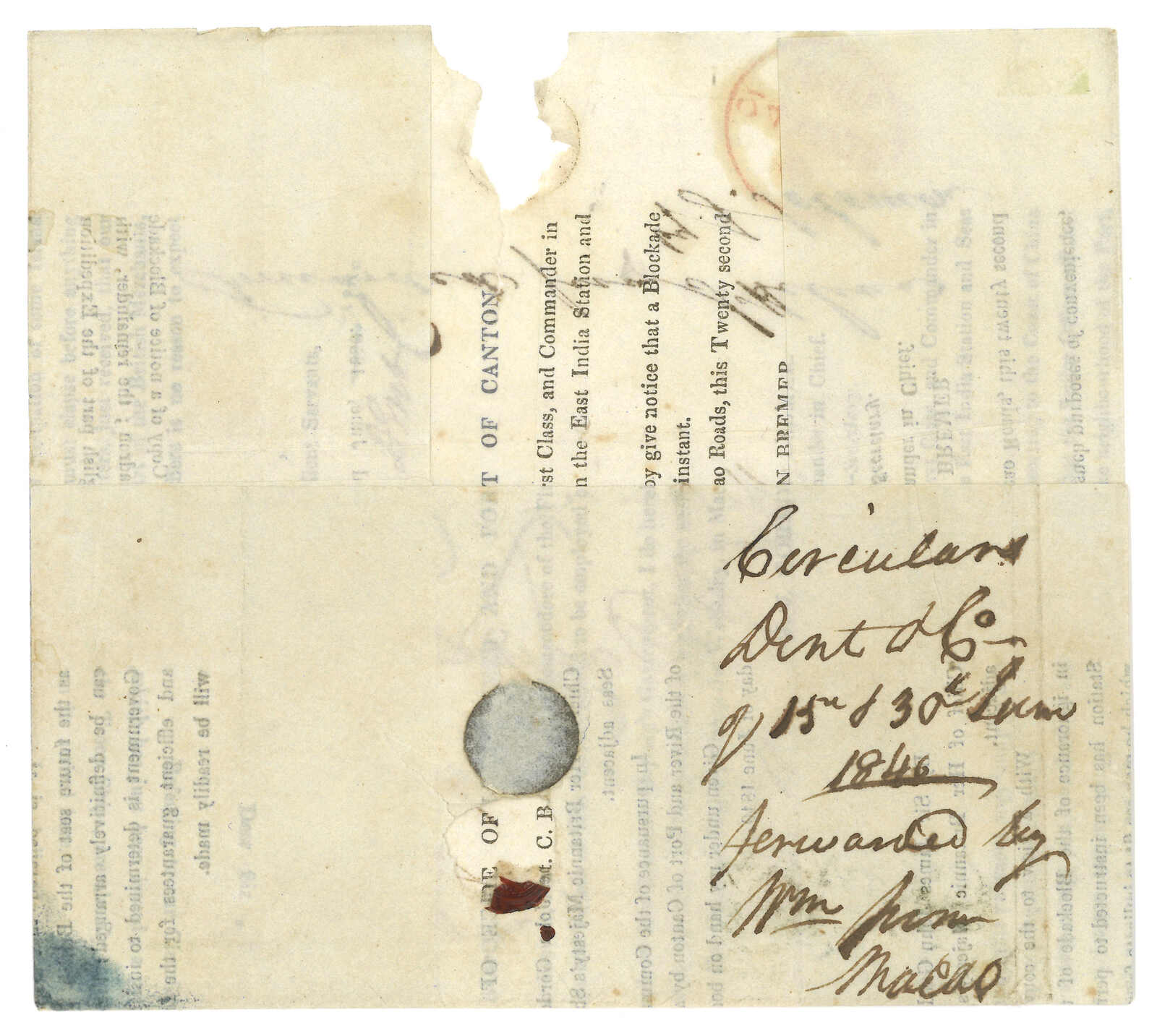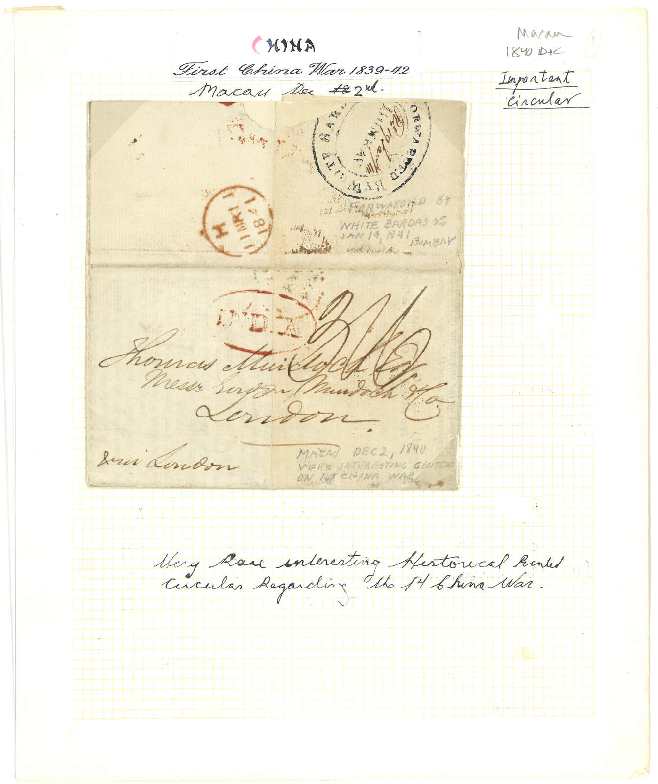 1840年11月鴉片戰爭期間英國全權代表更替之重要印刷通告 此通告於1840年12月2日在澳門印製,寄往倫敦,背面加蓋孟買轉遞商「WHITE BARDAS & CO. BOMBAY, 1841年1月19日」雙橢圓戳。 通告第七段記載,海軍少將喬治·懿律(George Elliot)因心臟病卸任返英,由堂弟查理·義律(Charles Elliot)接任全權代表。然查理·義律未能貫徹英國首相墨爾本勳爵之指令,數月後被亨利·璞鼎查爵士(Sir Henry Pottinger)取代,後者成為香港首任總督。 通告節錄: 「11月29日,懿律少將以健康為由辭職。其心疾纏身數月,對華談判全權委予查理·義律。此舉實違墨爾本勳爵之命——義律上尉竟主導遠征軍!結果顯而易見:季風時機盡失、六個月虛耗、鉅額軍費、五百勇士埋骨,而事態毫無進展!敵方深諳如何牽制義律。布雷默爵士接掌軍權,然是否兼任全權代表,我等仍蒙在鼓中。」 通告另附喬治·懿律於「HMS Melville」艦上回覆商團之信: 「關於舟山停戰協定,此僅限於該省總督轄區,不涉他處……本人深知商界焦慮,必儘早通報相關動向,然目前亦不悉中國政府意圖,惟望諸位無須久候。」(Image 1) (Image 2) (Image 3)