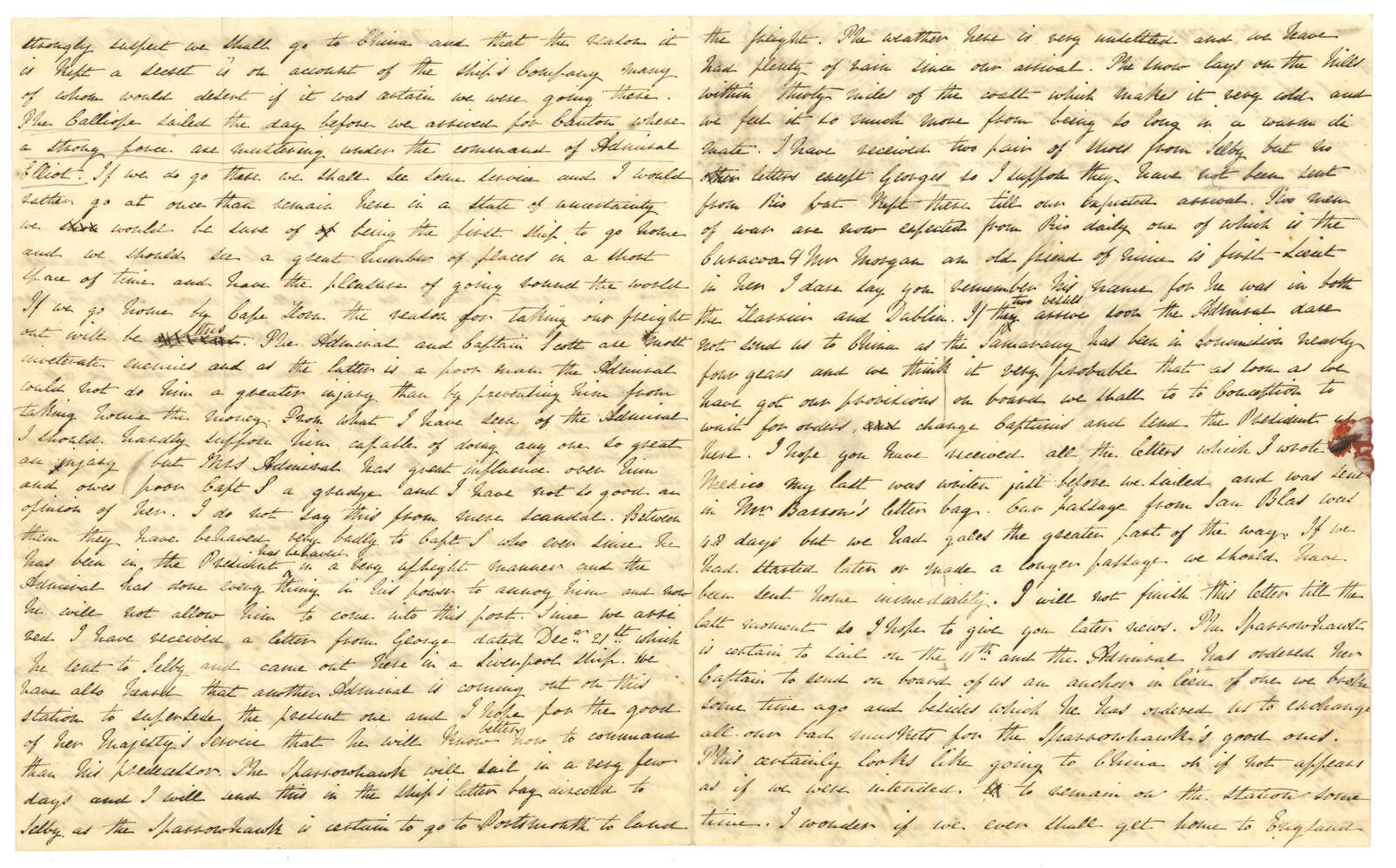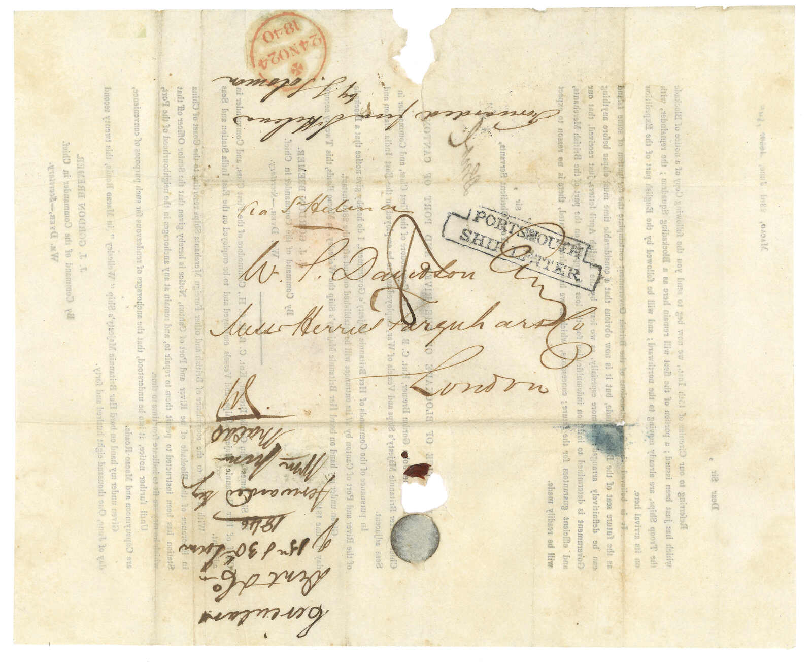 1840年7月8日於H.M.S. Samarang艦上 威廉·阿米蒂奇於英國皇家海軍”薩瑪朗號”戰艦致英國樸茨茅斯之完整信函。未付郵資標記”2/–”以黑墨書寫,地址欄加蓋橢圓形”INDIA”郵戳,封口處有倫敦到達戳(1840年10月)。 此信反映第一次鴉片戰爭爆發(1839年11月)後,英軍耗時半年調集亞太地區兵力之背景。作者對反覆無常的軍令提出質疑:「...海軍上將突然下令卸載所有貨物,緊急裝載八個月補給...準備直航中國參戰,次日卻撤銷命令,我等完全無法理解其意圖...『卡利歐佩號』於我艦抵達前一日駛離廣州,懿律少將正在該處集結大軍。」值得玩味的是,作者稱艦長詹姆斯·斯科特為「可憐人」。”薩瑪朗號”為皇家海軍28門炮柚木建造的阿索爾級六等艦。(Image 1) (Image 2) (Image 3) (Image 4) (Image 5) (Image 6) (Image 7)