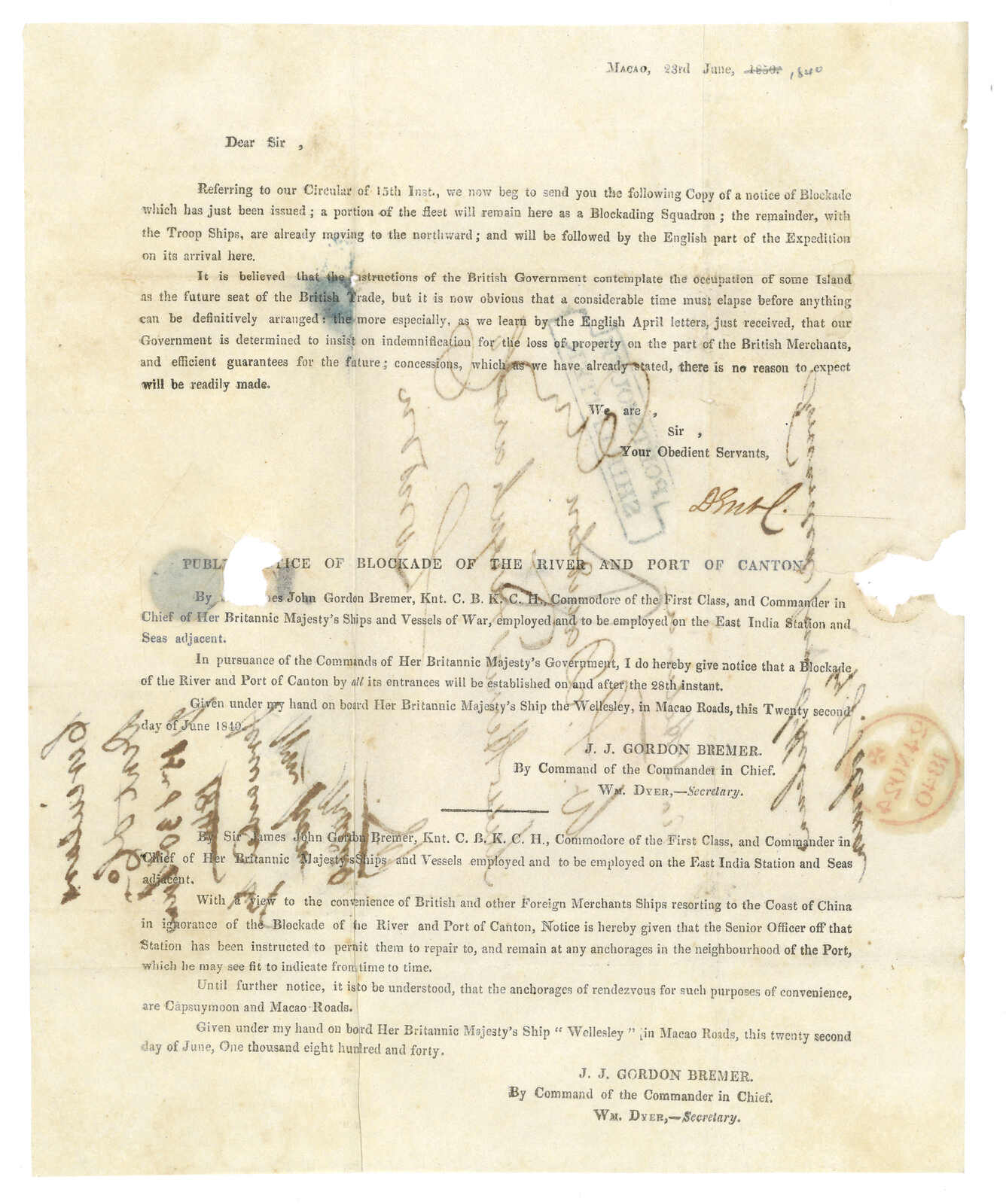 1717 image1840 (23 Jun) a very important printed letter from Dent & Co Macao, in which includes two blockade to Canton official circulars about “PUBLIC NOTICE OF BLOCKADE OF THE RIVER AND PORT OF CANTON”. The printed letter and public circulars are stated as follows: Referring to our Circular of 15th Inst. (i.e. last month), we now beg to send you the following Copy of a notice of Blockade which has just been issued; a portion of the fleet will remain here as a Blockading Squadron; the remainder, with the Troop Ships, are already moving to the northward; and will be followed by the English part of the Expedition on its arrival here …… It is believed that the instructions of the British Government contemplate the occupation of some Island as the future seat of the British Trade, but it is now obvious that a considerable time must elapse before anything can be definitively arranged: the more especially, as we learn by the English April letters, just received, that our Government is determined to insist on indemnification for the loss of properly on the part of the British Merchants, and efficient guarantees for the future; concession, which as we have already stated, there is no reason to expect will be readily made. PUBLIC NOTICE OF BLOCKADE OF THE RIVER AND PORT OF CANTON By [notices] John Gordon Bremer, Knt. C.B.K.C.H., Commodore of the First Class, and Commander in Chief of Her Britannic Majesty’s Ships and Vessels of War, employed and to be employed on the East India Station and Seas adjacent. In pursuance of the Commands of Her Britannic Majesty’s Government, I do hereby give notice that a Blockade of the River and Port of Canton by all its entrances will be established on and after the 28th instant (i.e. the same month in June). Given under my hand on board Her Britannic Majesty’s Ship the Wellesley, in Macao Roads, this Twenty second day of June 1840. J.J. GORDON BREMER By Command of the Commander in Chief. Wm. DYER,– Secretary ============================================== By Sir James John Gordon Bremer, Knt. C.B.K.C.H. Commodore of the First Class, and Commander in Chief of Her Britannic Majesty’s Ships and Vessels employed and to be employed on the East India Station and Seas adjacent. With a view to the convenience of British and other Foreign Merchants Ships resorting to the Coast of China in ignorance of the Blockade of the River and Port of Canton, Notice is hereby given that the Senior Officer off that Station has been instructed to permit them to repair to, and remain at any anchorages in the neighbourhood of the Port, which he may see fit to indicate from time to time. Until further notice, it is to be understood, that the anchorages of rendezvous for such purposes of convenience, are Capsuymoon and Macao Roads. Given under hand on board Her Britannic Majesty’s “ Wellesley ” in Macao Roads, this twenty second day of June, One thousand eight hundred and forty. J.J. GORDON BREMER By Command of the Commander in Chief. Wm. DYER,– Secretary Ex Percival David Collection