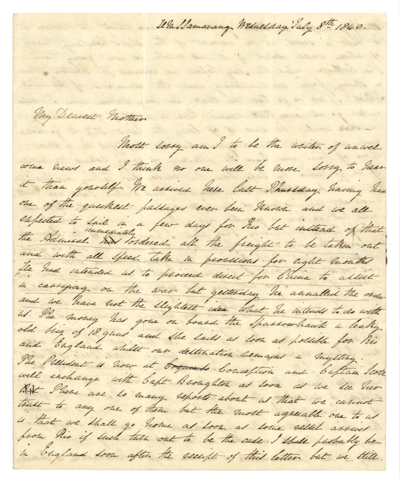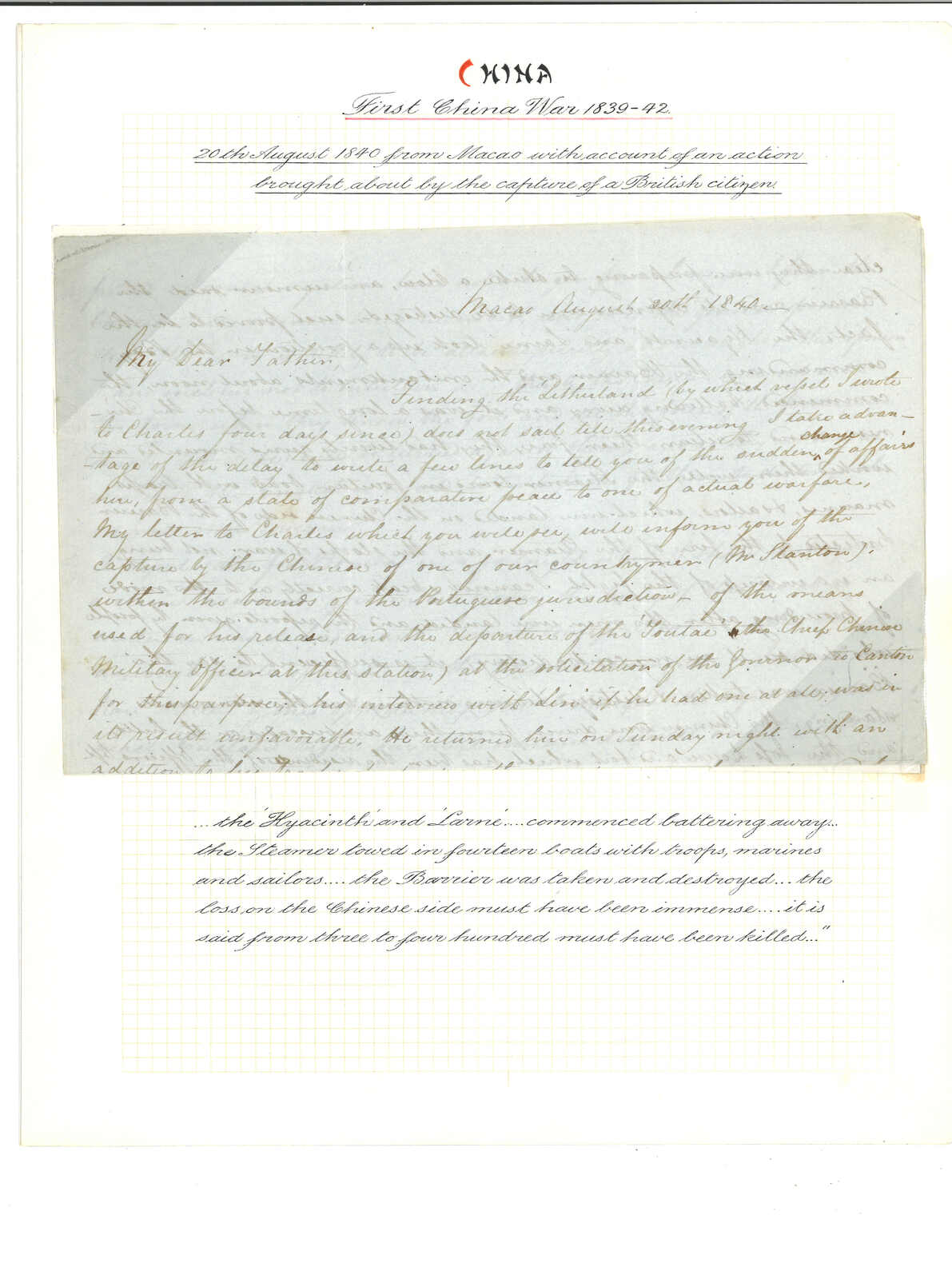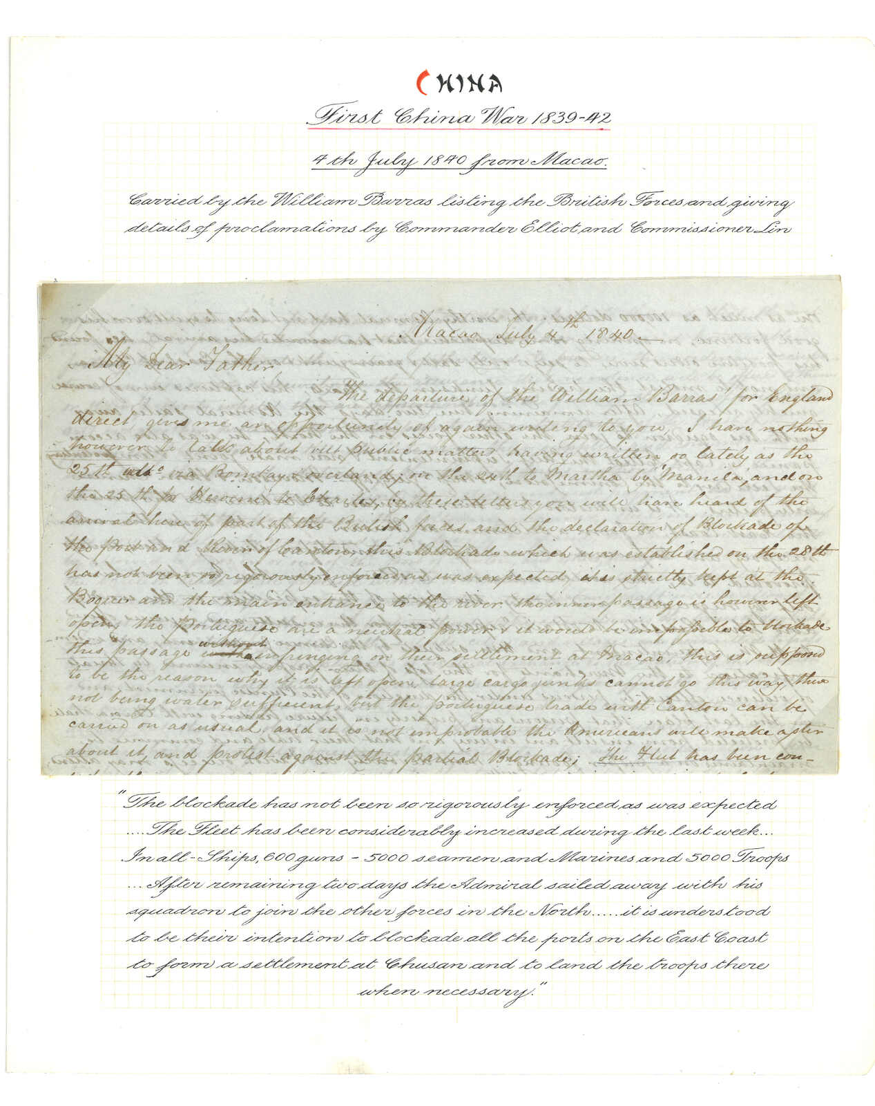 1718 cover image1840 (4 Jul) J. Silverlock Letter Sheet from Macao When the First Opium War broke out, the Royal Navy ships HMS Volage and HMS Hyacinth were the only two stationed in China seas. British forces have decided to mobilize its forces around APAC region mainly including India, Australia and New Zealand in preparation to make aggression into China. This military reinforcement was basically completed in July 1840. The Letter herein provided a very detailed account of the military mobilization actions, stating the following: “The fleet has been considerably increased during the last week, the following is a list of the force now in the Chinese waters – H.M.S. ‘Melville’ 74 guns, Flag Admiral Elliot ‘Wellesley’ 72, ‘Druid’ 44, ‘Blonde’ 42, ‘Alligator’ 28. ‘Conway’28, ‘Volage’ 28, ‘’Alligator’ 28, ‘Conway’28, ‘Larna’ 20, ‘Pylades’ 18, ‘’Hyacinth’ 18, ‘Cruizon’ 16, Algerine’ 10, ‘Rattlesnake’; Troop Ship, H.C. Steamers – ‘Atalanta’, ‘Madagascan’, ‘Enterprise’, ‘Queen’. Troops H.M.’s 18th Royal Irish, 26th Comeronian (Regiment of Foot) & 49th Regiments. Bengal Volunteers 1000 strong, Madras artillery sappeas and miners about a Regiment Colonel Burrull Commissioner of the land forces. In all, Ships 600 guns, 5000 seamen and marines, and 5000 troops exclusion of steamers, thus are doubly manned and each carries a long destructive gun at the bows with one or two others at the steam with artillerymen to work them, the vessels expected and known to have sailed for China are the ‘Blenheim’ 74, ‘Pigus’ 44, ‘Inconstant’ 44. Two Brigs 18 guns each. Steamer ‘Scootris’ expected but uncertain; the Brazil squadron is said to be coming on, also other ships and steamers from England but we have no positive knowledge of these.” A fascinating account of the state of military reinforcement to the preparation of launching large formal attack to China after the outbreak of the First Opium War. Interestingly, you will see the British government is very determined to push it forward by even attempting to mobilize Brazil Squadron to Far East. From the letter content, we may see a strong fleet of major naval H.M.S. and various ground troops coming together to China. Ex Perical David Collection
