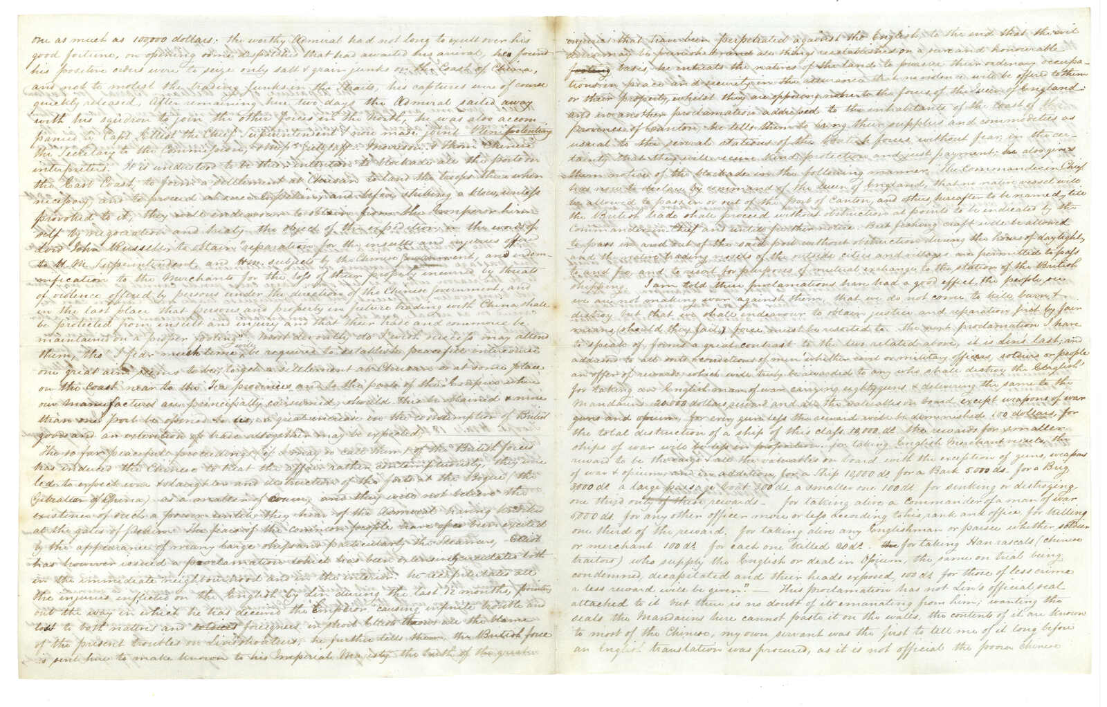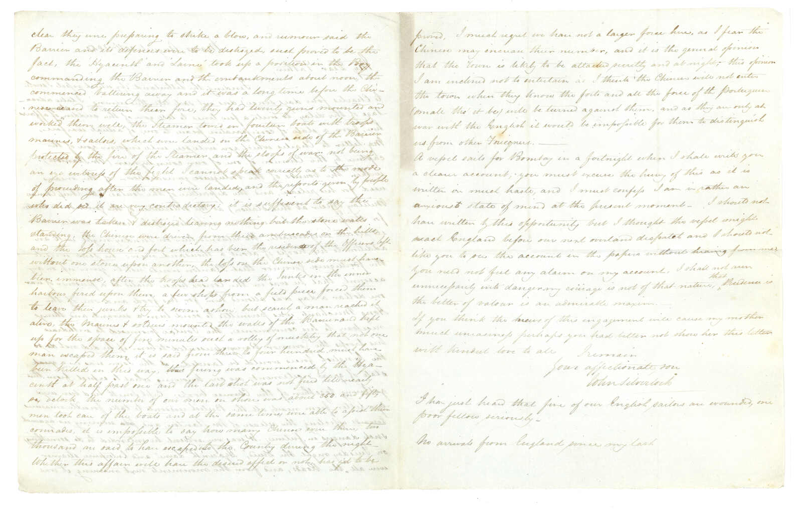 1840年8月20日澳門蕭發樂重要通信——英軍完成增兵並對清廷發動猛攻六月底,英軍完成兵力增援。英國海軍於7月5日發動猛烈炮擊,迅速佔領定海港。其後遠征軍分兵兩路:一支艦隊南下珠江,另一支北上黃海。本函件詳述南下艦隊如何奪取珠江口及穿鼻附近港口的經過,凸顯珠江三角洲作為中國南大門的戰略價值。 信件內容:「……在總督要求下,當地清軍最高指揮官『都台』[註1]移師廣州,其與林則徐會面(若確有會晤)結果不利……『都台』承諾撤軍,但言明若未履約,英軍將強行登陸。全城氣氛緊張,無人知曉清軍集結意欲何為……」 「史密斯艦長接獲全體英僑聯署信,要求武力解救斯坦頓先生並保障未來安全。週二夜間,『德魯伊號』、『風信子號』、『拉納號』與『企業號』蒸汽艦齊集錨地,翌晨動向已顯露攻擊意圖。傳聞英軍將摧毀橫檔砲台防線,後證屬實。『風信子號』與『拉納號』佔據控制砲台及堤岸的灣區陣位,正午開始炮擊。清軍二十門岸防炮頑強還擊良久,蒸汽艦拖帶十四艘載有陸戰隊及水兵的舢板,在艦炮掩護下於砲台清軍側登陸……」 [註1] 按清朝滿洲慣例,「都台」為「都統」或「提督」之舊式音譯(關天培時任廣東水師提督)。 [來源:珀西瓦爾·大維德爵士珍藏](Image 1) (Image 2) (Image 3)