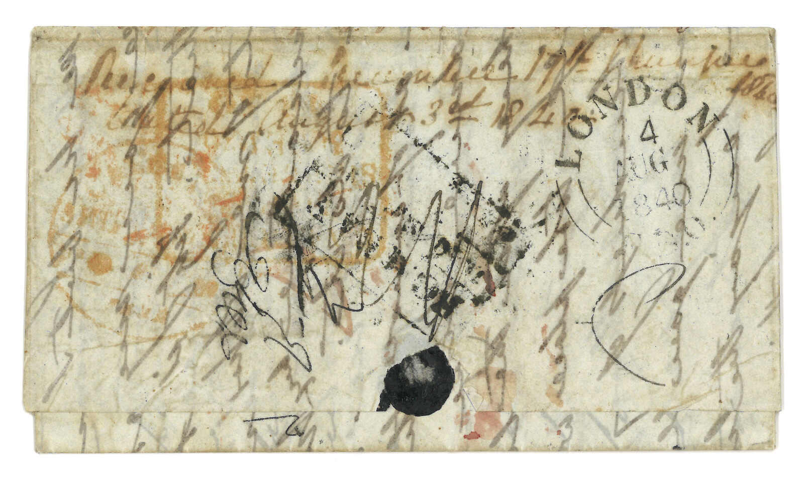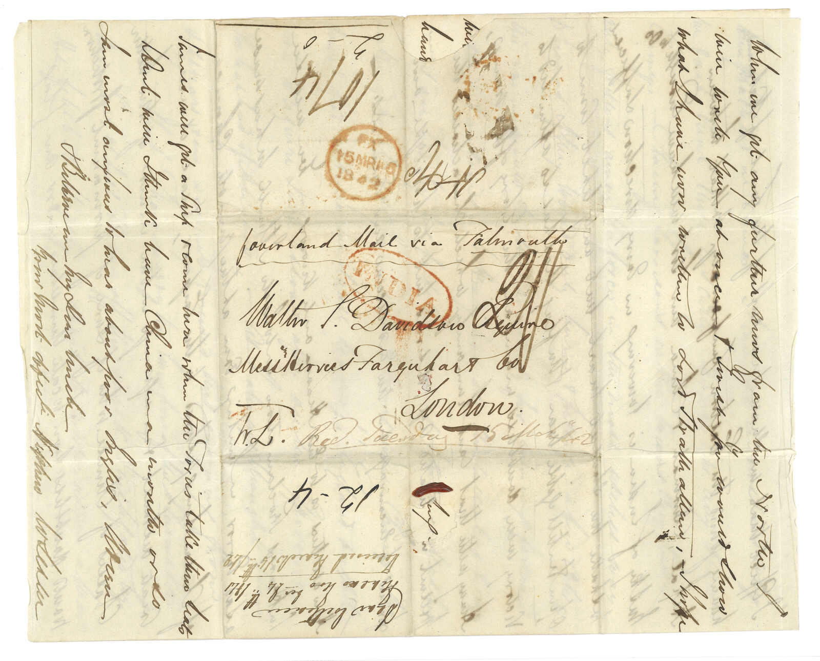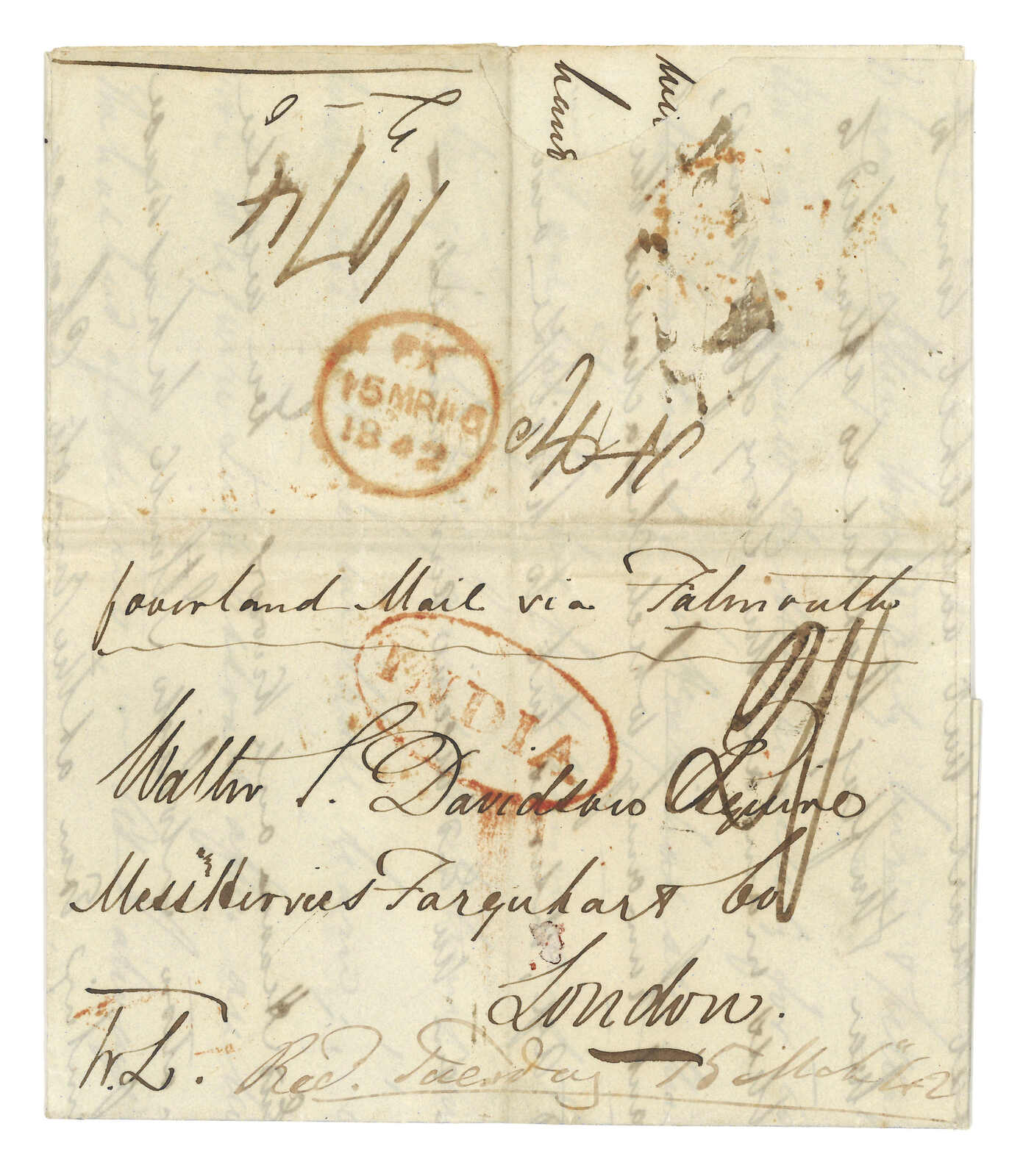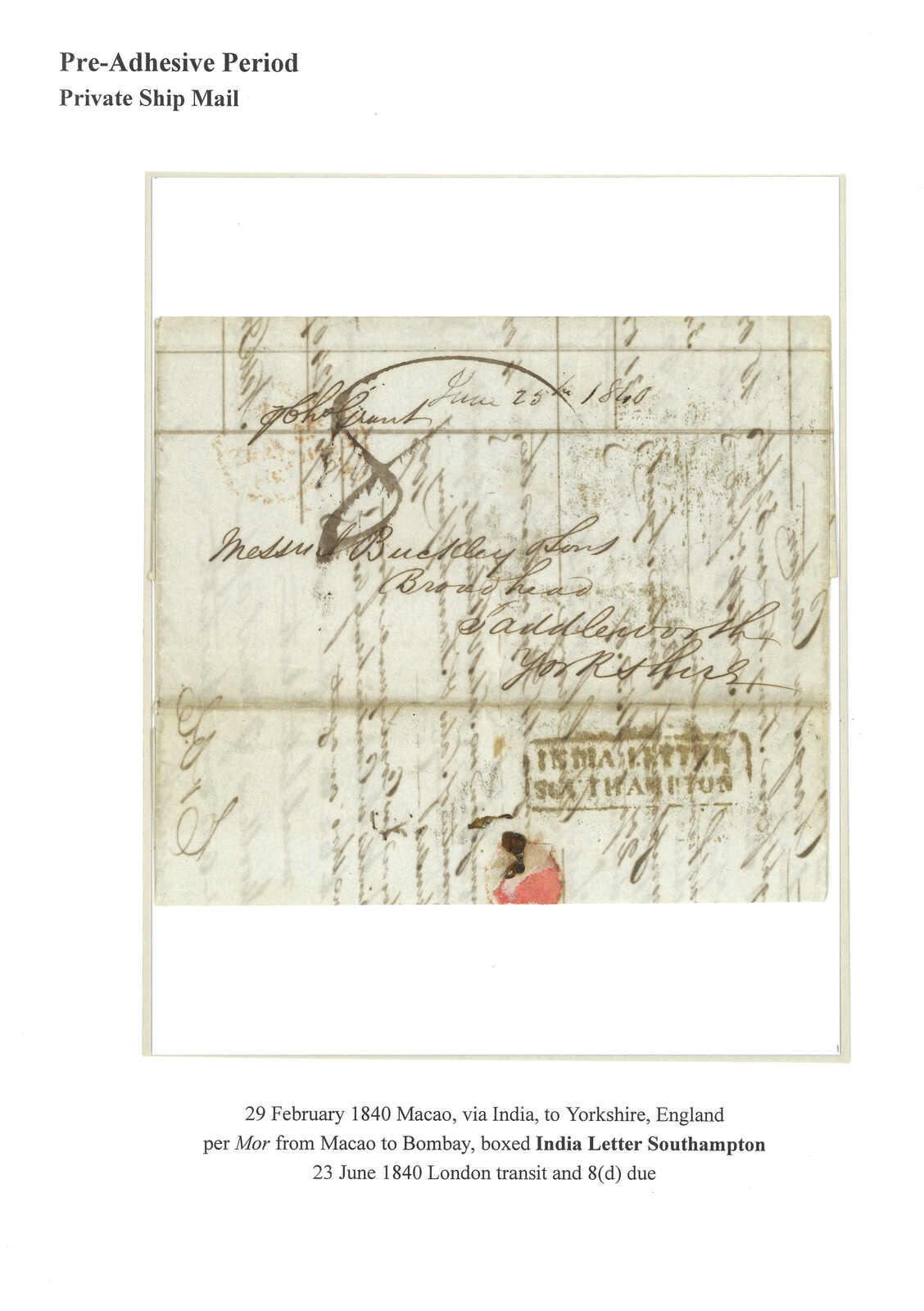 1840年7月29日澳門寄往英國約克郡信函,加蓋”INDIA LETTER / SOUTHAMPTON”方框戳,經”Mor.”號船運送,收件人支付8便士郵資。內容提及戰爭期間持續的茶葉貿易:29箱工夫茶(“Harburger”號承運)與14.5箱屯溪綠茶(“Earl Balcarras”號承運)。按1840年新郵政費率,中印船郵統一收取8便士,故雖從澳門寄出仍加蓋印度船郵戳記。(Image 1) (Image 2) (Image 3) (Image 4)