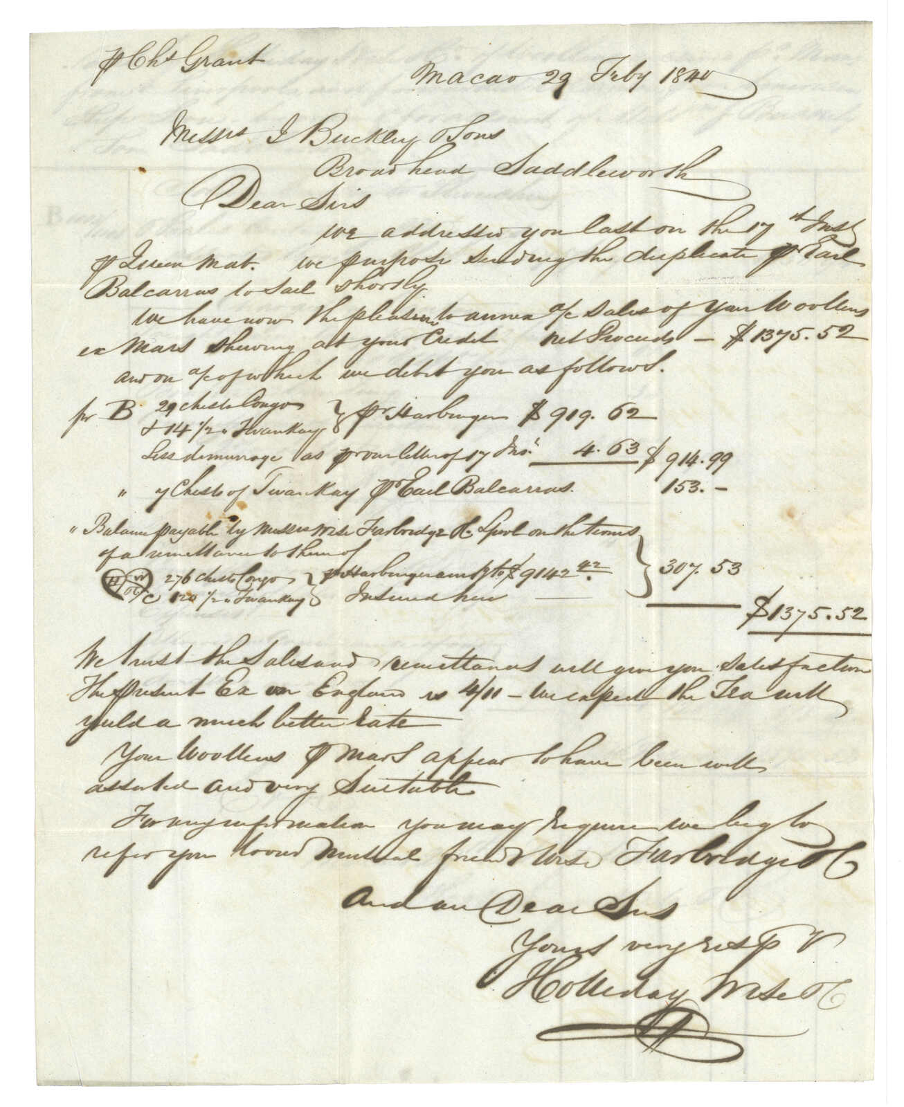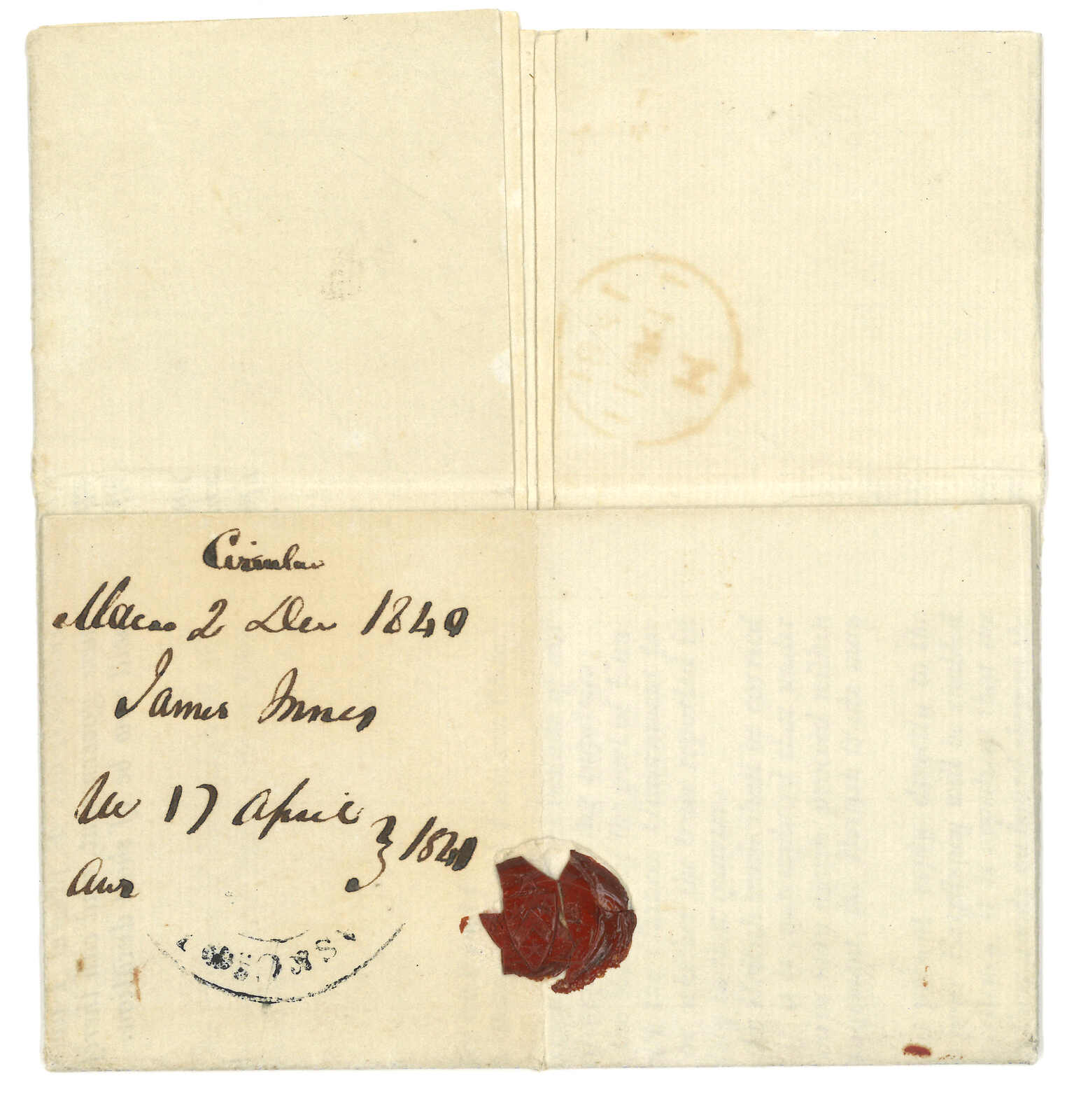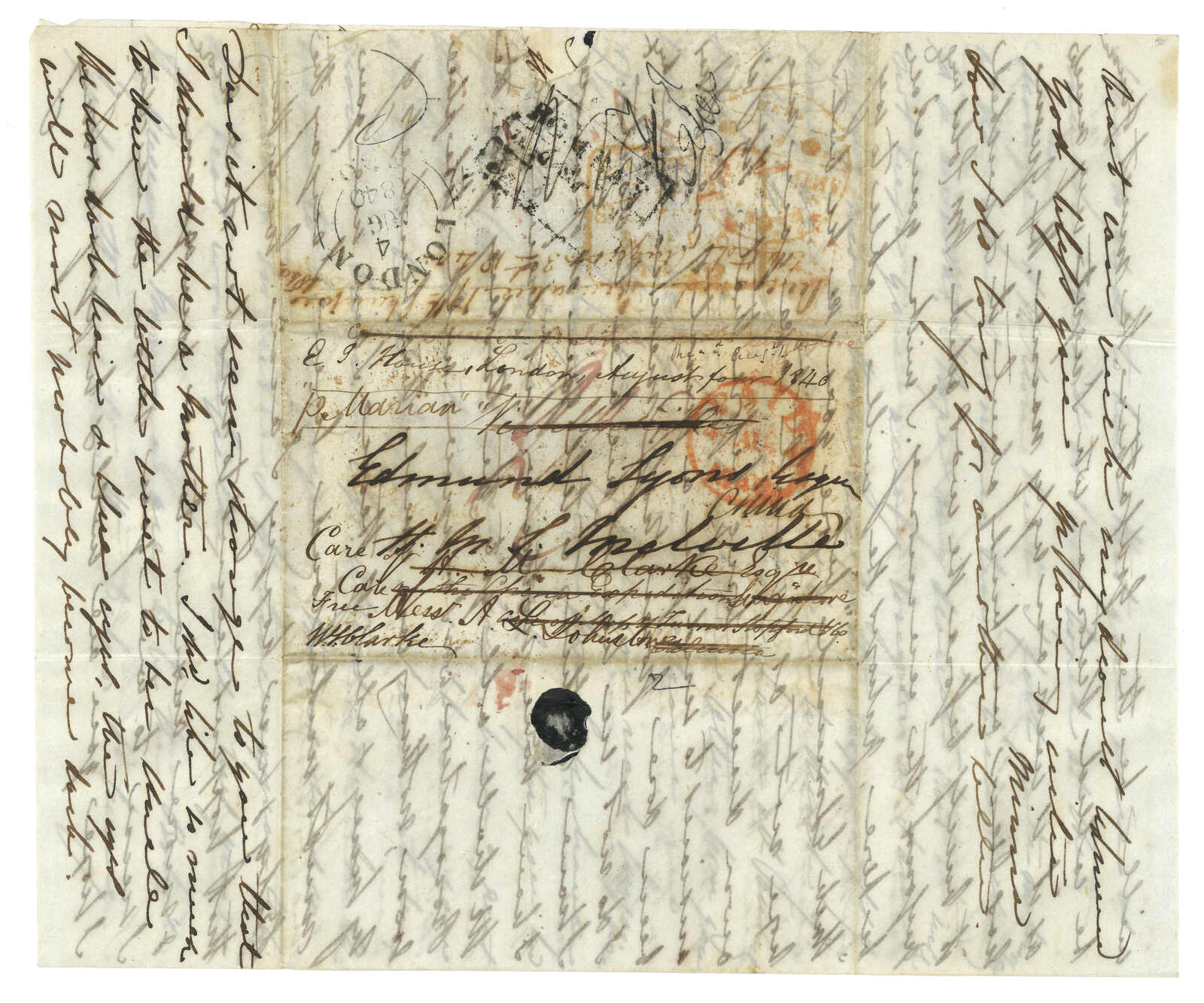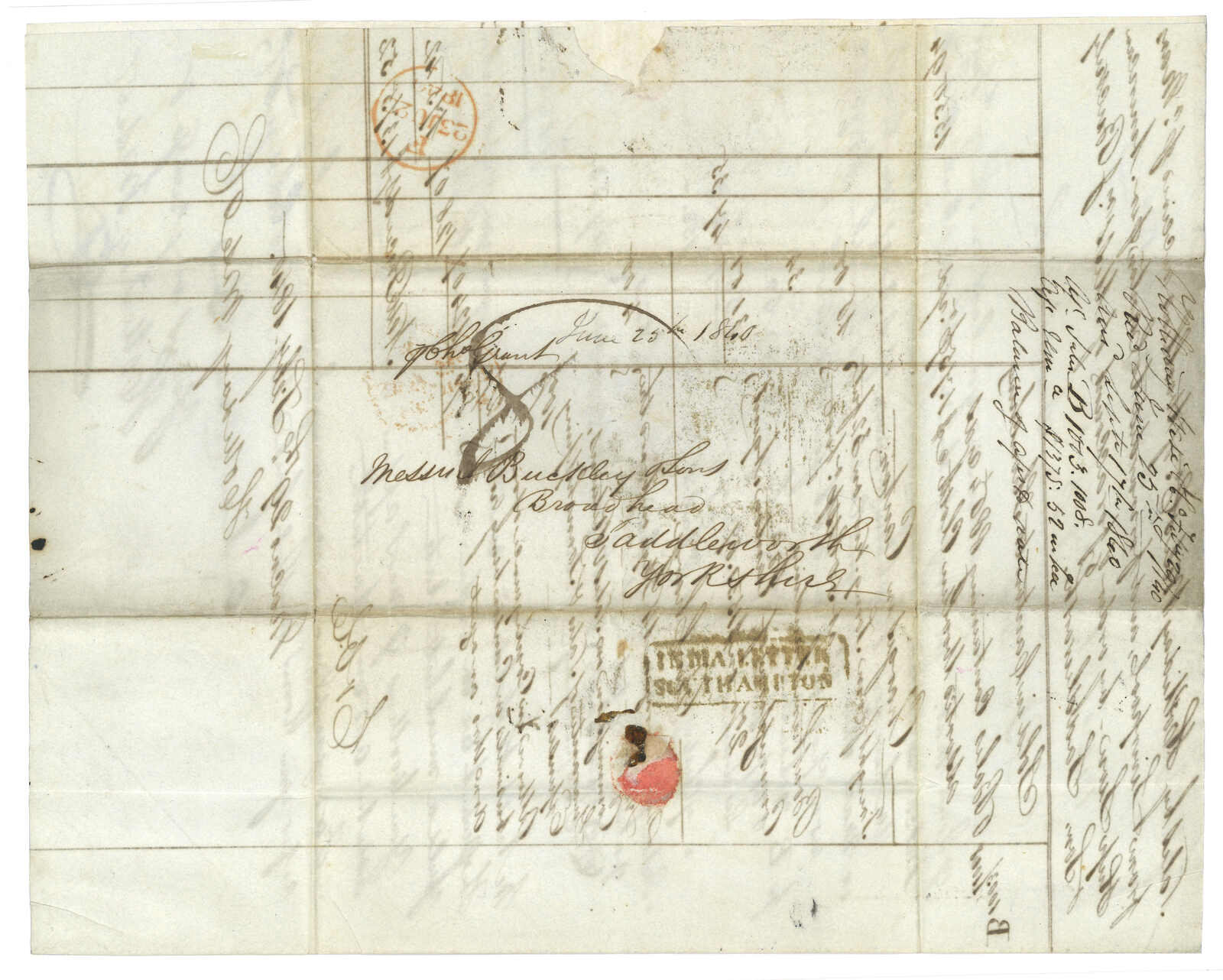 1840年7月29日澳門寄往英國約克郡信函,加蓋”INDIA LETTER / SOUTHAMPTON”方框戳,經”Mor.”號船運送,收件人支付8便士郵資。內容提及戰爭期間持續的茶葉貿易:29箱工夫茶(“Harburger”號承運)與14.5箱屯溪綠茶(“Earl Balcarras”號承運)。按1840年新郵政費率,中印船郵統一收取8便士,故雖從澳門寄出仍加蓋印度船郵戳記。(Image 1) (Image 2) (Image 3) (Image 4)