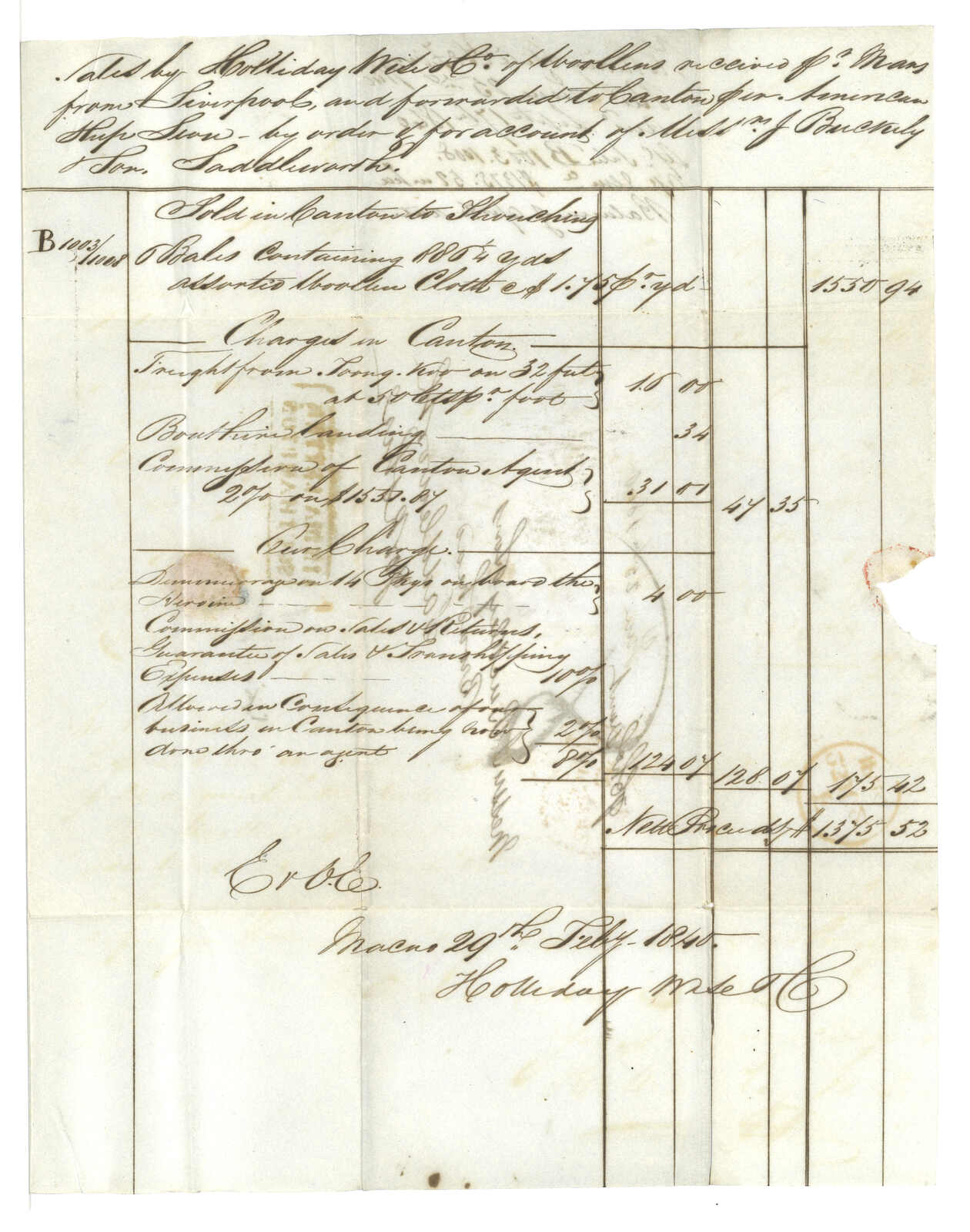 1720 image1840 (29 Jul) Macao Letter sent to Yorkshire, England during the beginning of the First Opium War. Boxed handstamp of “INDIA LETTER / SOUTHAMPTON”, carried by vessel Mor., with rate mark of “8” charged 8p to the recipient. The letter mentioned the trade of tea including the export of 29 chests Congo (per ship Harburger) and 14.5 chests TwanKay (per ship Earl Balcarras). Despite some interruptions and trade barriers occurred over the height time of the First Opium War period, the trade and export actually continued at the time. Congo was obviously more expensive than TwanKay. Congo was an anglicized version of the Chinese工夫茶 (gōngfu chá). TwanKay was a type of green tea, which the name is derived from a transliteration of Tunxi (屯溪), a tea-trading town in Anhui province. 8p was a standard rate charged to ship letters from both India and China, and the rate was changed from Jan 1840. Therefore, it explained even the letter sent from Macao, China, it carried an INDIA Ship Letter handstamp.