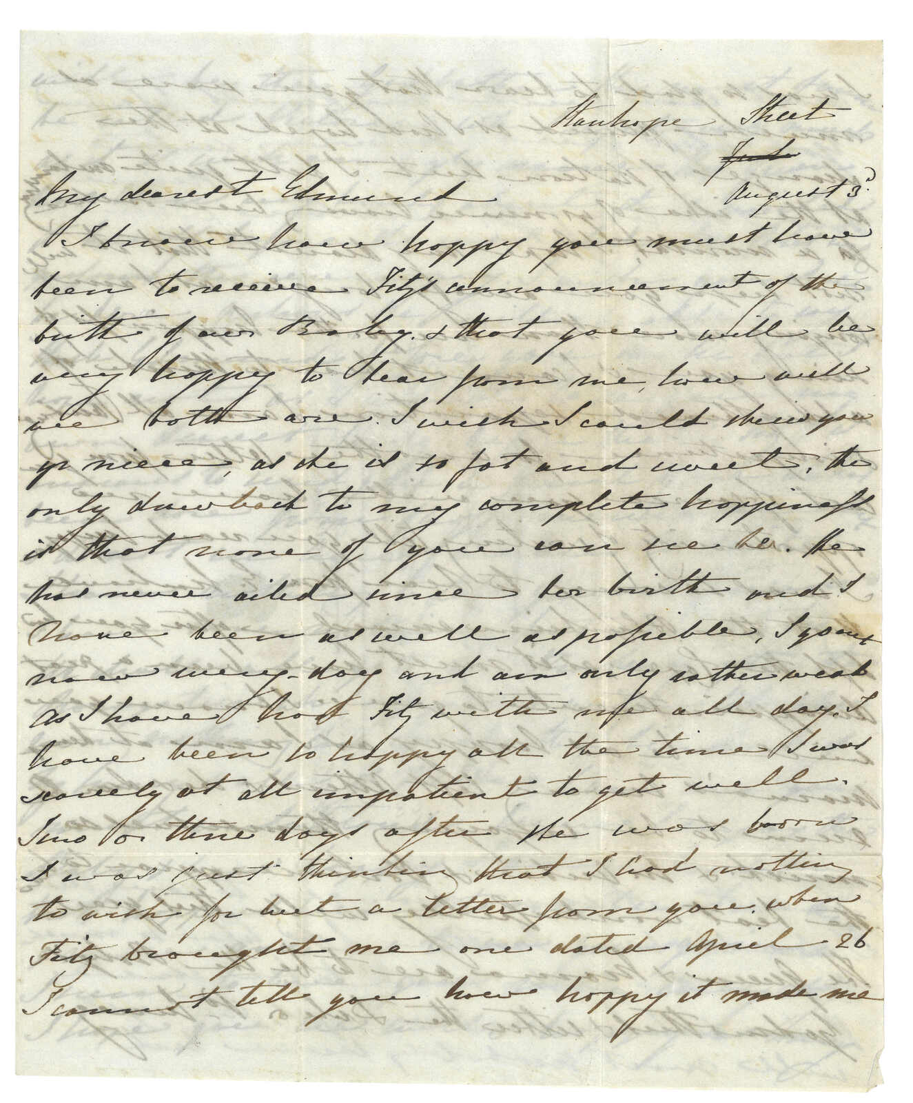 1840年8月3日倫敦致H.M.S. Melville艦埃德蒙·莫布雷·萊昂斯信函 經”瑪麗安號”寄遞,粉紅墨標註”2/–”郵資及”PAID”戳記,原寄孟買後改道印度加爾各答轉遞中國。 封口處清晰手書「1840年12月19日於穿鼻收訖」。74門炮三等戰列艦”梅爾維爾號”於1840年12月在穿鼻附近海域執行任務。此為萊昂斯家族報喜信,透露新生姪女將由維多利亞女王擔任教母並命名為維多利亞。埃德蒙·莫布雷·萊昂斯為埃德蒙·萊昂斯海軍上將次子,1841年參與虎門戰役與廣州戰役後晉升中尉。信中另含鴉片戰爭局勢與地緣政治評述。[來源:珀西瓦爾·大維德爵士珍藏](Image 1) (Image 2) (Image 3) (Image 4)