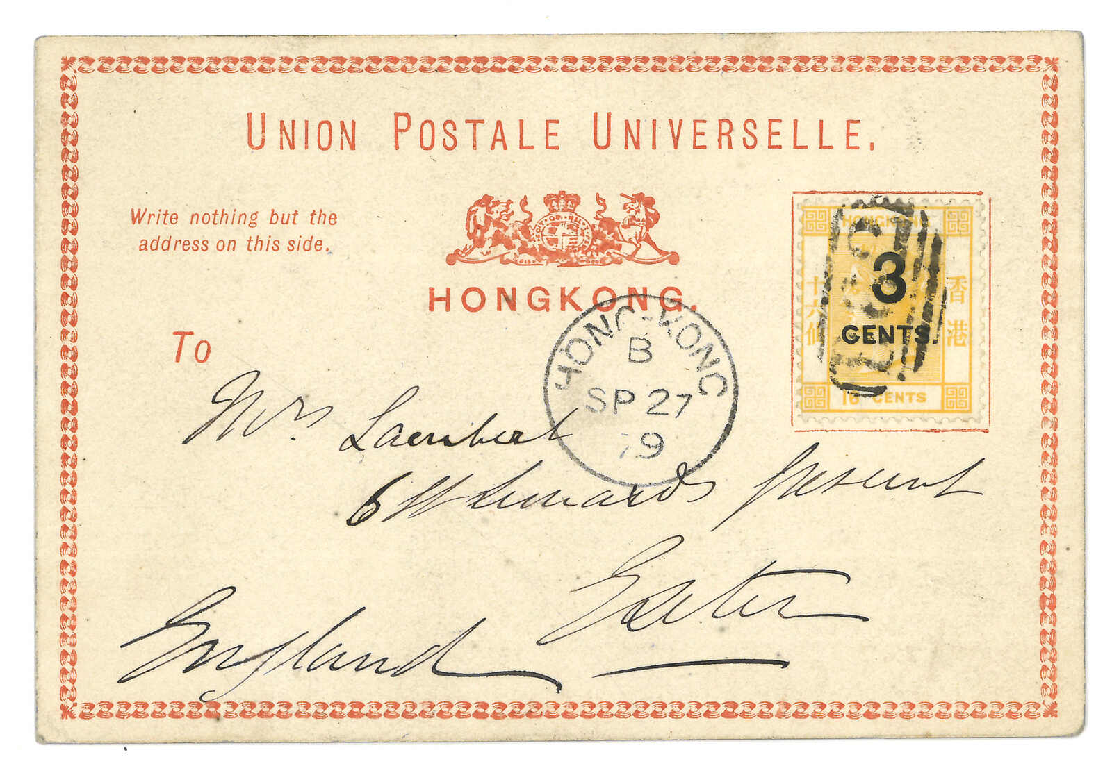 1879年香港明信片貼維多利亞女皇像3仙蓋5仙蓋18仙(楊目P3),未使用,品相上佳。香港郵資片之一大名譽品。目錄價55000元。(Image 1)