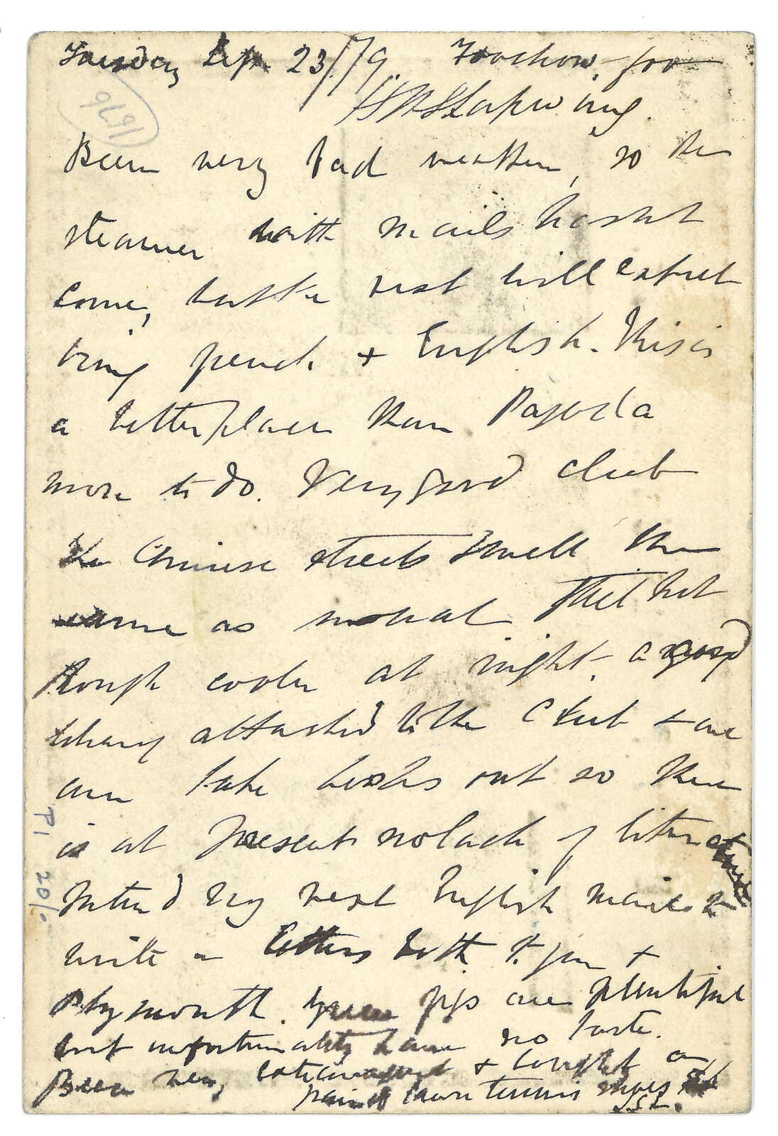 1879.9.27 香港明信片貼維多利亞女皇像3仙蓋16仙票(白卡紅字;楊目P1a)寄英國。鈐B62殺手戳,旁鈐香港B字日戳。背面帶粘痕。(Image 1)