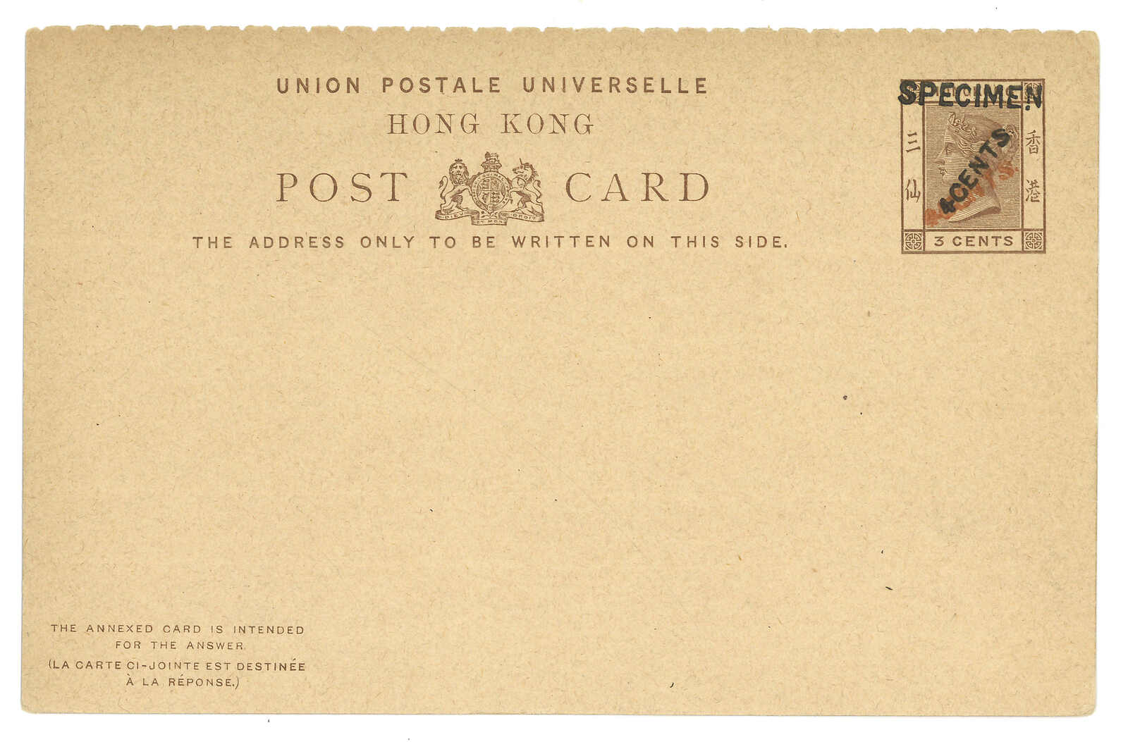 1900年香港維多利亞女皇像改值黑字4仙蓋紅字4仙蓋3仙郵資片樣片(楊目P15)。品相上佳。目錄價4000元。(Image 1)