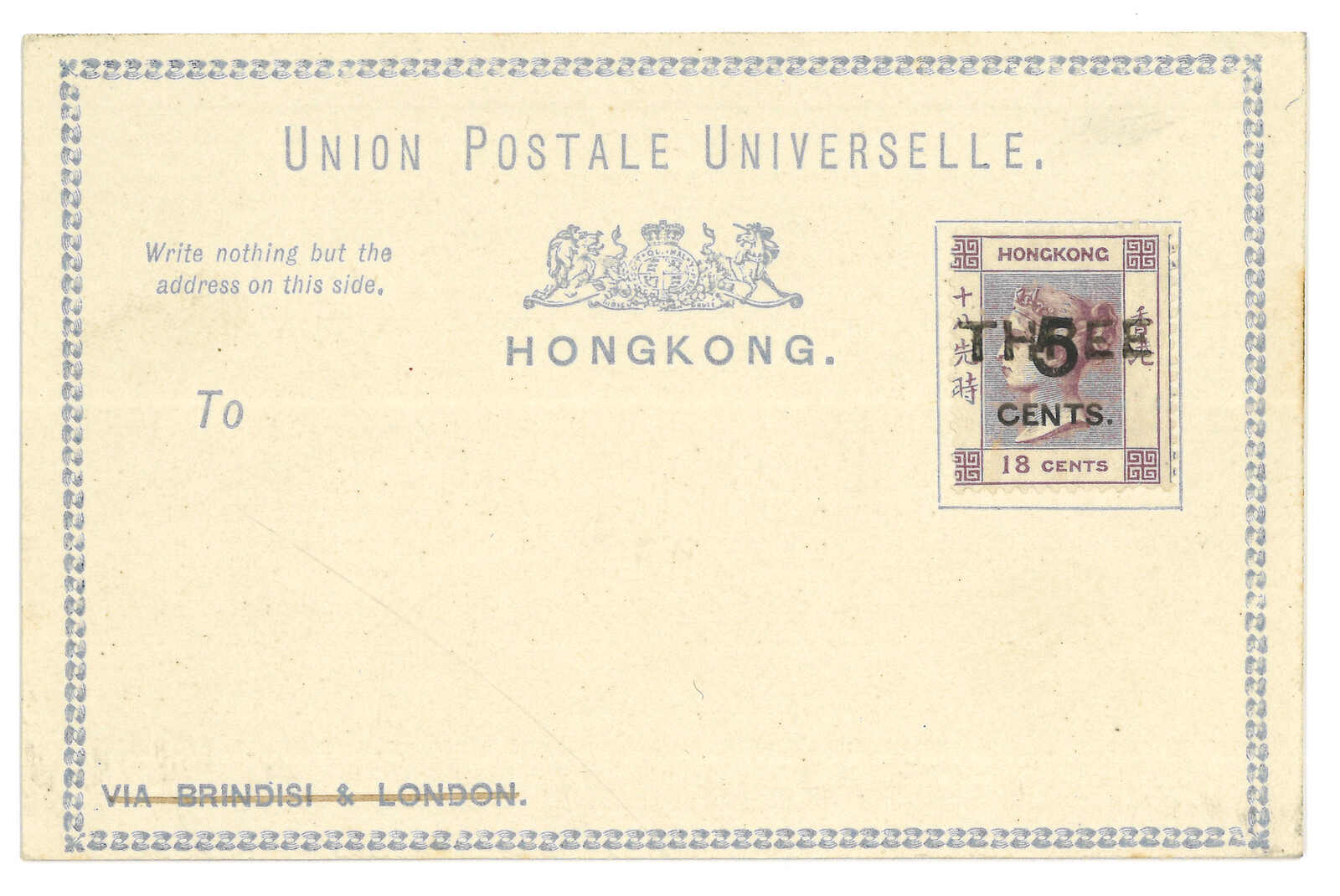 1879 Hong Kong formular card f.w. QV surch 3c/5c/18c (Yang P3). Unused. Very Fine. Catalogue price $55000. Rarity of Hong Kong postal stationery.