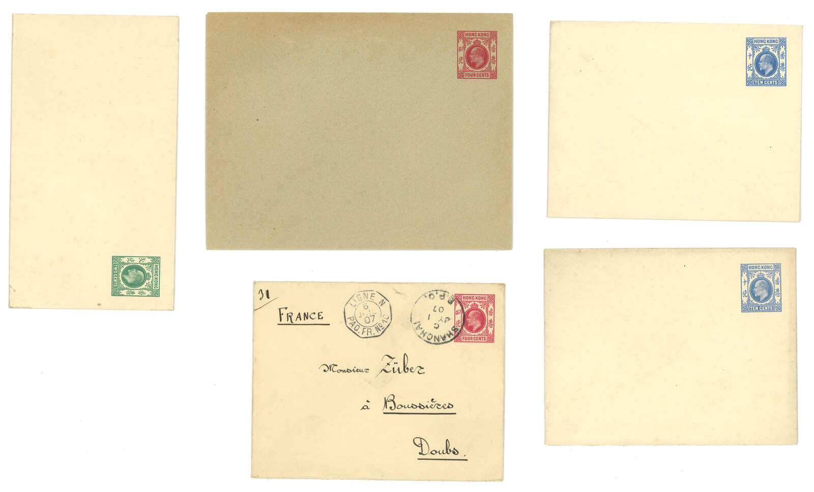 1902年一組五件香港愛德華七世郵資封,包括2仙(3-1/8 x 5-1/2吋,楊目EN10)、4仙(3-3/4 x 4-3/4吋,EN13)、10仙2件(3-3/4 x 4-3/4吋,EN15)及4仙(4-3/8 x 5-1/2吋,EN18)。當中一件4仙封自上海英局實寄,餘未使用。(Image 1)