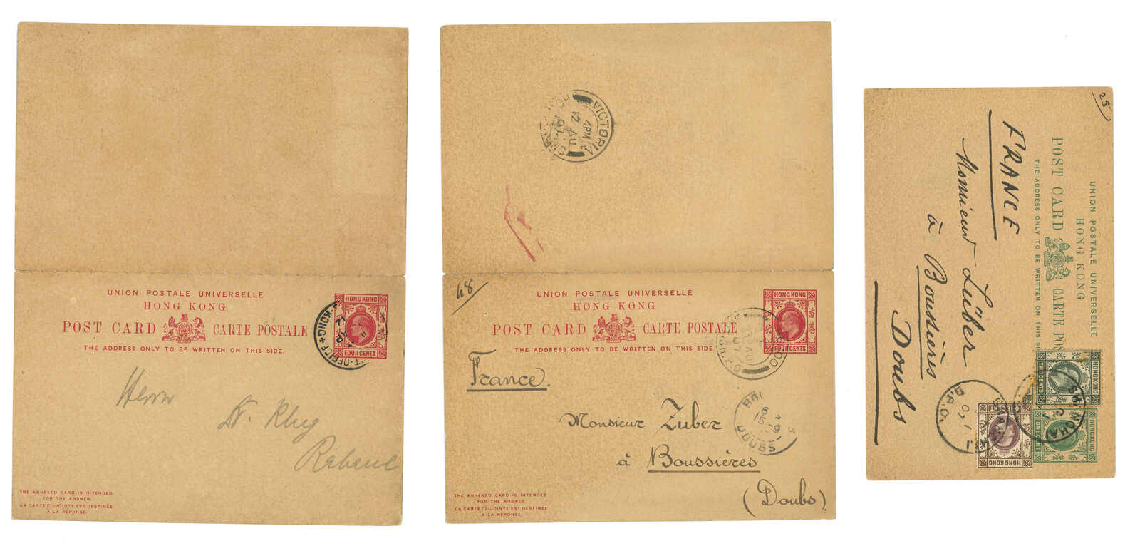 1903至1909年一組三件香港愛德華七世郵資片,包括1仙(楊目P19)、4仙單片(楊目P22)及4仙雙片(楊目P23),分別自香港、煙台及上海英國客郵局實寄。(Image 1)